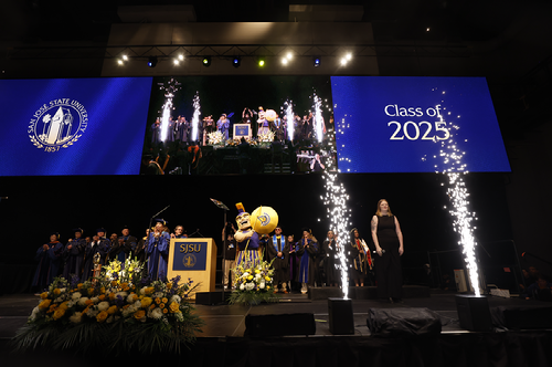 An ornamental staff or scepter, the mace is carried by officials as part of formal parliamentary or academic ceremonies. A gift from the Tower Foundation of SJSU, the university’s ceremonial mace was designed and created by Art and Art History Lecturer Yvonne Escalante, ’13 MFA Spatial Arts. She found inspiration for the design in both SJSU history and the paths students take to reach graduation.
