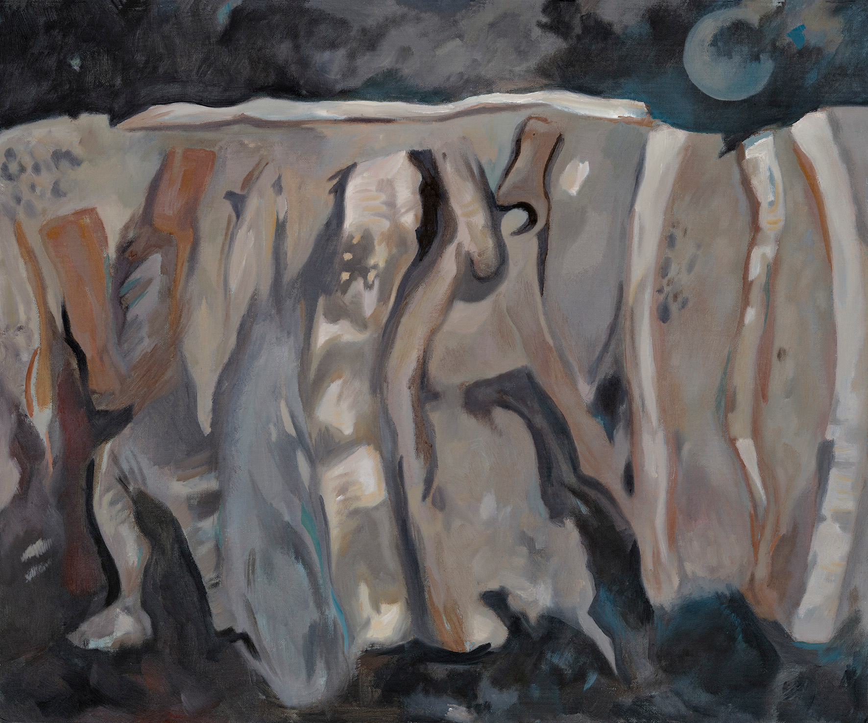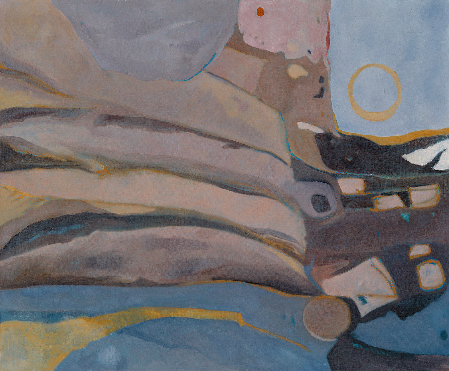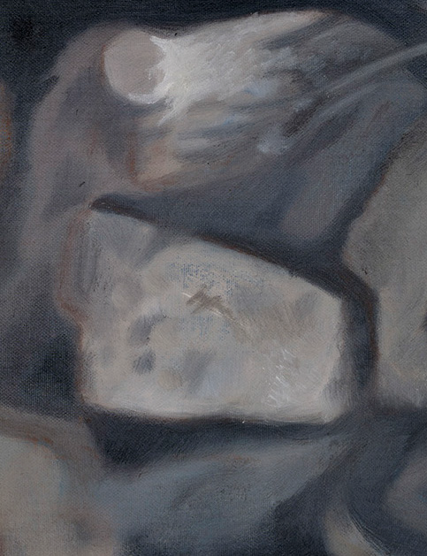I began those views down onto the turf and timber in plan. I prepared a canvas with a layer of blue acrylic paint, as a base onto which to lay the subtle brown hues. I sketched out the edges of the area, then the forms of the turves. As they appeared, oily marks in silhouette, they took on a new kind of abstraction, a new energy and sense of time somehow. I started light with the whites and pale yellows, which formed floating forms in the blue, like icebergs breaking loose on the floe. With the greys and ochres the painting felt more grounded. Slowly it built, deepening and settling. I loved the way the oils allowed subtle merging of colours; small glimpses of something else. The end result feels somehow ghostly, in transition. And that feels right for these lumps of earth, set there by people long gone.