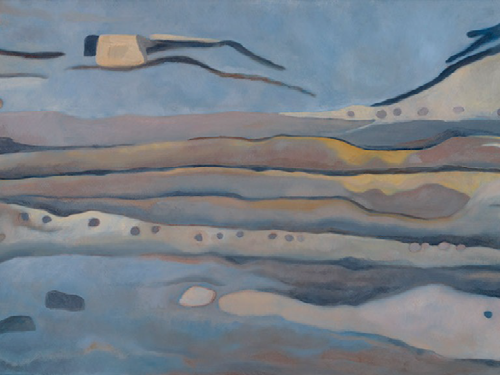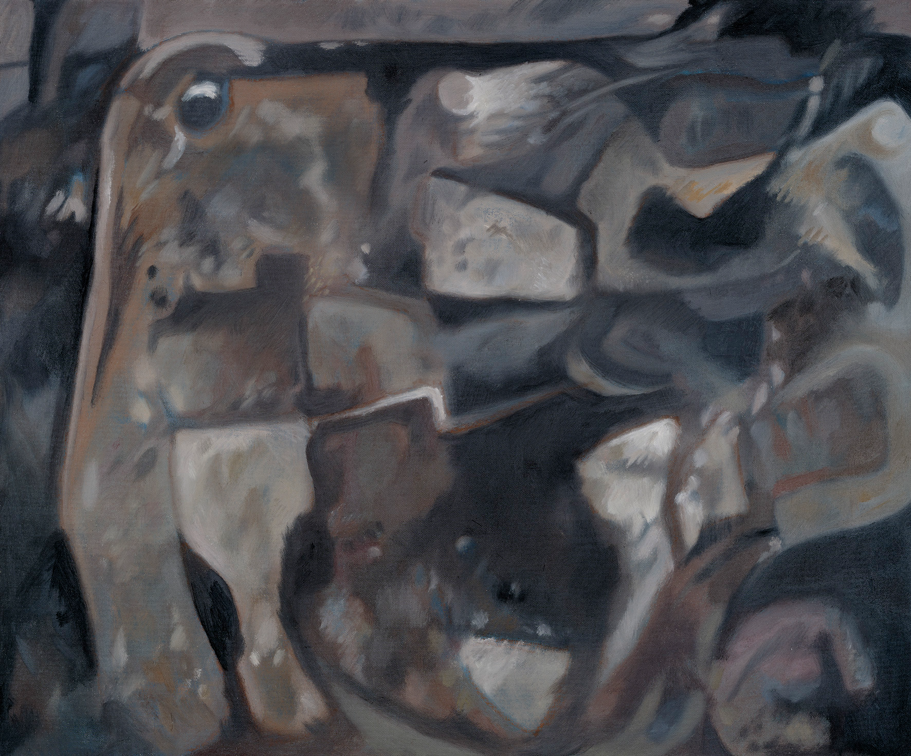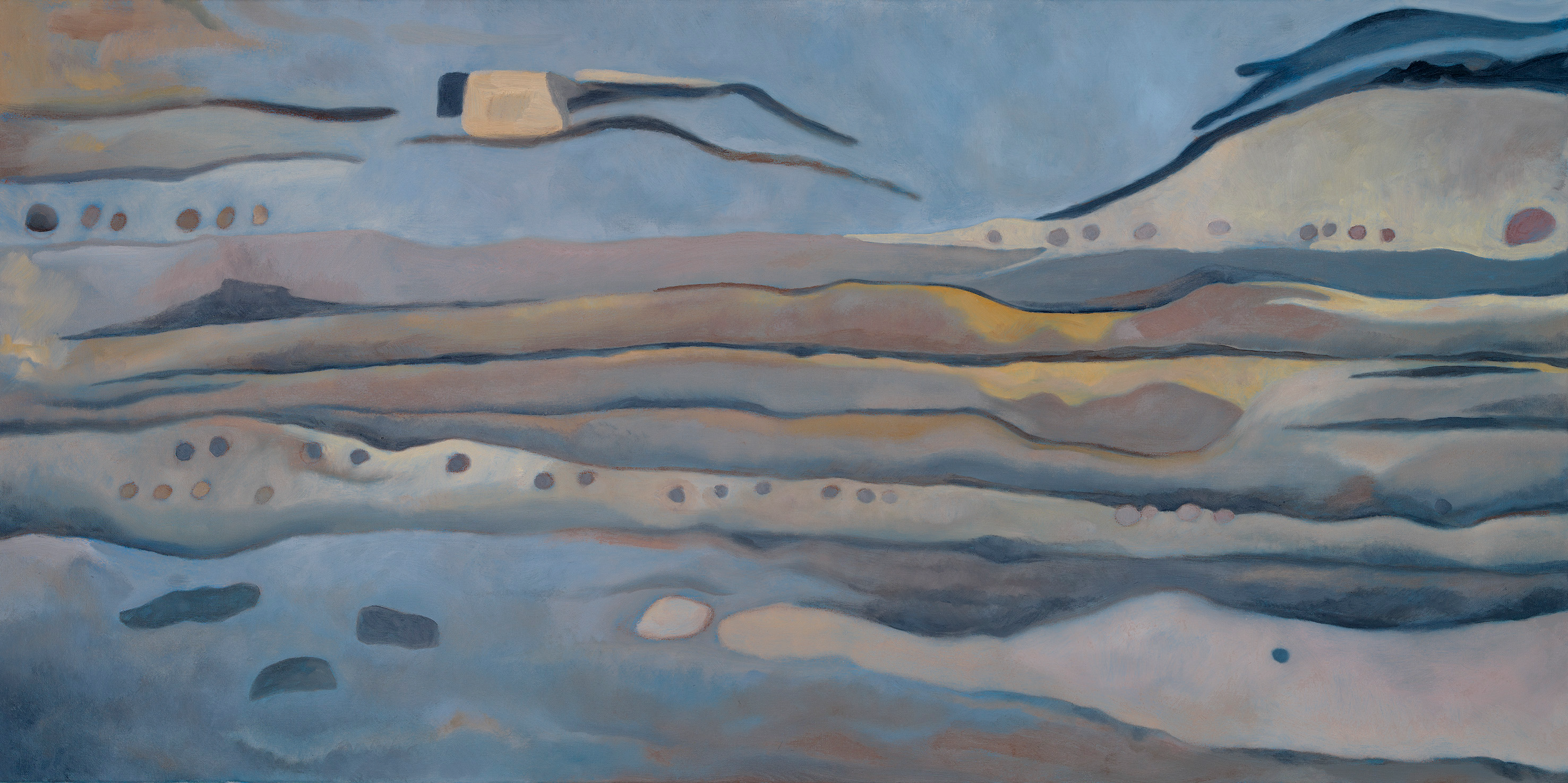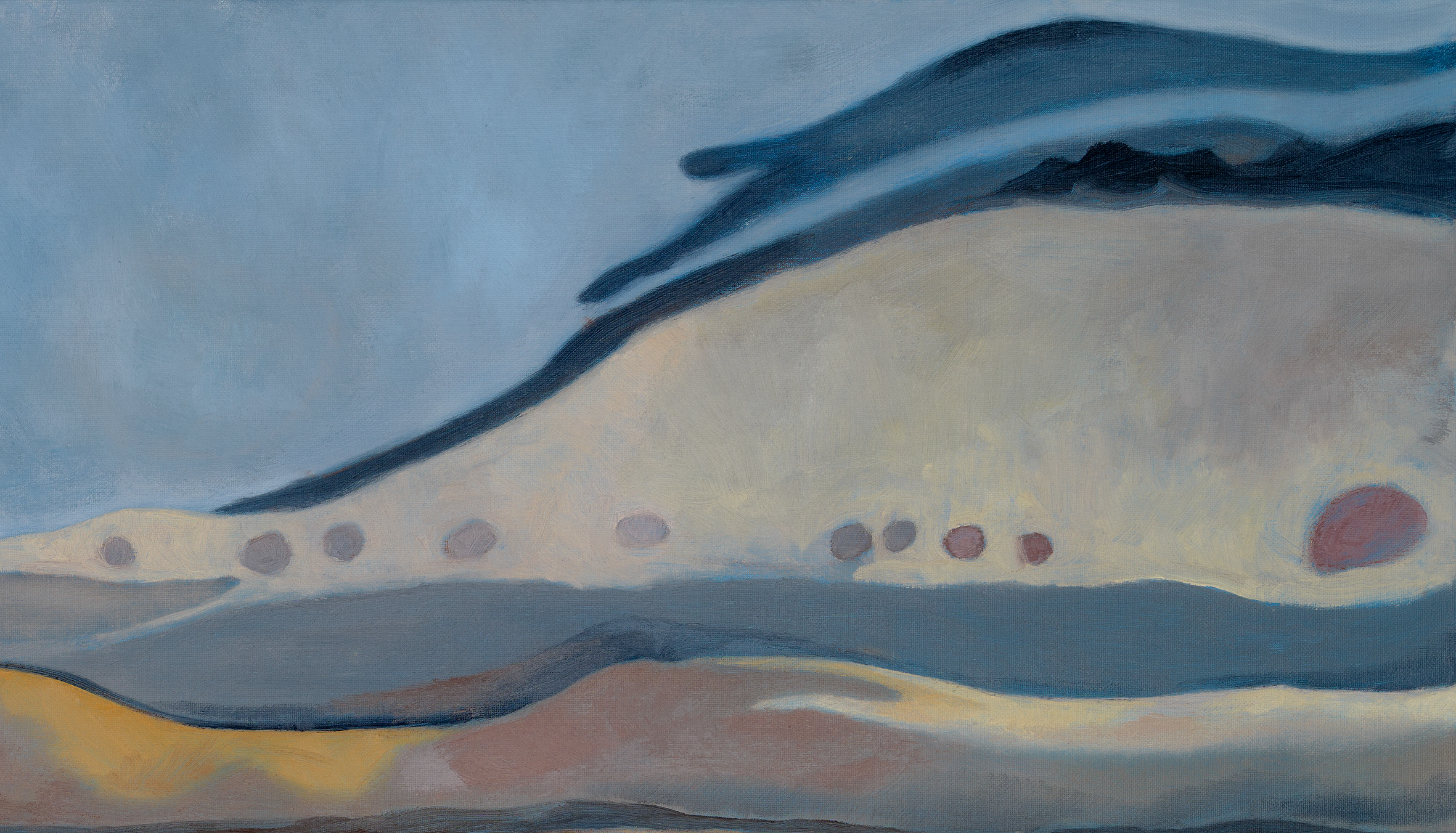 I began those views down onto the turf and timber in plan. I prepared a canvas with a layer of blue acrylic paint, as a base onto which to lay the subtle brown hues. I sketched out the edges of the area, then the forms of the turves. As they appeared, oily marks in silhouette, they took on a new kind of abstraction, a new energy and sense of time somehow. I started light with the whites and pale yellows, which formed floating forms in the blue, like icebergs breaking loose on the floe. With the greys and ochres the painting felt more grounded. Slowly it built, deepening and settling. I loved the way the oils allowed subtle merging of colours; small glimpses of something else. The end result feels somehow ghostly, in transition. And that feels right for these lumps of earth, set there by people long gone.