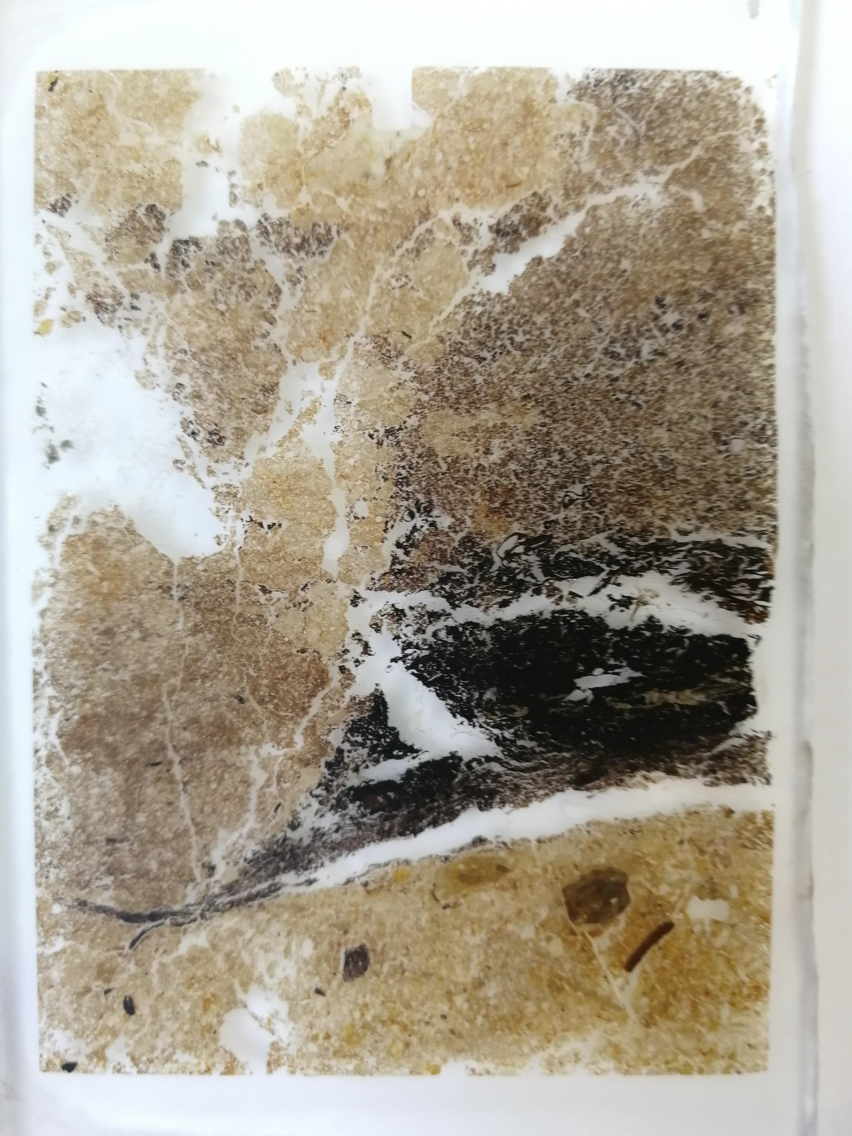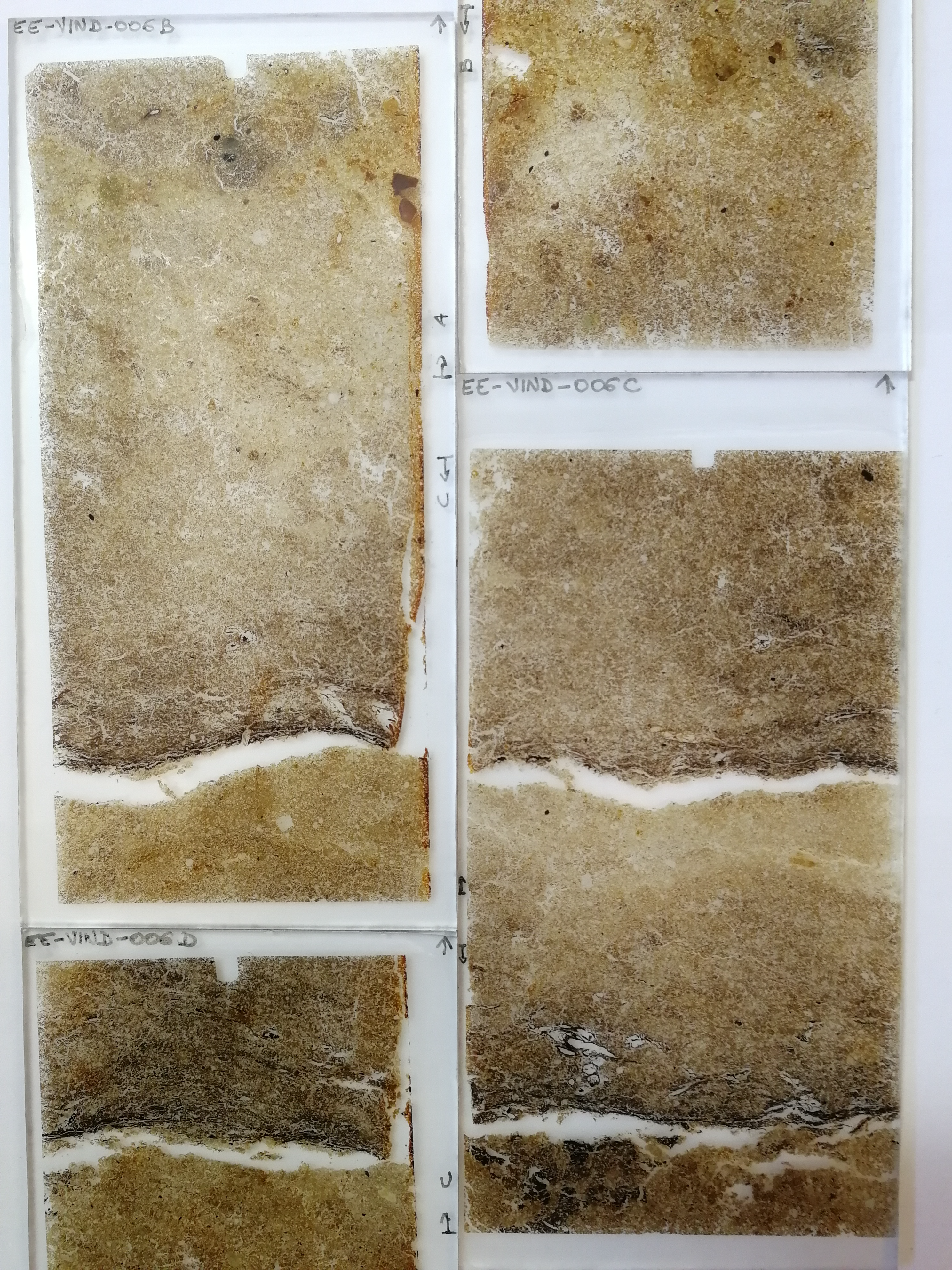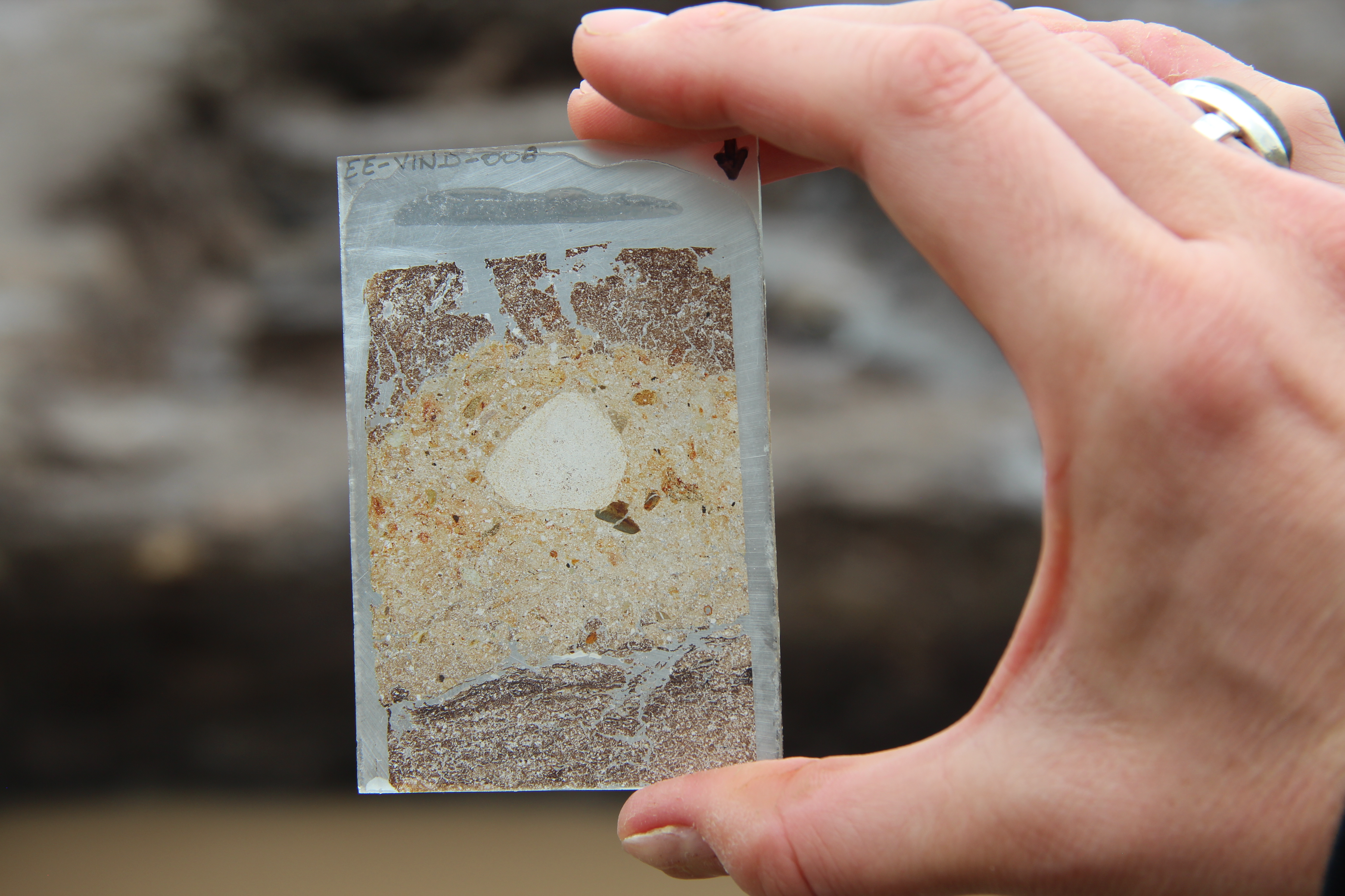 Back at the lab, these tins and their contents are set in resin, and thin slices of the rectangular sample sawn out and set between glass plates to create thin sections. The soil is dissected so thinly that light can pass through, allowing archaeologists to look at the fine details of the soil composition and structure, a mode of analysis called micromorphology.