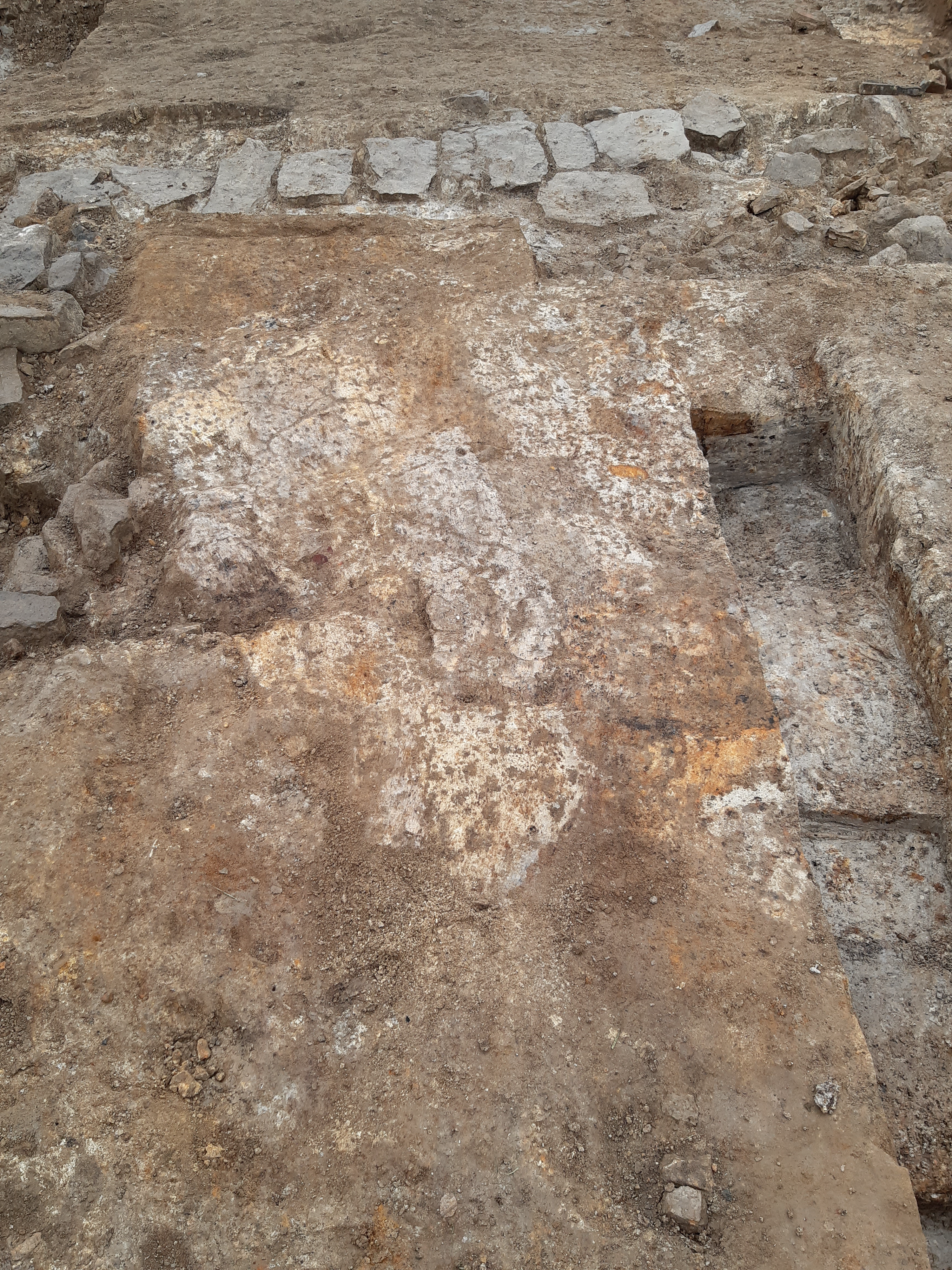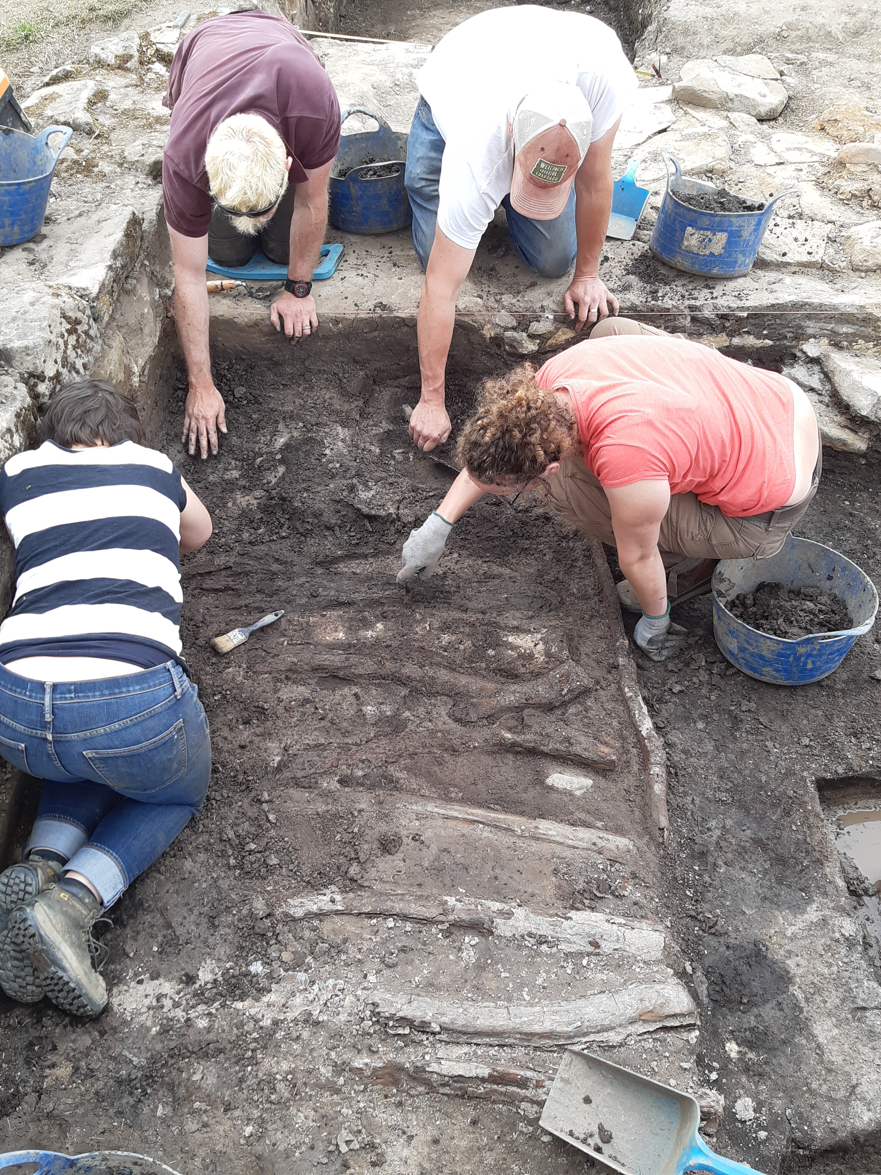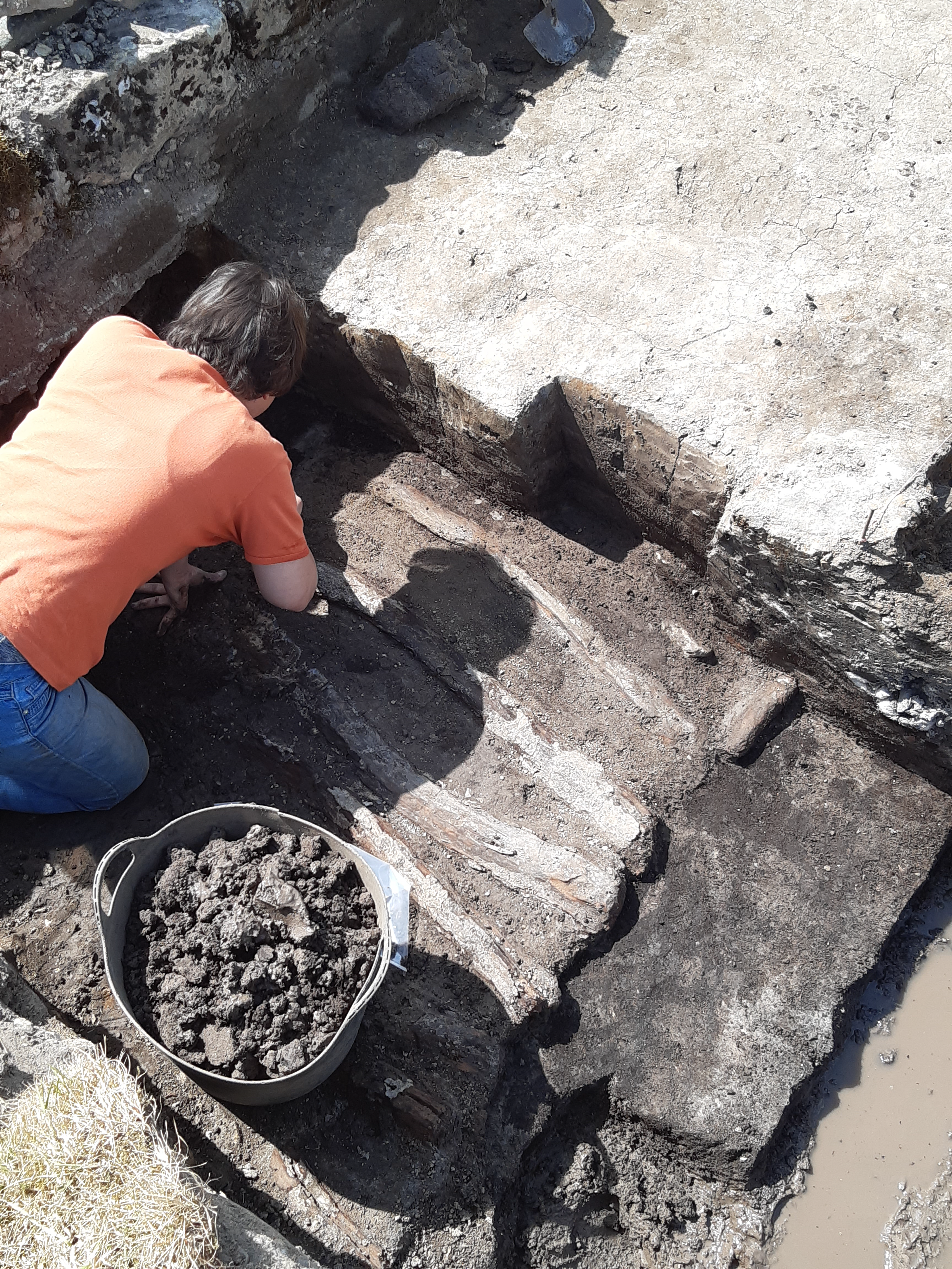 With this section established, we began to take down the wider area in plan. First of all the stone from a later phase was lifted: a Roman oven dissected into its component parts and piled up beyond the trench. Then down we dug. I was digging along the side of the rampart, on the area that would have been just inside the fort. The first sense of a change was the feel of the soil. The fine, dark brown silty soil, began to take on a particular roughness. Small pieces of vegetation appeared on my trowel, sun-starved but intact. It was a surface of thick moss and grass: the original ground surface still there after all those years. Over the rampart, the rest of the team had come onto something too. Clayey coloured patches. They cleaned it back with their trowels and we stood back to look.