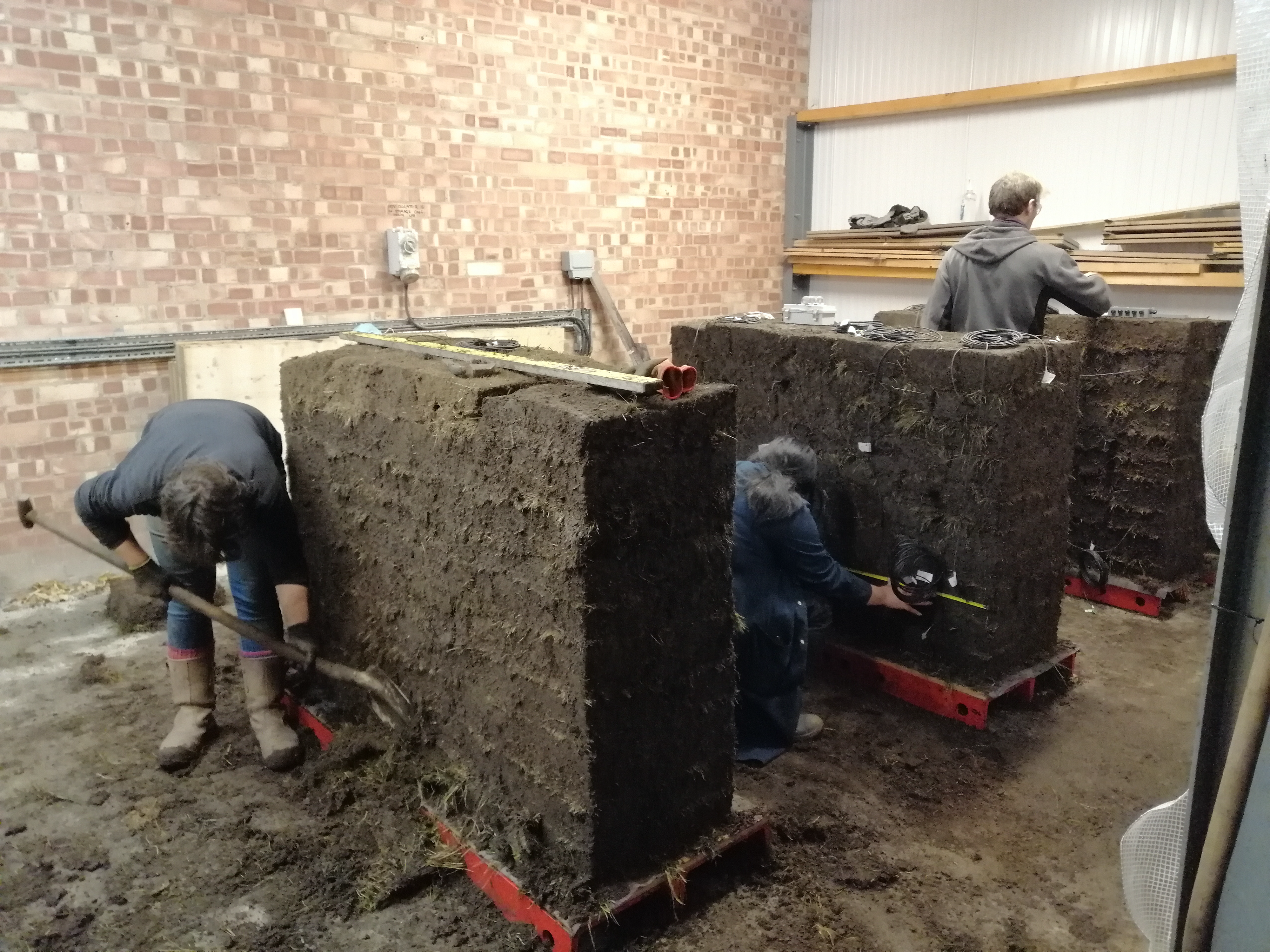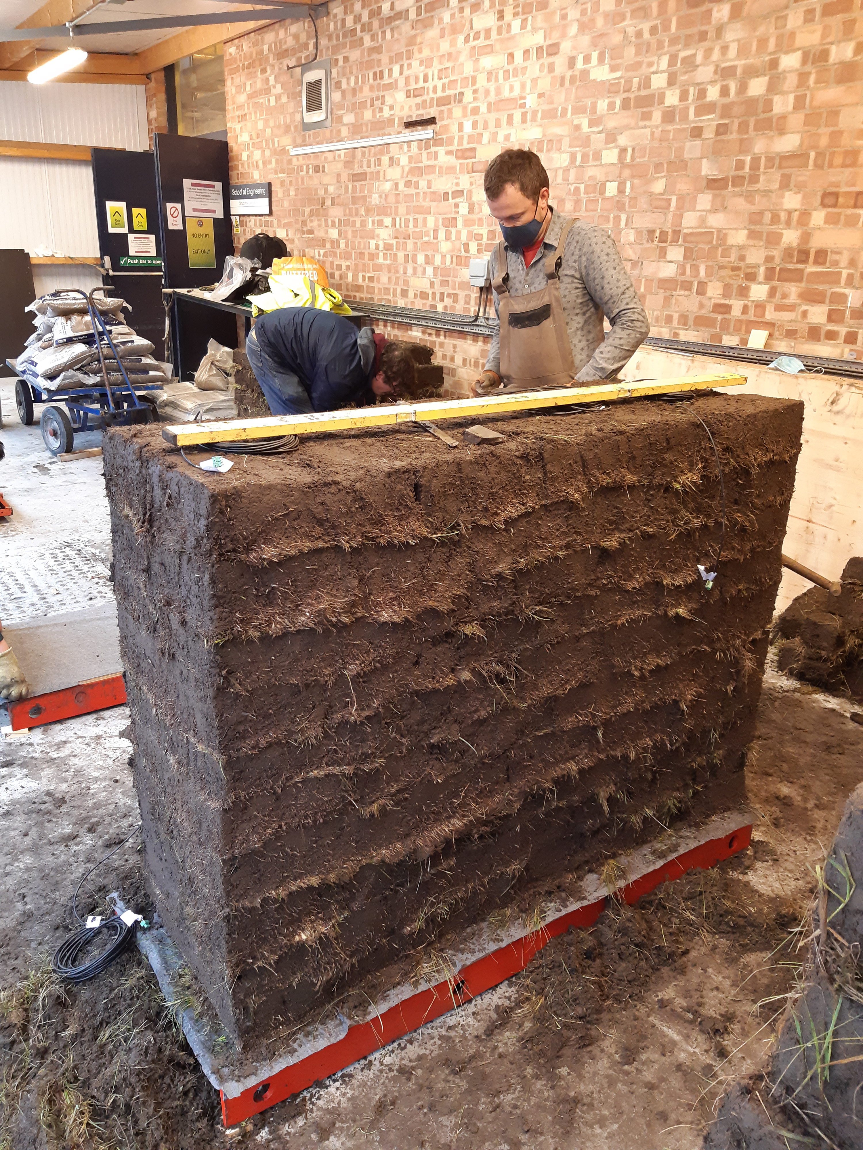 We tested three walls, 1.5m long x 0.5m wide x 1m high, and applied different loads to them. First they had weights added to their tops, simulating the load of a roof, and were left outside under cover the best part of a year. Moisture sensors embed in the turf told us how they dried out and responded to weather conditions. Photogrammetry was used to model and record how the walls consolidated over a long period of time; how it changed, moved and recovered. At the start, the turf walls consolidated very fast, with the height lowering but very little bulging, and this occurred less over time. After month 4, there was very little consolidation showing that the walls were settling, and had found a new equilibrium. The 3D models generated from the photogrammetric recording record how the height and width of the structure altered over time according to the loads, allowing the engineers to analyse the models more in the future as they gather more data.