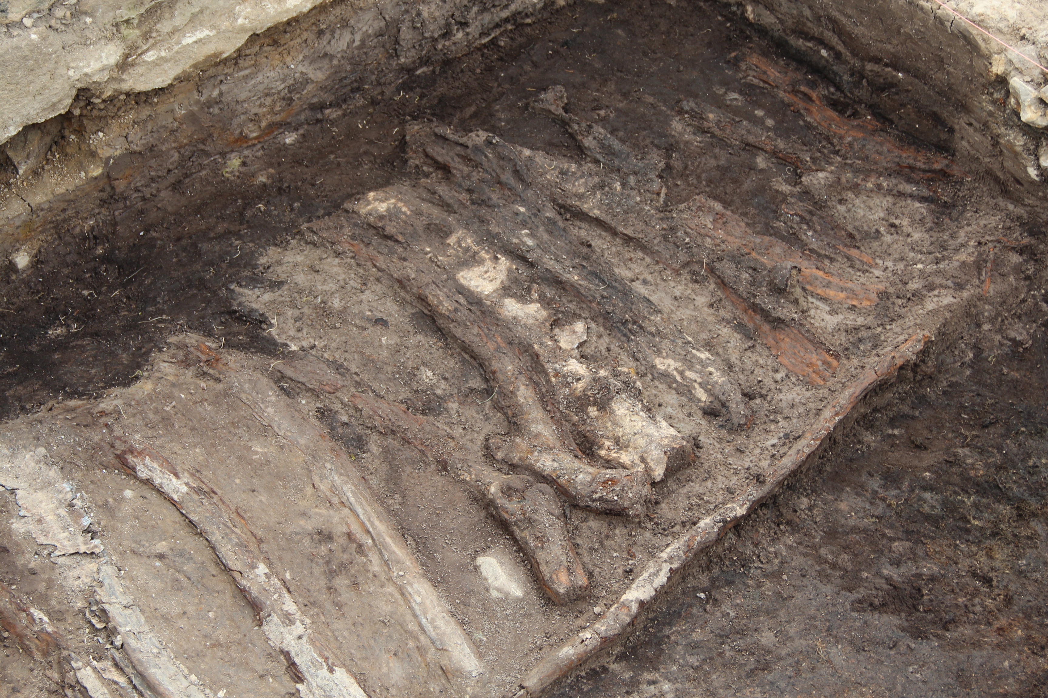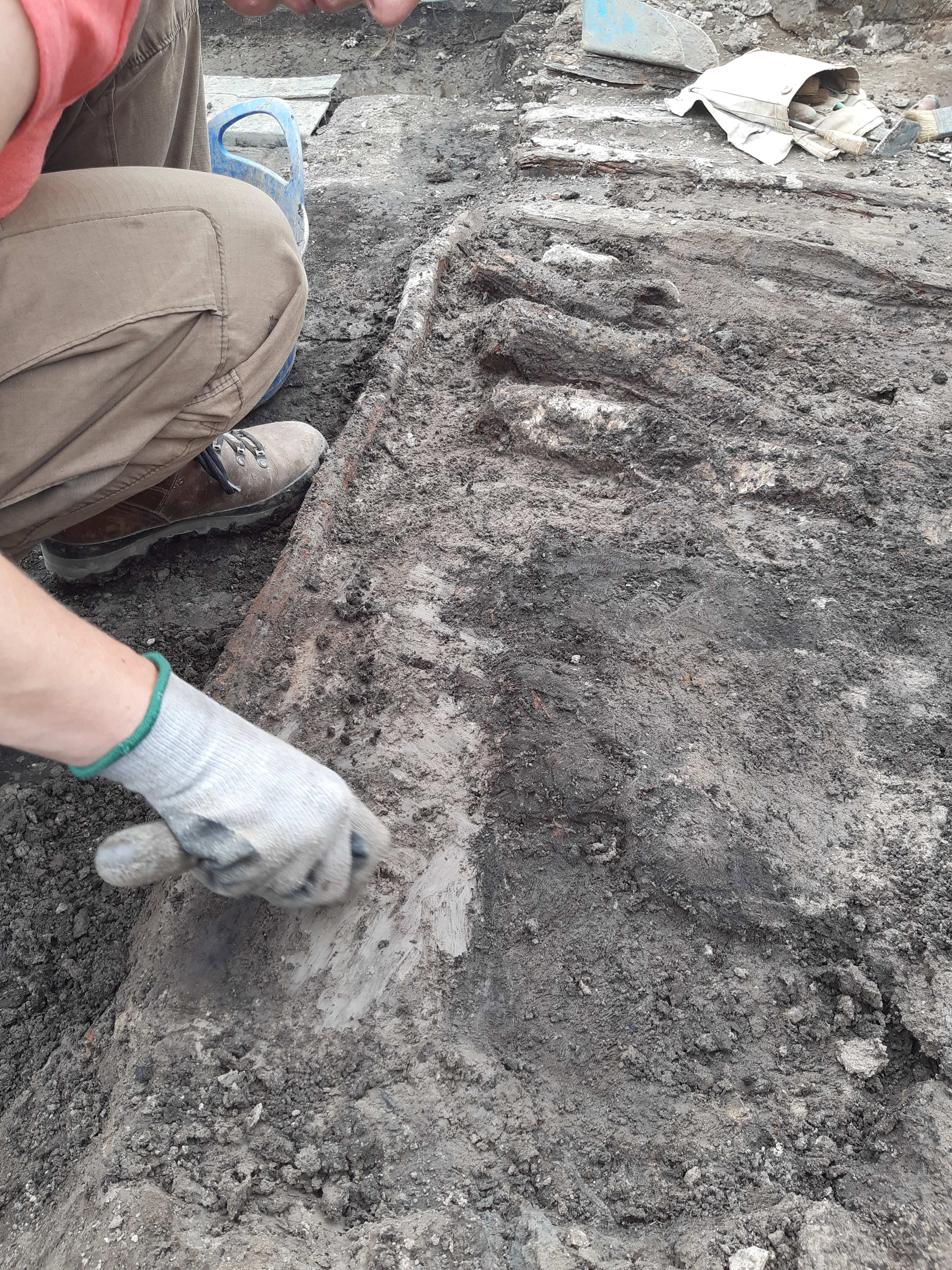 Where the timber rafts have been discovered, they are fantastically preserved. Excavating onto them, the team felt the hard stretches of silver birch bark butterflied over the split timbers. On their white surfaces, their trowels picked out knots from branches, ripples, tucks and scars in the bark that would have been visible to those cutting it down all that time ago. The great logs, lying together in neat order, were sculptural against the dark soil. It’s so rare to find wood in such good condition, that something so practical, so normal, takes on new wonder as it emerges from the earth.
