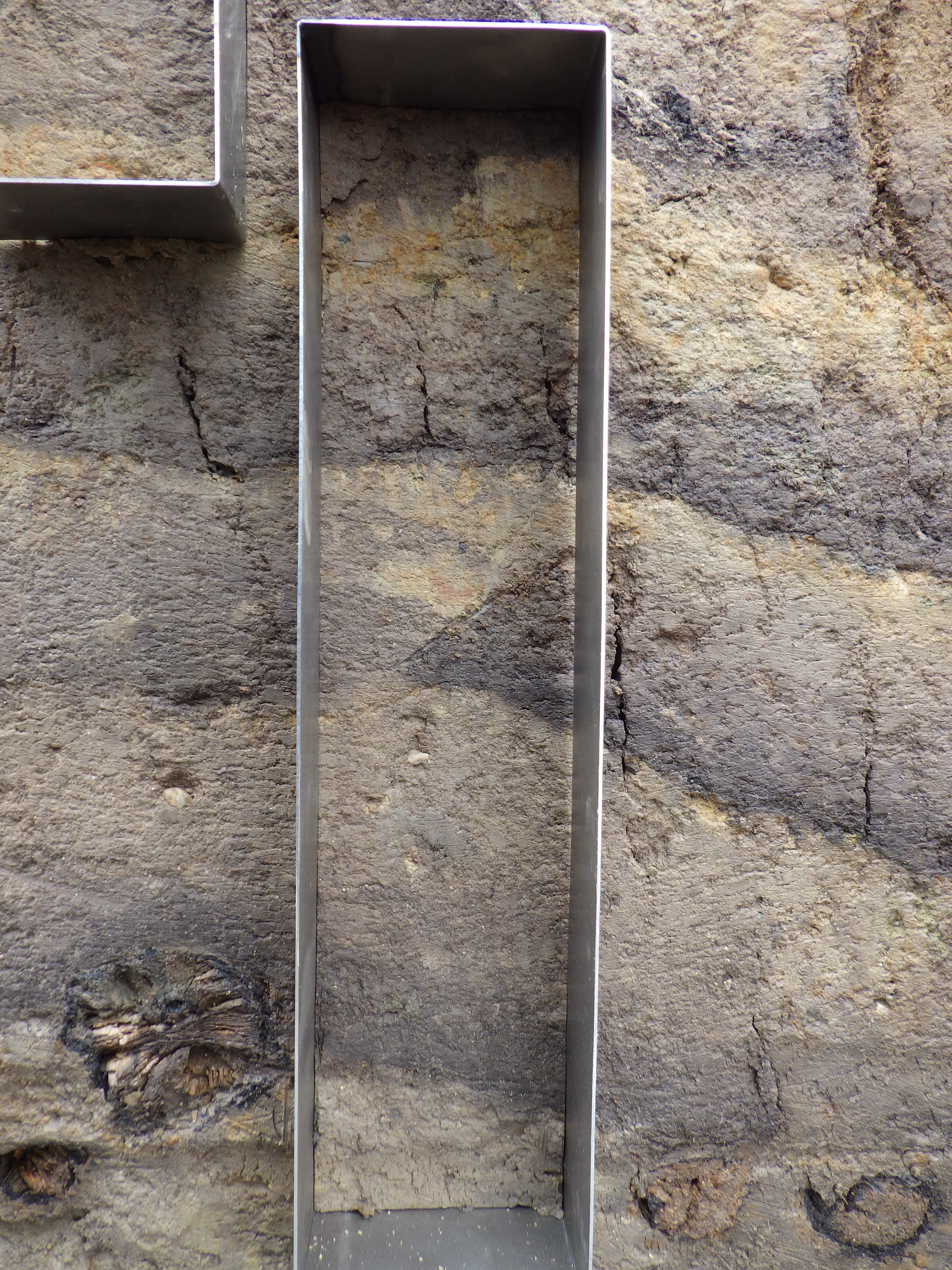 During the excavation of turf structures, samples can be taken to look at in more detail. Rectangular tins, their front or back removed, are eased into a vertical section, cut out, fronts and back lids added, and wrapped, holding in them a chunk of the in-situ soil. These samples are taken in areas where they might tell archaeologists most about the composition of the turf, methods of construction and other materials used in the structure. For this reason, a sample will often spans different layers, and tins will be taken from different parts of the structure.