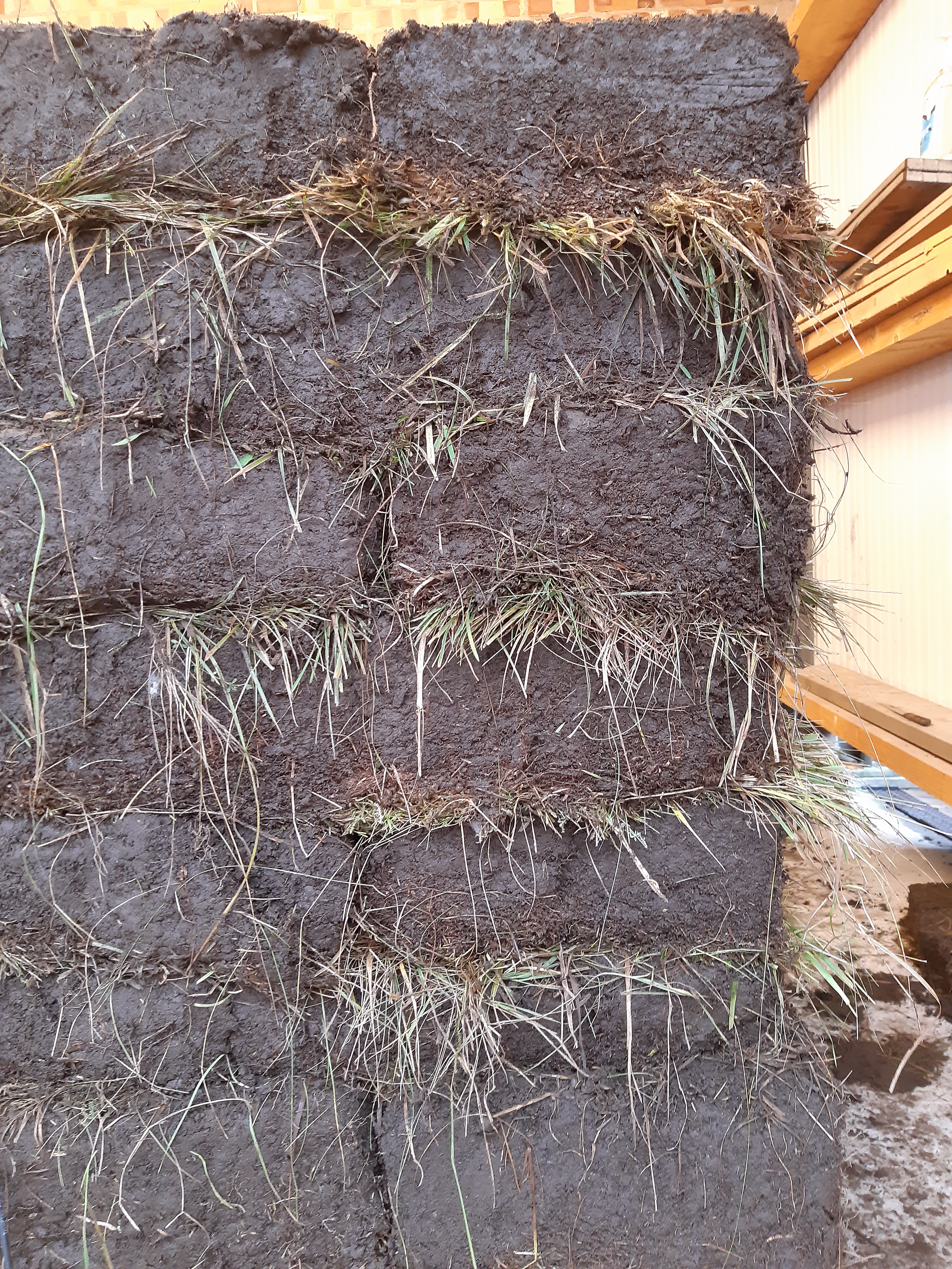 Turf blocks are cut, then stacked up to form structures such as walls or banks. It is a robust material, and because of its organic make-up, is flexible yet able to bear large loads. The sides of the blocks are cut vertically or on a slight angle, and then a flat blade or tool is inserted underneath to release the turf from the ground. Longer, thinner strips can be cut for roofing or capping walls. In this way, it’s a remarkably straightforward building material: you cut, trim and place. The size of the turf will depend on the building project, the nature of the soil and its dampness and crucially on the ideal weight to lift. The blocks are usually rectangular or a parallelogram, depending on the particular qualities of the turf, its intended use, or the style of the turf cutter.