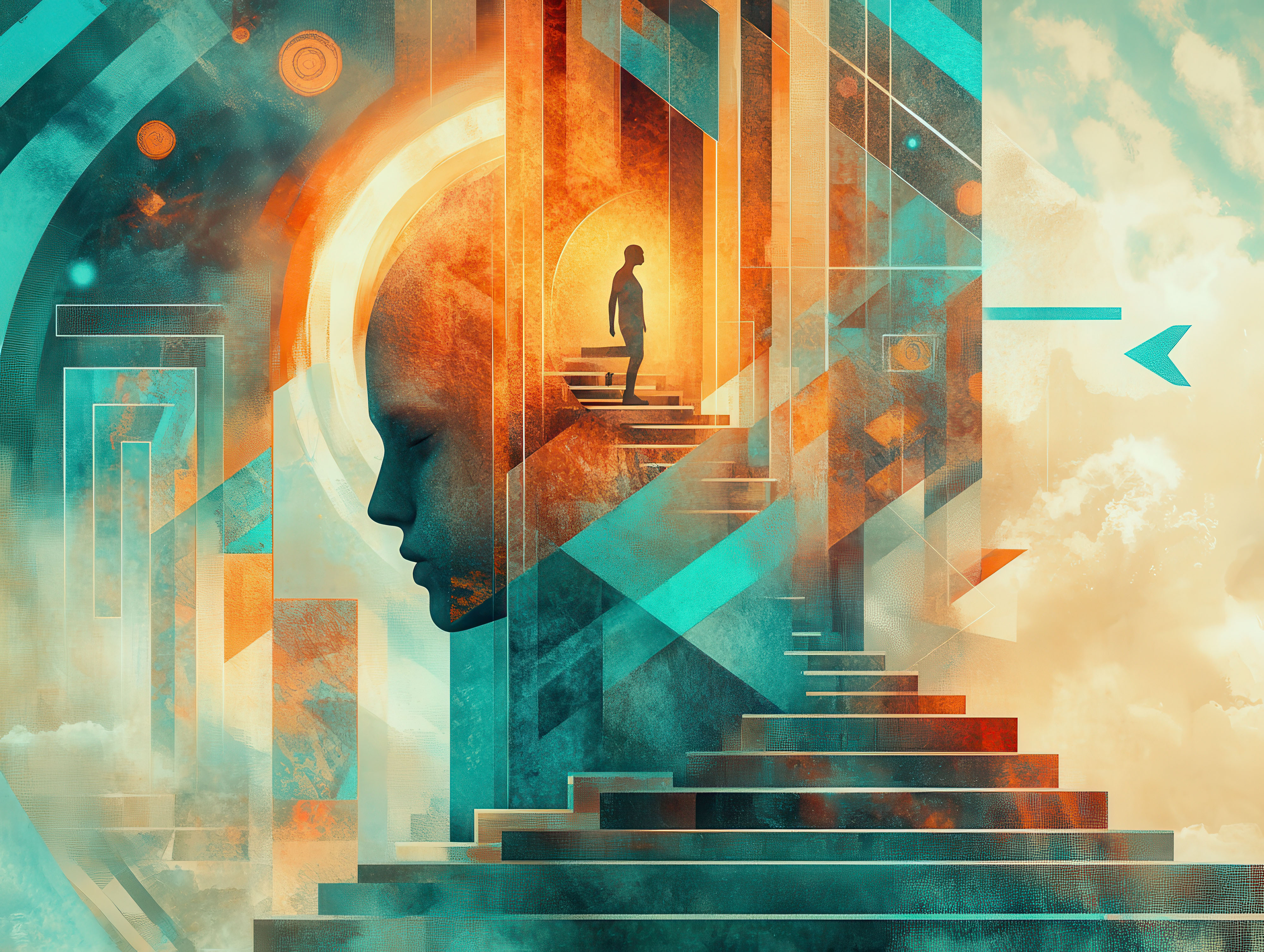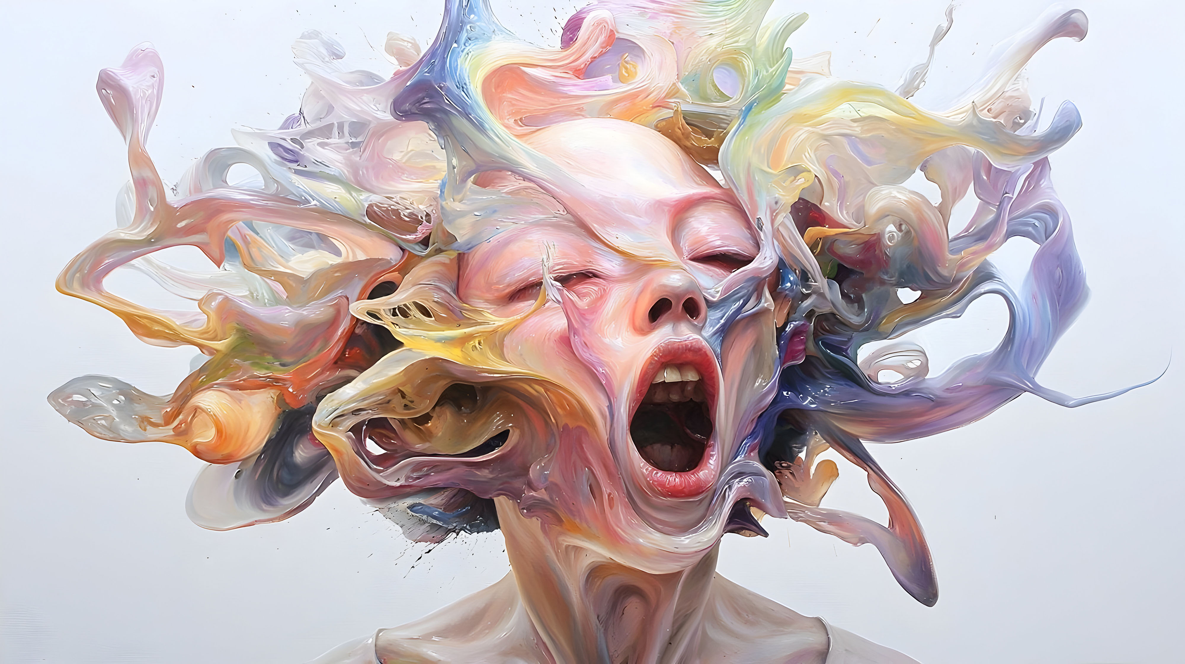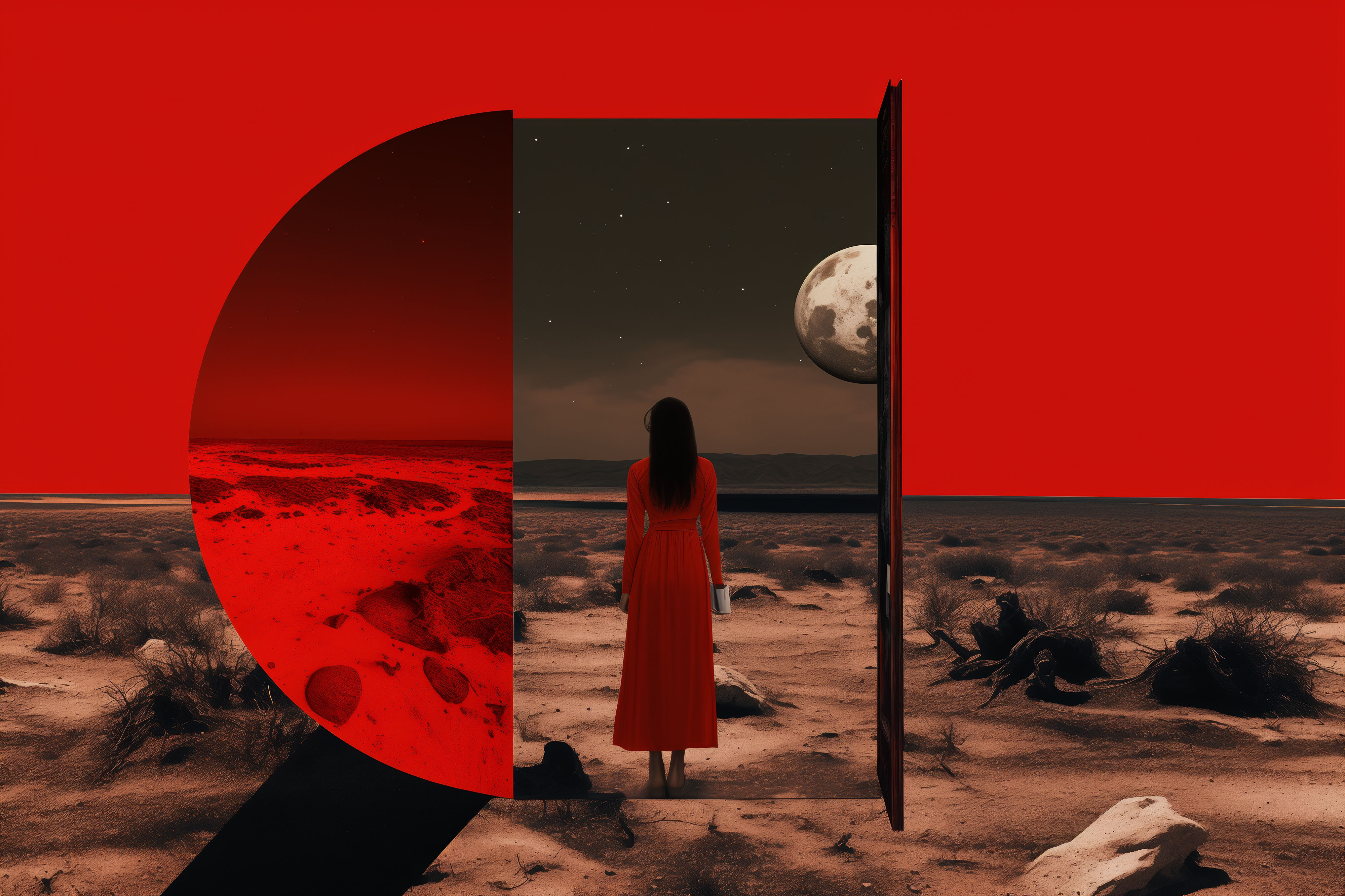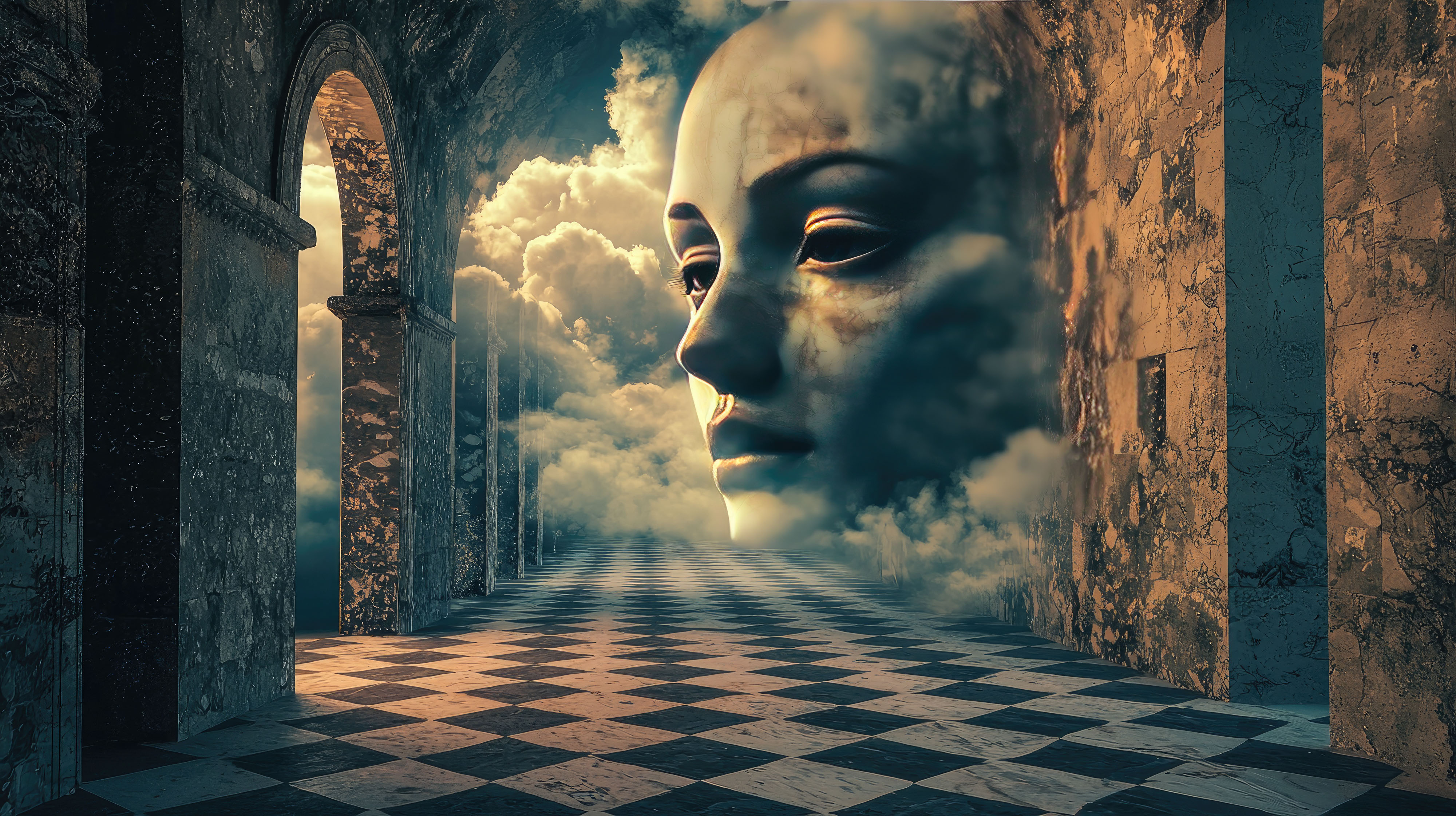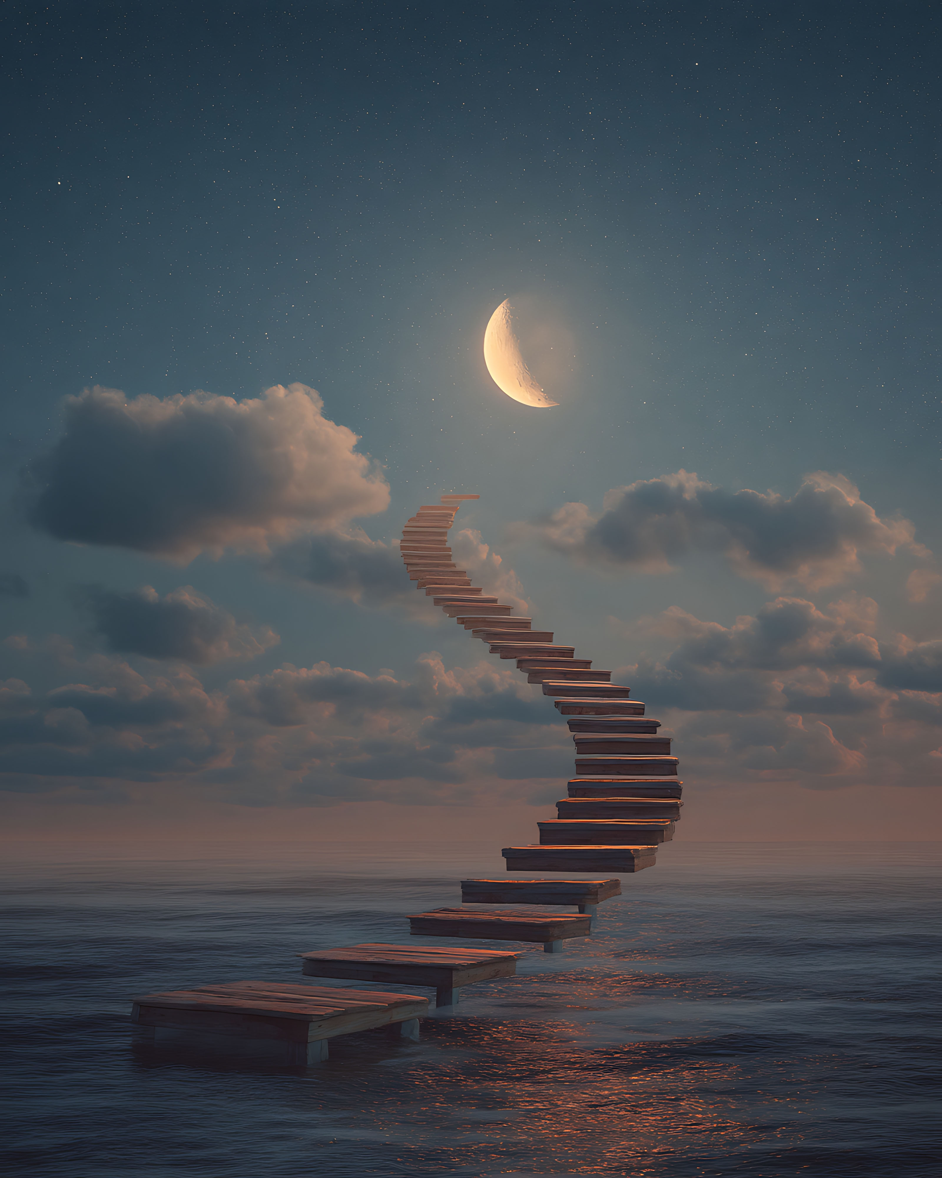 Creado con imágenes de Ryzhkov - "Surreal Minimalist Portrait of Young Woman with Cloud as Head in Stylish Outfit Under Blue Sky" • zef art - "Distorted soft melting clock on a wooden bench, the Persistence of Memory of Salvador Dali" • salongok - "Abstract Colorful Paint Splash Portrait of a Woman Screaming" • rinrada - "A wooden ladder floating in the air leads to the moon, like climbing to a lofty dream." • blckpichstudio - "A surreal scene featuring a woman in a red dress standing before a portal, looking into a cosmic landscape with a large moon against a vivid red backdrop." • amelisk - "Abstract surreal staircase leading through a giant human head into a glowing dreamlike sky." • Veayo - "Cinematic surrealism"