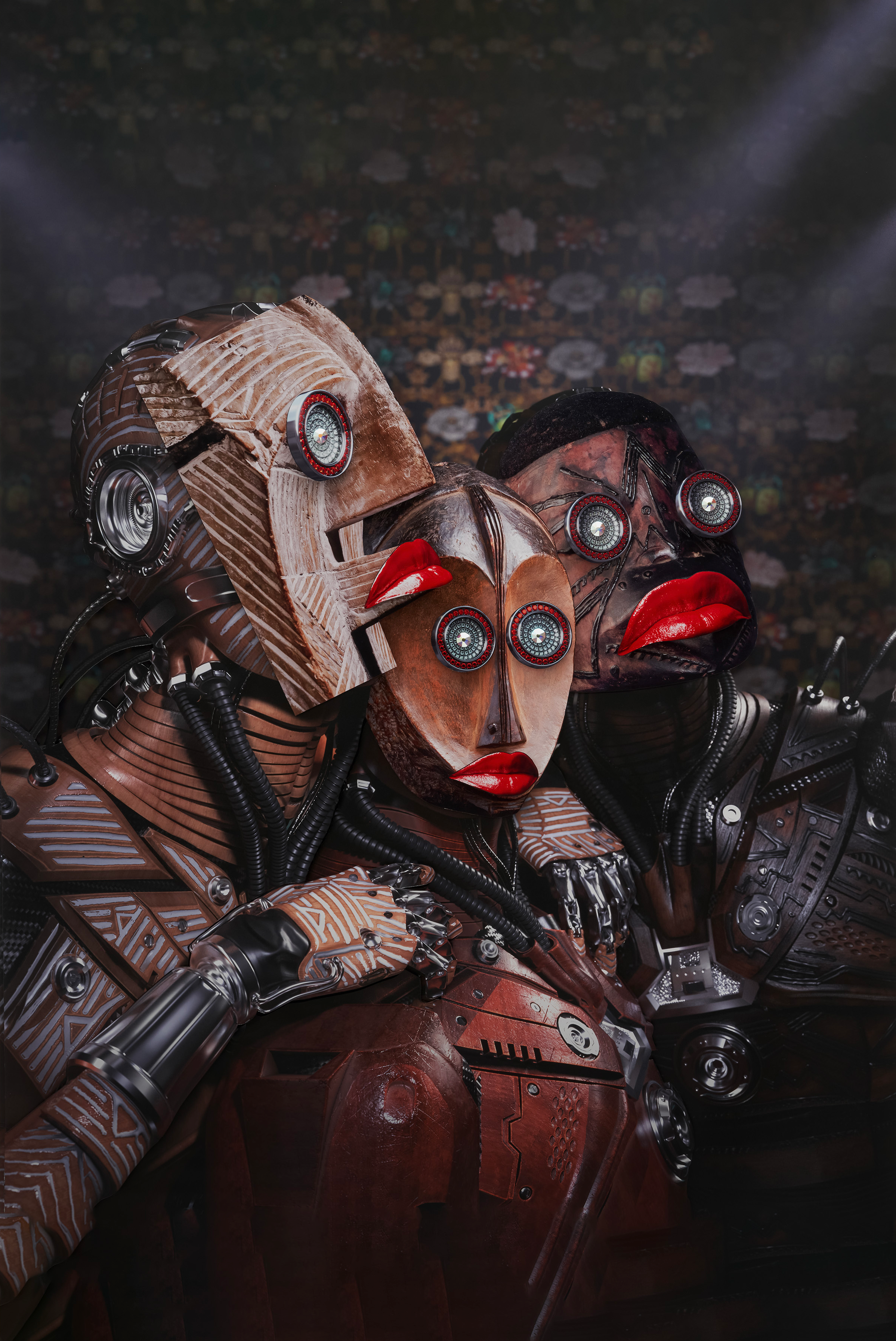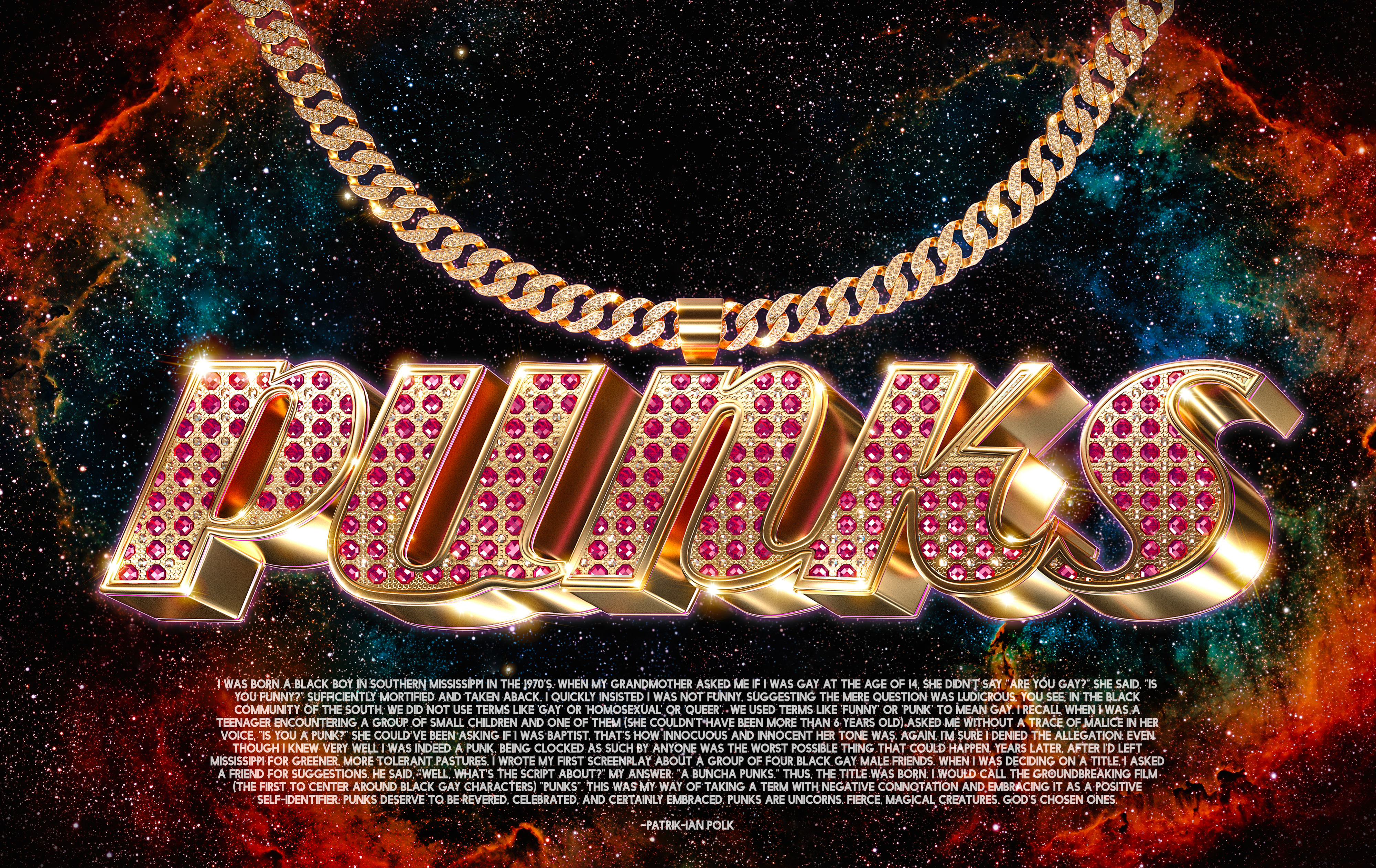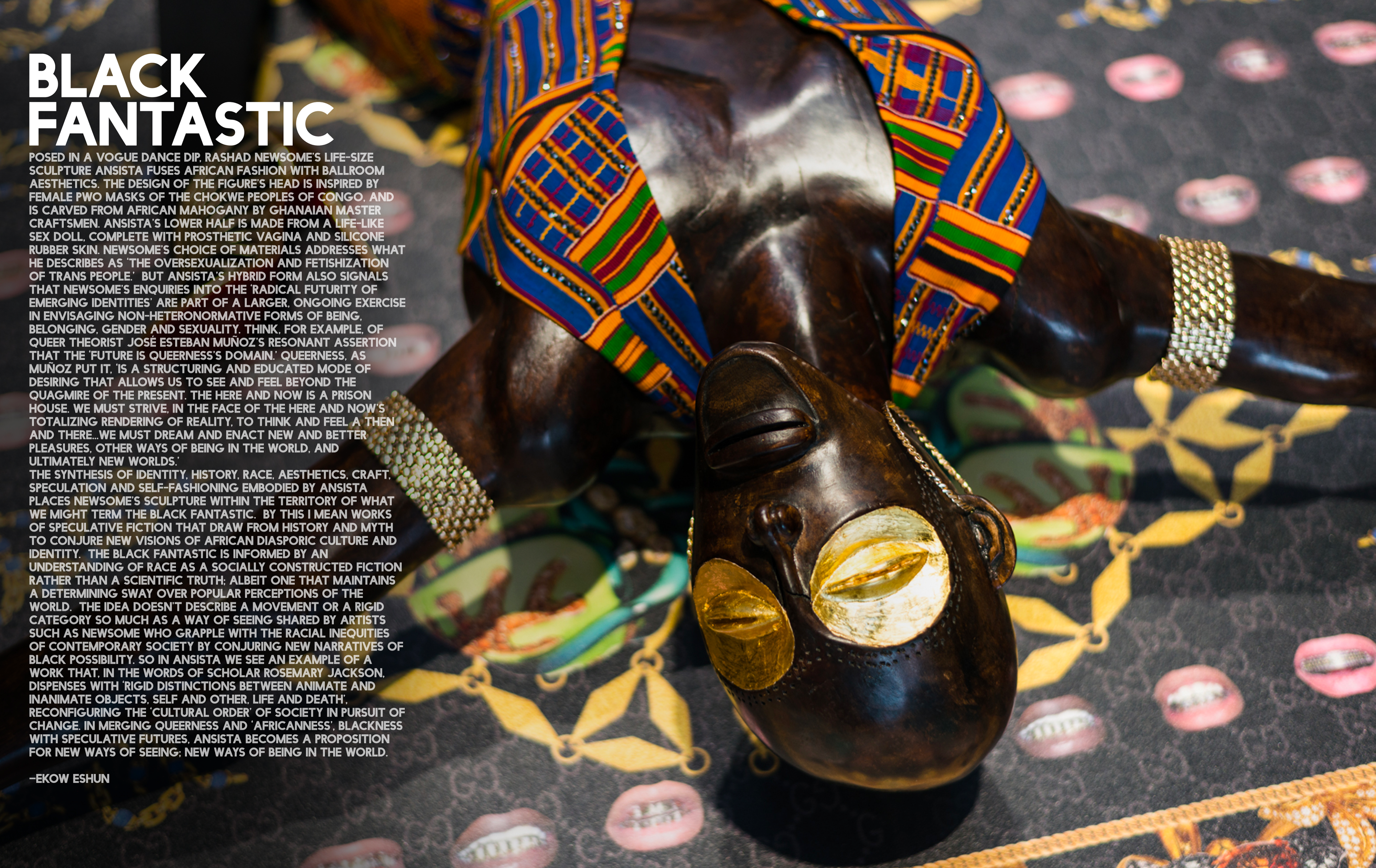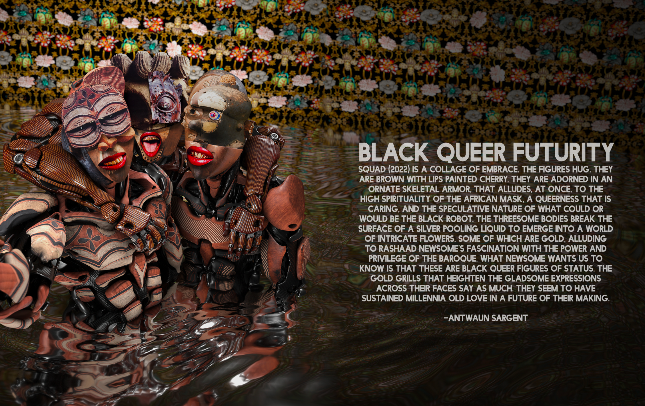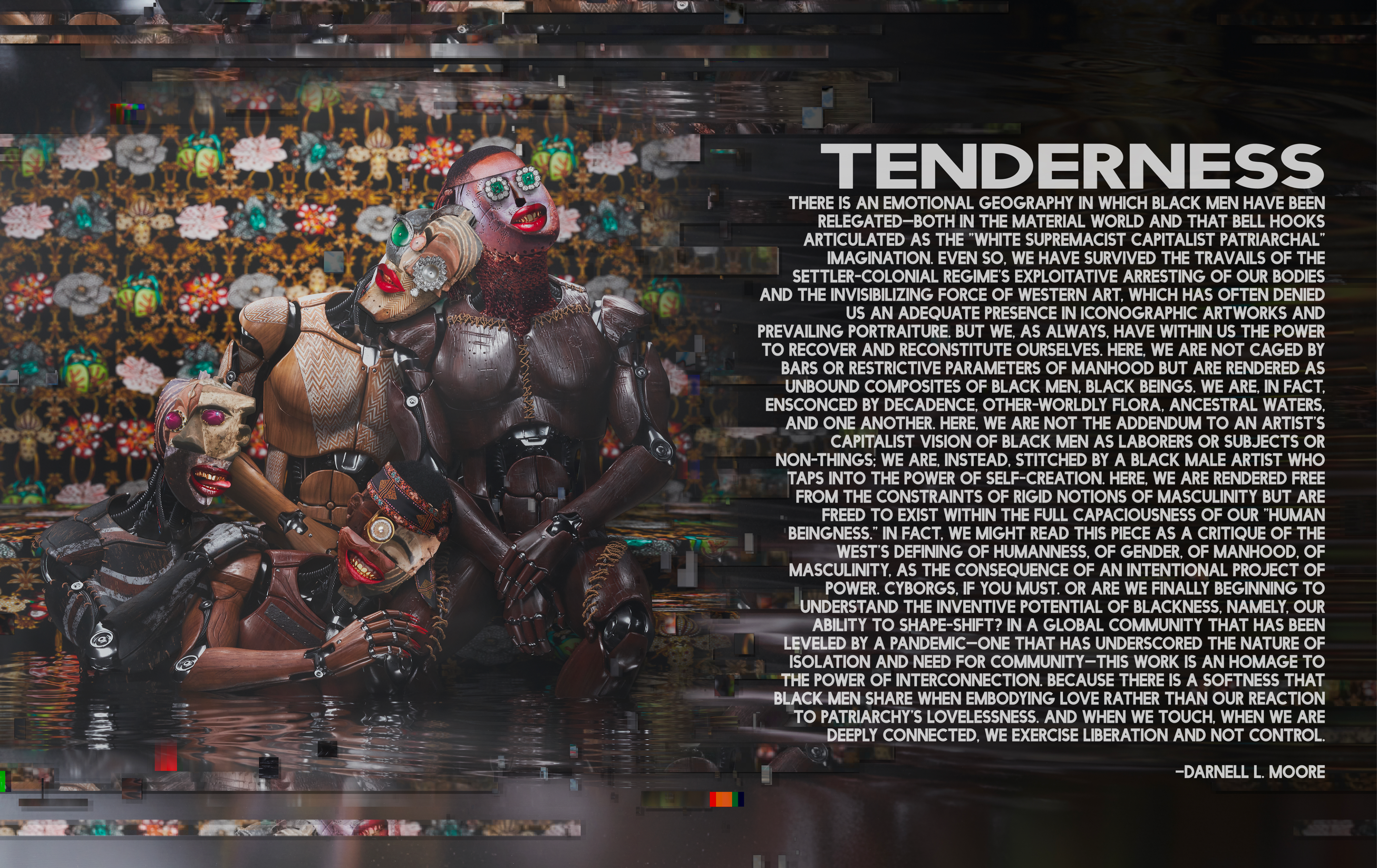 The story starts with a CGI image of a chain and medallion that says PUNKS, an attempt to reclaim a word used against many Black Queer men in our youth to break us. The image is accompanied by a text/cosign from legendary filmmaker Patrik-Ian Polk whose film of the same name was the first to depict Black gay male life. Dazie Grego Sykes's poem responds to image depicting the brokenness of Black Queer existence and the importance of healing. This theme is continued through works inspired by intimate portraits of Black Gay men showing love and tenderness for one another with text by Darnell L. Moore and Antwaun Sargent. It then moves on to works that celebrate the radicality of the gender-variant part of our community with words from Alok Vaid-Menon and Legacy Russell. We then move into pieces that explore our legacy of resistance using tech advancement as a jumping-off point with a text by Ruha Benjamin and explore the concept of the multiverse within the context of Black being with a poem from Black Quantum Futurism. Finally, we travel far beyond the realms of Afro-Futurism and land deep into the Black Fantastic with words from writer, journalist, broadcaster, and curator Ekow Eshun and James Baldwin. All images were created by Rashaad Newsome and ©Rashaad Newsome Studio.