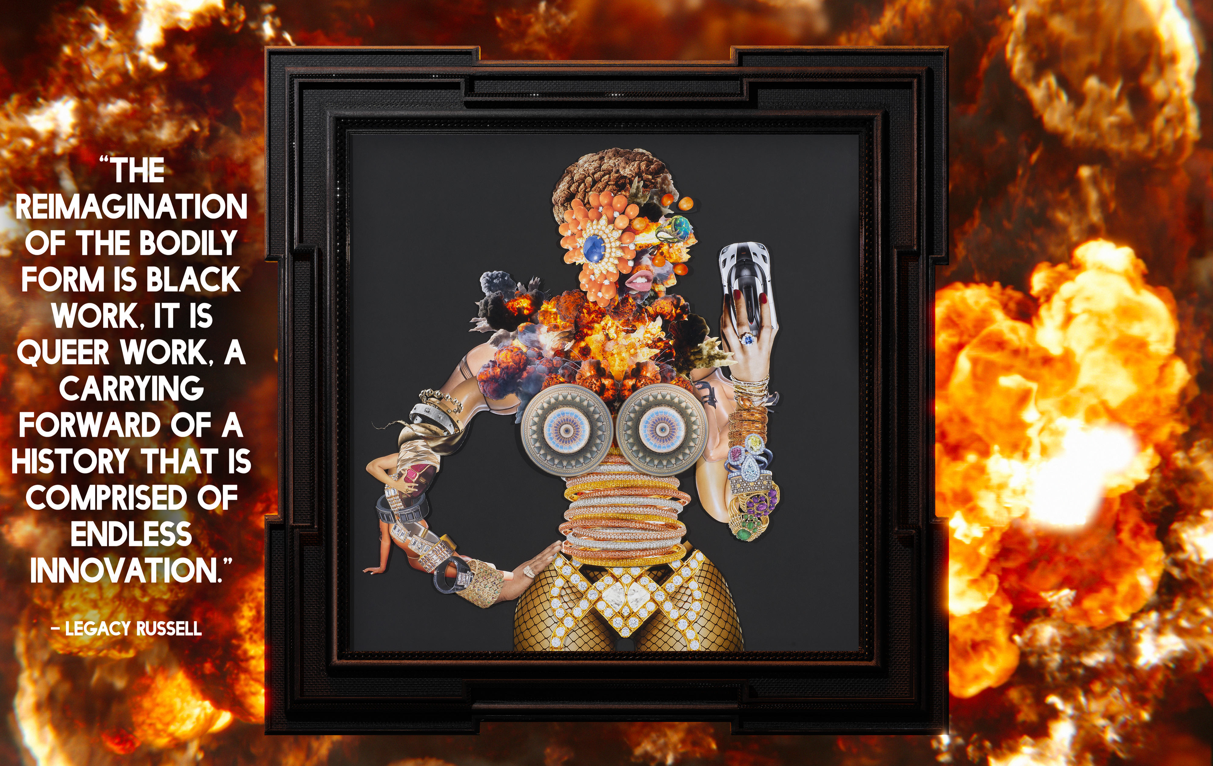 Rashaad Newsome’s work blends several practices, including collage, assemblage, sculpture, film, video, 3D animation, photography, music, computer programming, software engineering, community organizing, and performance, to create a divergent field that rejects classification. Using the diasporic traditions of improvisation, he pulls from the world of advertising, the internet, Art History, Black and Queer culture to produce counter-hegemonic work that walks the tightrope between social practice, abstraction, and intersectionality. Collage acts as a conceptual and technical method to construct a new cultural framework of power that does not find the oppression of others necessary. Newsome’s work celebrates Black contributions to the art canon and creates innovative and inclusive forms of culture and media.