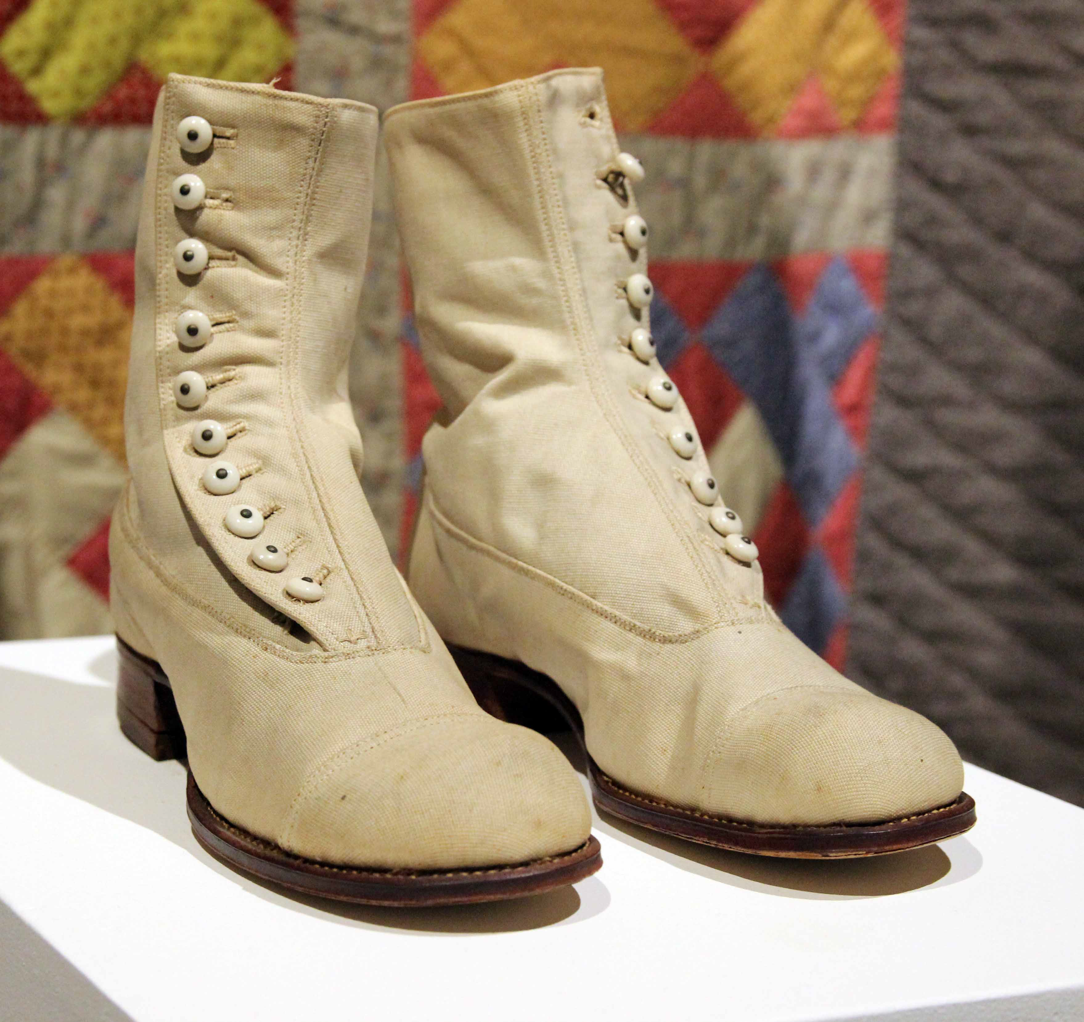 These Edwardian era shoes were studier and more practical than their dressier silk counterparts. Sewn out of thick canvas with a leather sole, the delicate row of buttons are made out of milk glass. Probably intended for a young adult, these boots barely look worn. Although shoes were gradually gaining acceptance for street wear by the turn of the 20th century, boots remained the dominant daywear style until the 1920s.