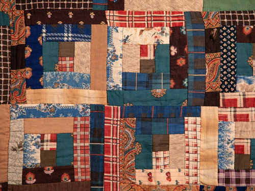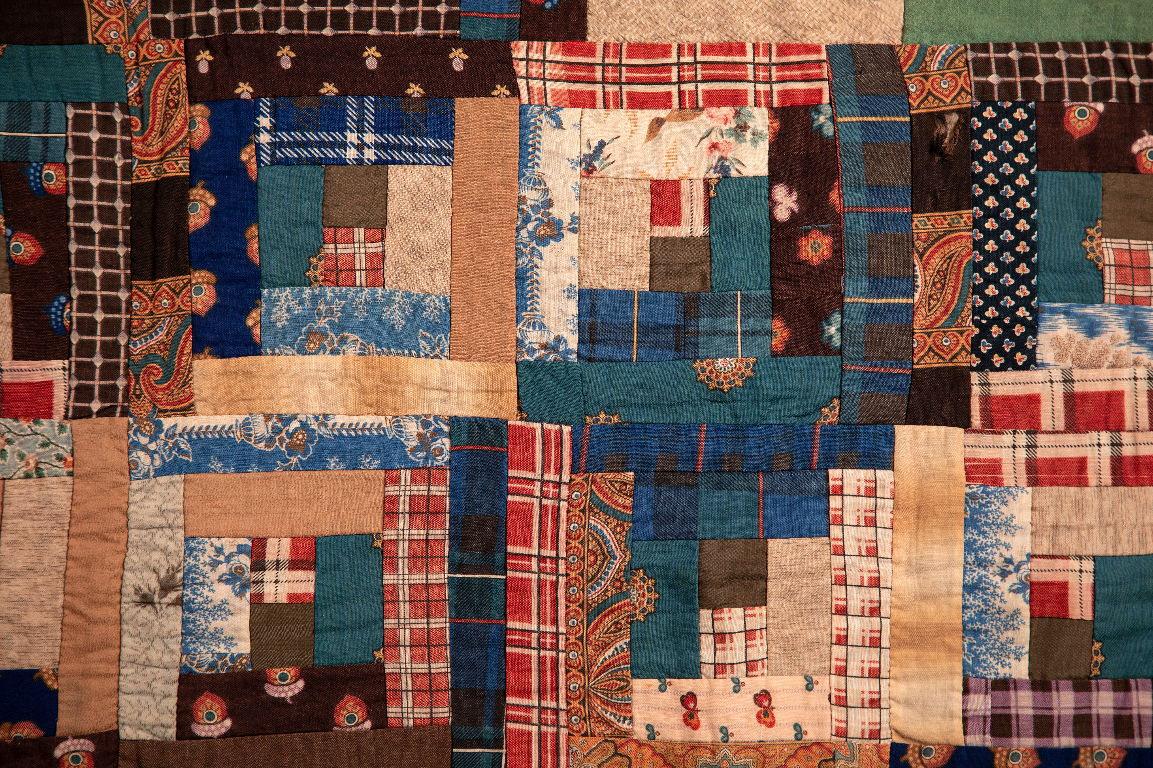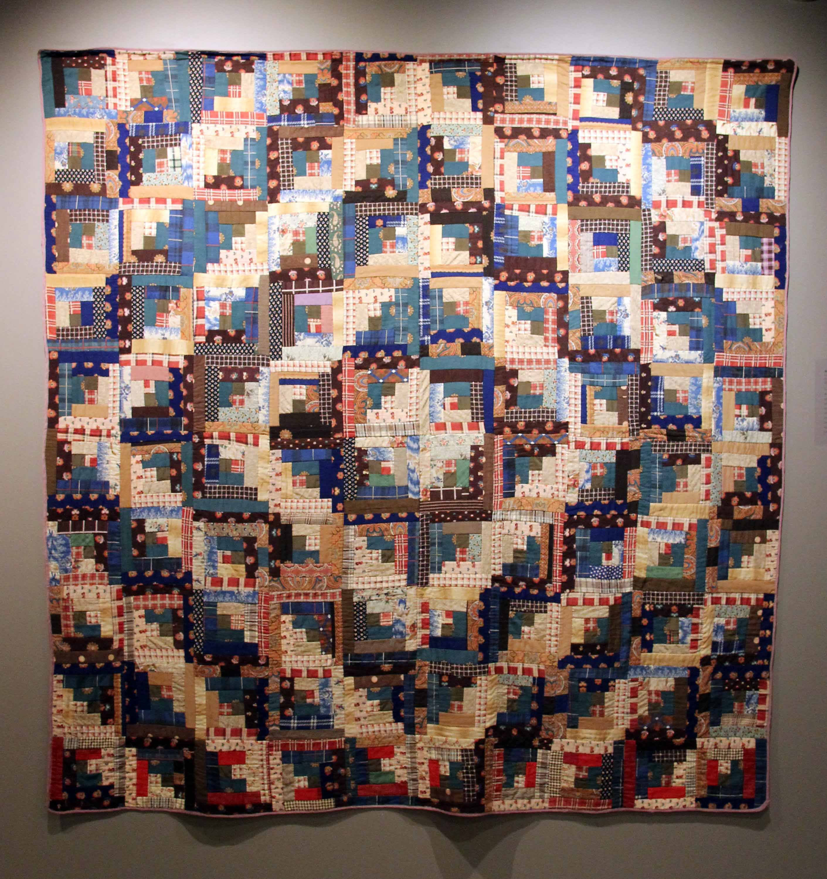 Log cabin quilts were extremely popular during the second half of the 19th century, mainly beginning around the Civil War. These quilts symbolized American values like self reliance, home, and family. Each square represents a cabin and, in this version, shows a lighter and darker side as if the sun was rising and left one side in shadows. At the center of each “cabin” is a red patch symbolizing a glowing hearth. The visual impact of the contrasting diamond rings are reminiscent of the framing timbers of a barn. The fabrics used in this quilt may have been scraps of worn-out clothing or bedding, showcasing this woman’s ability to reuse household textiles.