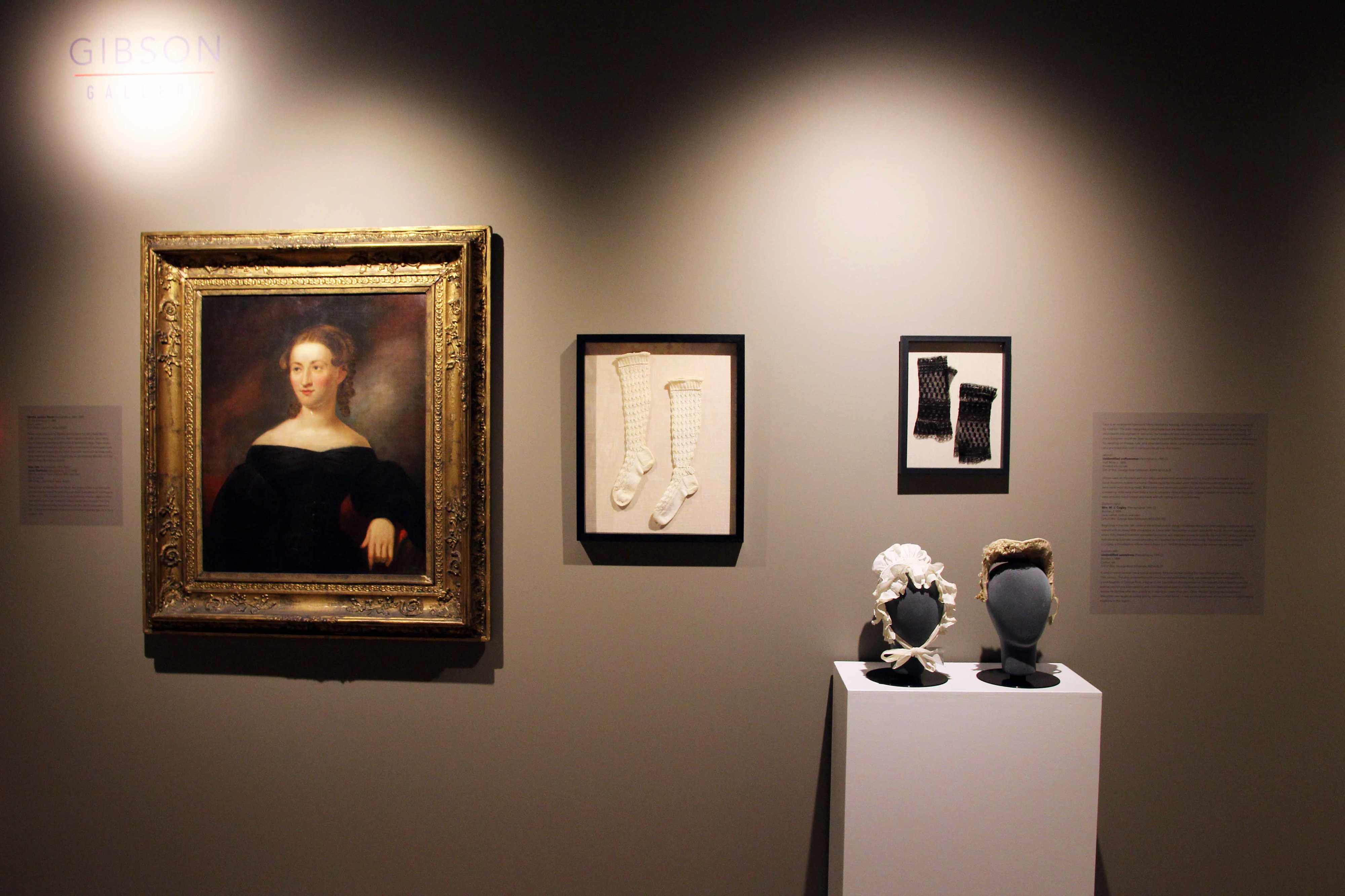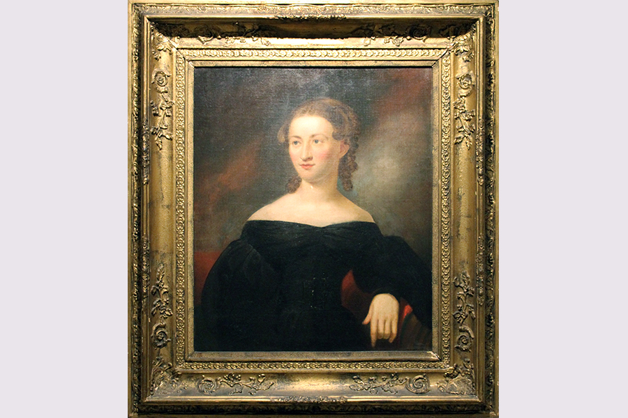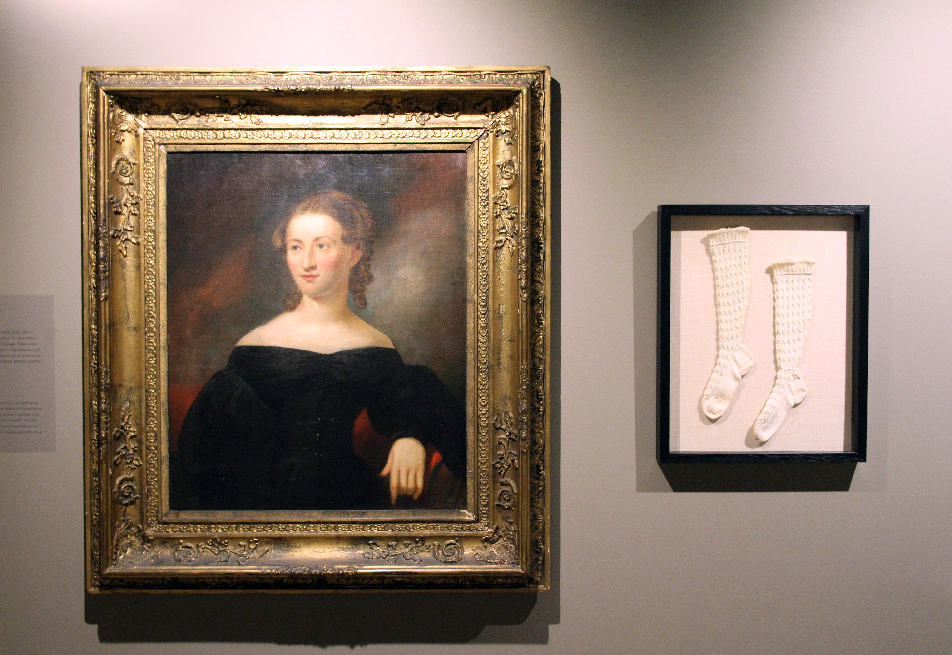 This portrait of Martha Jenkins Nevin, the creator of the ivory knit socks, was painted by noted Philadelphia artist Bass Otis before her marriage to Dr. Nevin in 1835. Six years later, Jacob Eichholtz, another regional artist, was hired to paint her husband’s official portrait and “modify” the Otis Bass portrait by painting long sleeves over Mrs. Nevin’s exposed arms. Her original short-sleeved dress was considered inappropriate attire for a pastor’s wife.