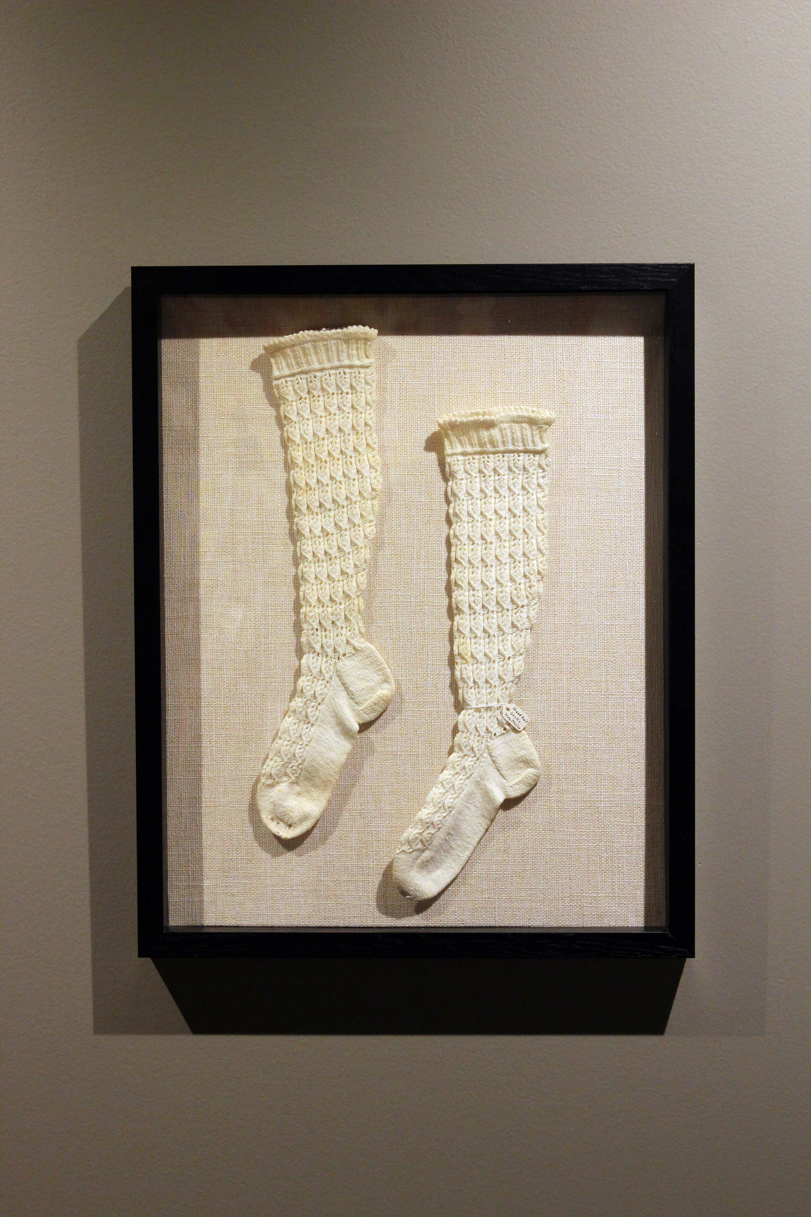 These socks were knit by Martha Jenkins Nevin for Mary Belle (Stahr) Heller when she was a child. Mrs. Nevin was the wife of Dr. John Nevin, one of the early presidents of Franklin & Marshall College. These socks demonstrate knit and purl stitches and a combination of techniques such as yarn over and pass over slip stitch. Heirloom items such as these socks were treasured and were a tangible way to demonstrate affection and the skills women learned as children.
