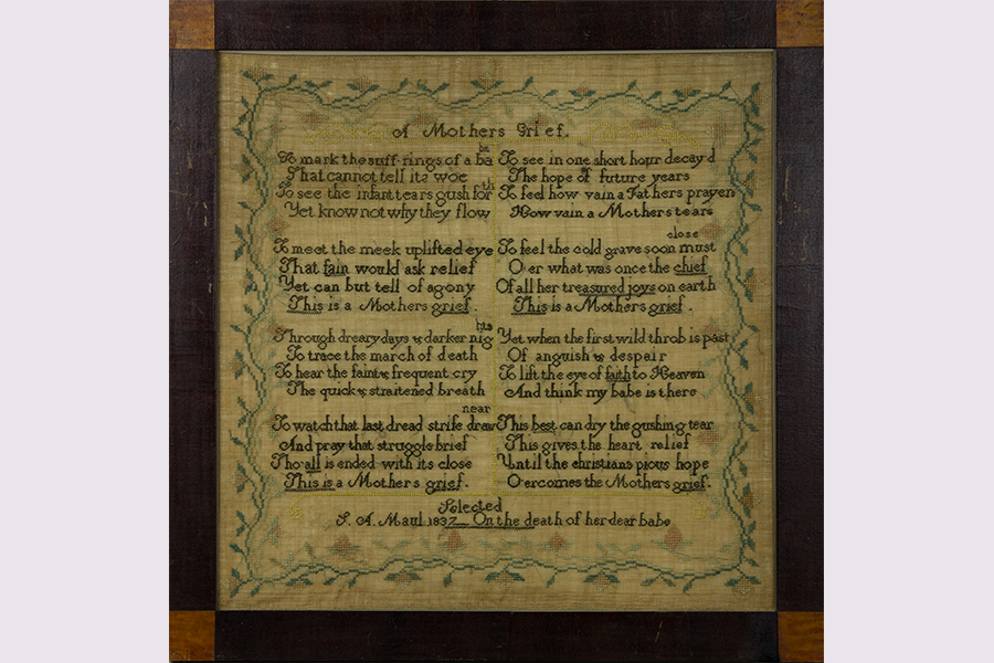 This heartbreaking example of grief was made by a mother, using her needle to help cope with the loss of her child. A carefully chosen poem was selected and a memory was stitched into the simple linen homespun fabric. Intended to be hung on the wall, this work would have been a daily tribute to the child.