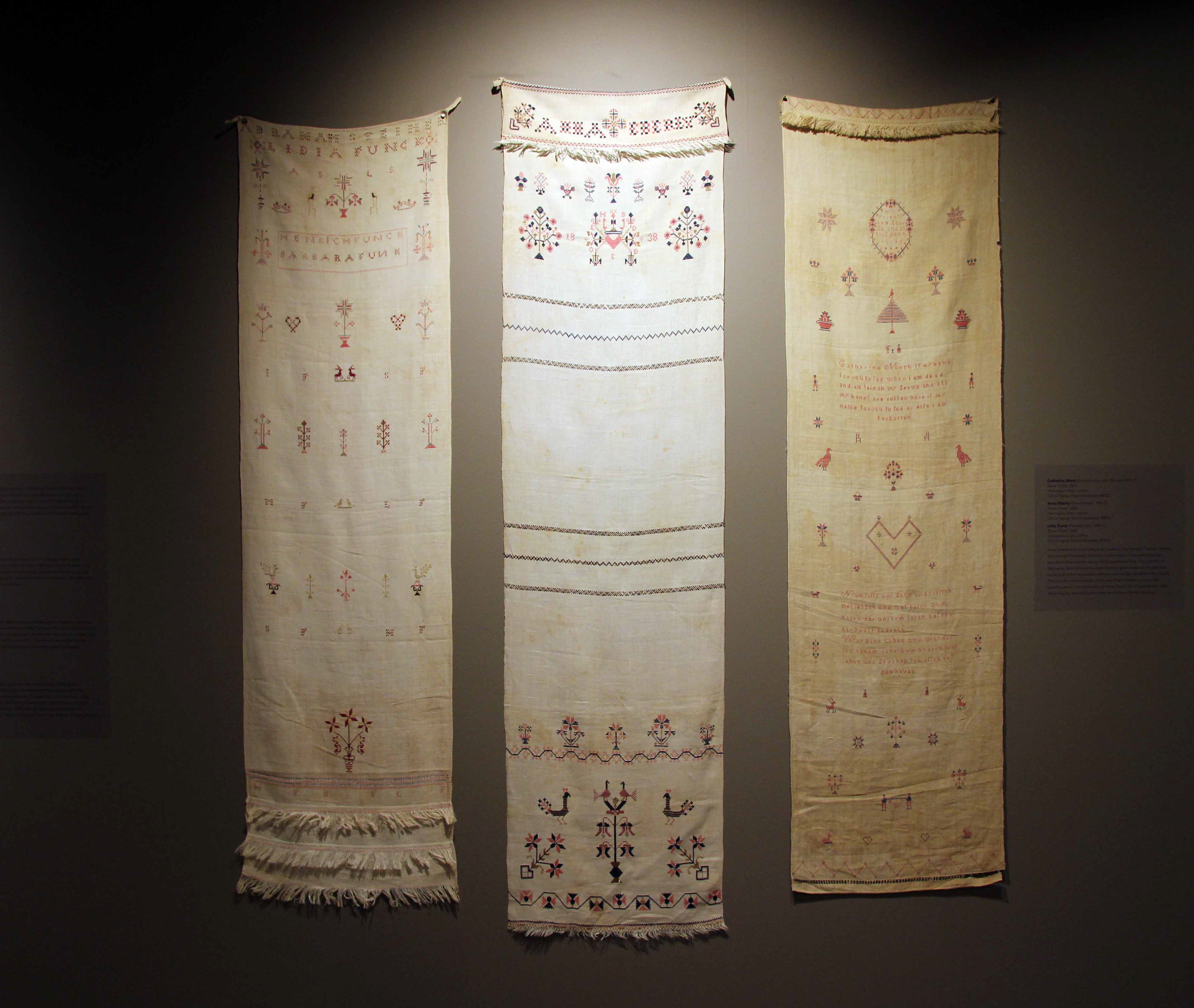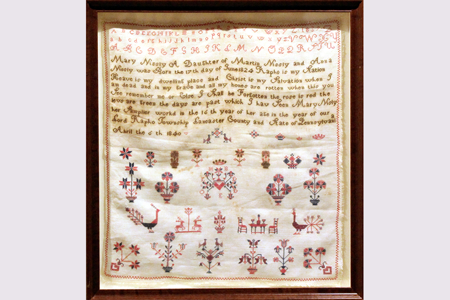 Traditionally, samplers used by Pennsylvania German women in this region were kept folded in a sewing basket and not intended for display. They were for reference when making household textiles. With the influence of English neighbors who had long practiced the art of needlework, samplers and show towels became showpieces.