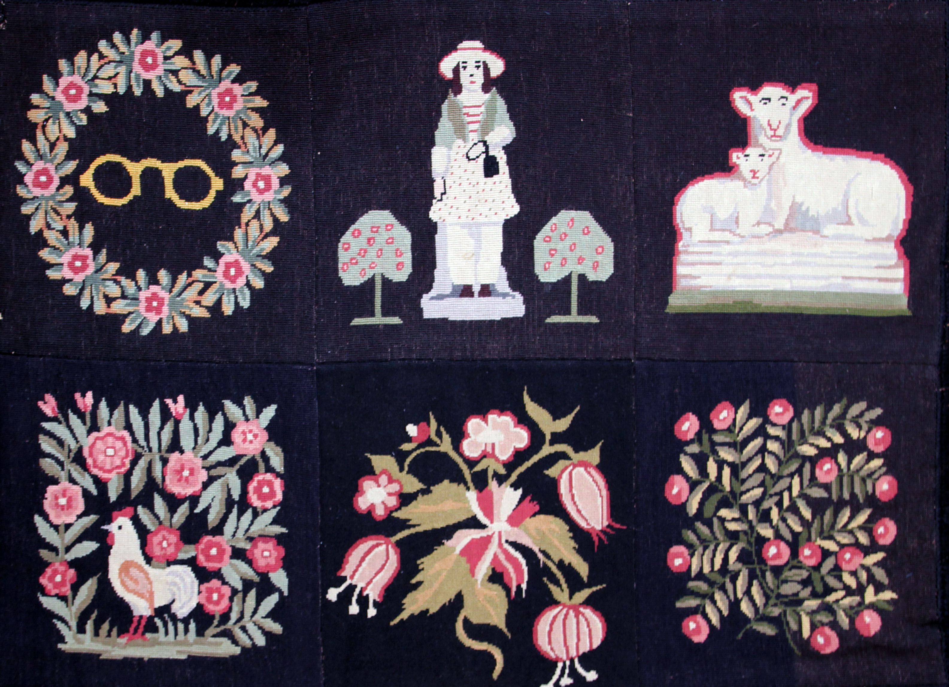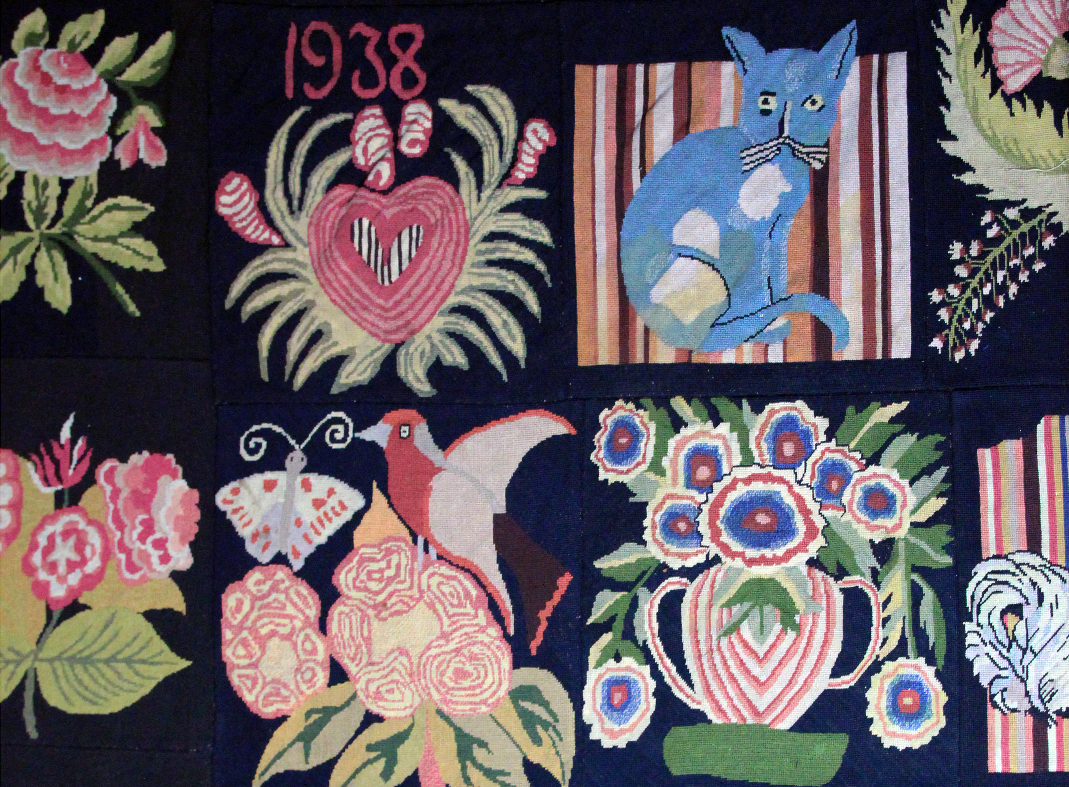Most certainly a project of passion for the craft, the rug was made for her cabin in Upper Black Eddy, Pennsylvania and given to the College in 1958, shortly after her death. The recreation of the 100-year-old patterns helps carry on the importance of these handcrafted stories. Also of note, are the squares that Hardy added to reflect her own life, seen below. The blue cat seen in Hardy’s carpet is part of the original Caswell Carpet patterning and later inspired a children’s book that won the Newbery Honor Medal in 1950.