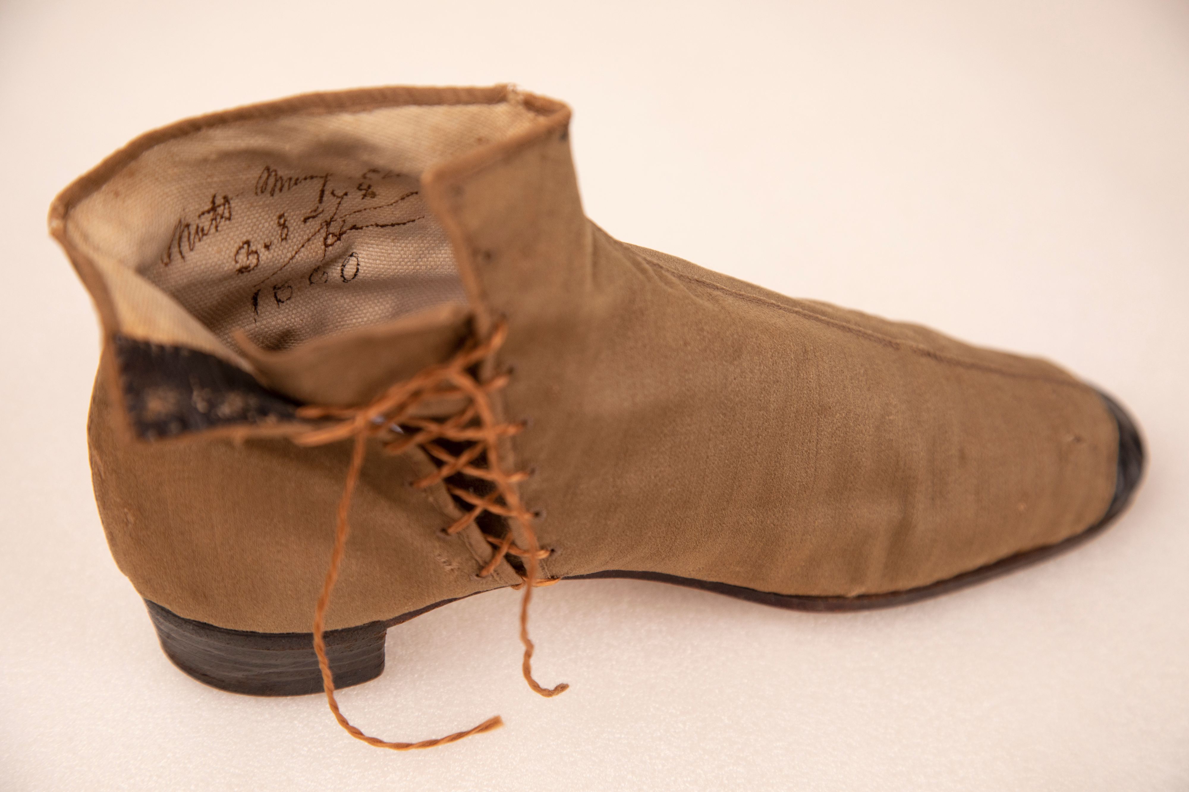 Half boots such as these were first introduced to England during the 1830s as a way to modestly cover a woman’s foot and ankle. The more delicate fabrics like silk tended to be reserved for indoor wear while those made of leather would be used in the muddy streets. There was however a hybrid style, like this pair, which boasted the daintiness of an indoor shoe with a reinforced toe and heel made of leather. Close examination of the interior shows the name of the owner and date that the boots were made.