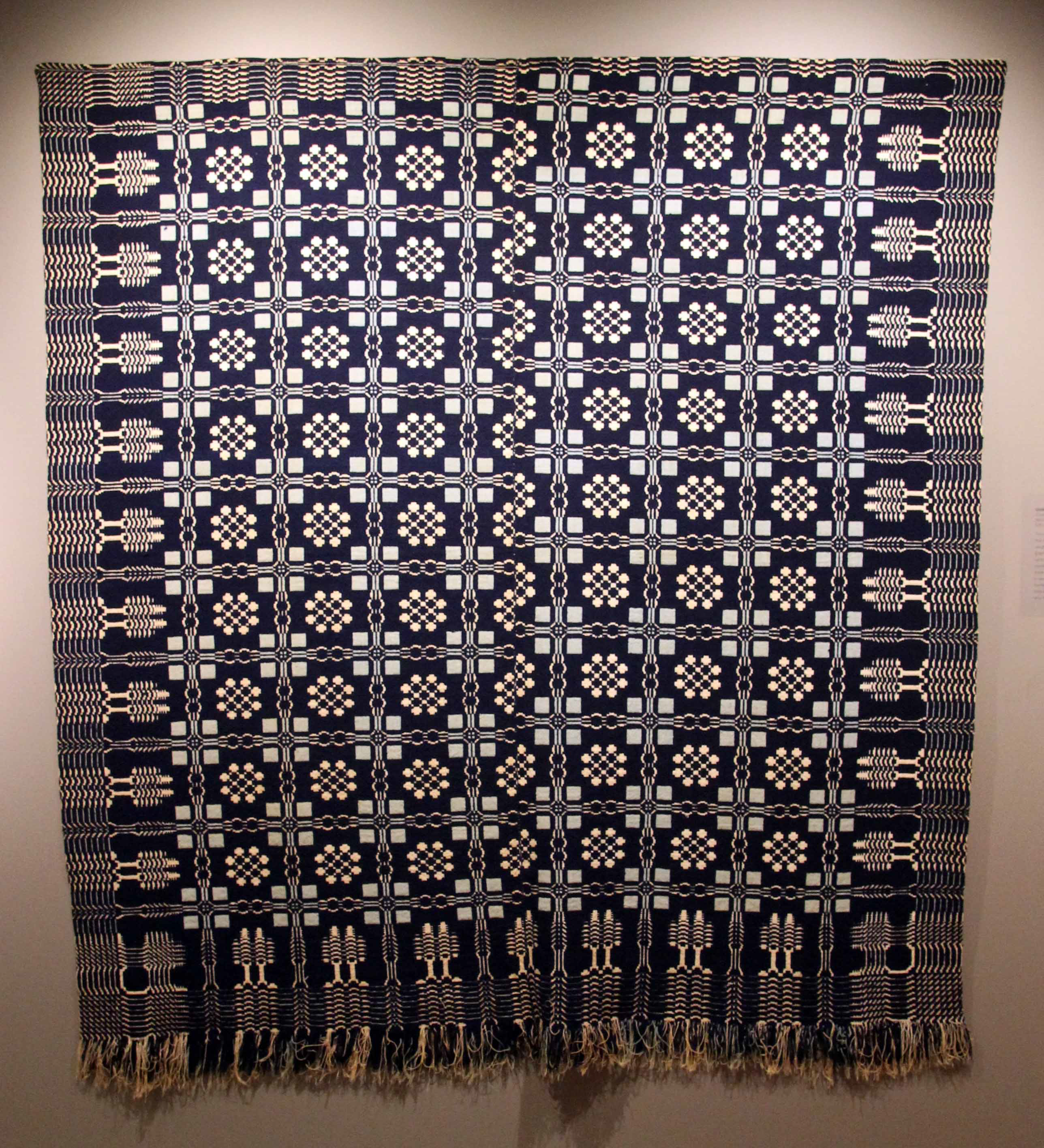 This snowball and pine tree patterned coverlet is made using a technique that includes two intercrossed plain weave structures to give it extra weight and a pattern on both sides. To weave a coverlet with strong graphic motifs like those found here would require a large loom with up to 20 shafts, which hold the threads. Geometric patterning was predominantly found on coverlets from this period. Coverlets such as these would have been made by both women and men specializing in weaving as there wasn’t always space to keep the looms on the homestead. Women were usually responsible for the raw products included in the quilt, which would have required hours of processing the wool for the thread.