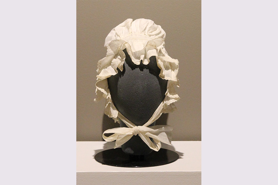 Unidentified seamstress (Pennsylvania, 19th C). Bonnet, c. 1800. Cotton and ink, 9 x 14 x 1" (ties are 14" long). Gift of Mrs. George Ross Eshleman, #2014.00.39.