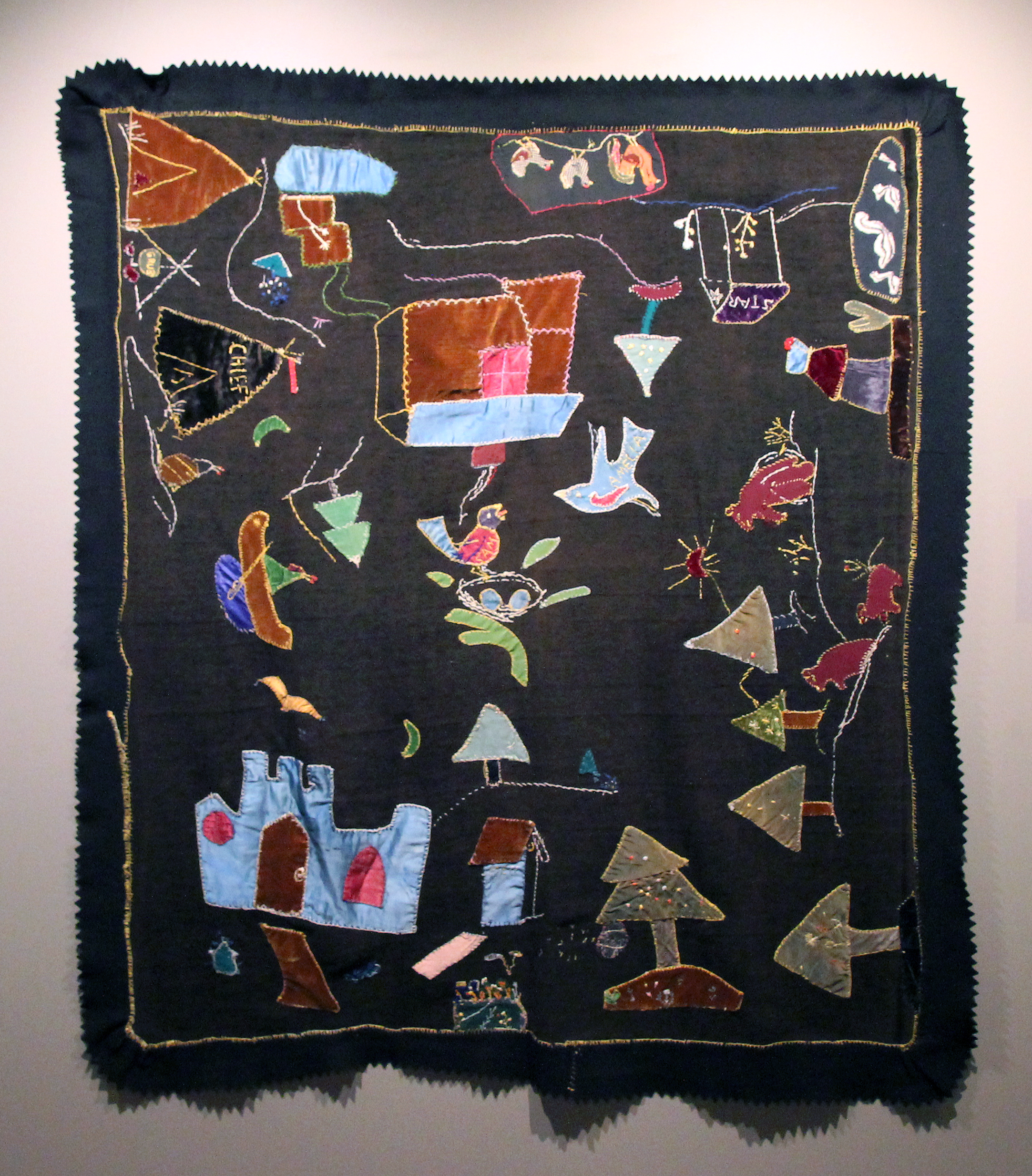 This bed covering was pieced together using several different types of fabric, including silk, velvet, and wool. An extraordinary example of a figurative quilt, it tells a story of childhood, weaving together different scenes and adventures, presumably for Sam and Amelia, the two names stitched in the center. It is possible that this was a child’s project that was worked on with her mother, learning different stitches and applique techniques. In some areas the stitches are quite haphazard, while other stitches convey more complicated concepts like a bird’s wings in flight.