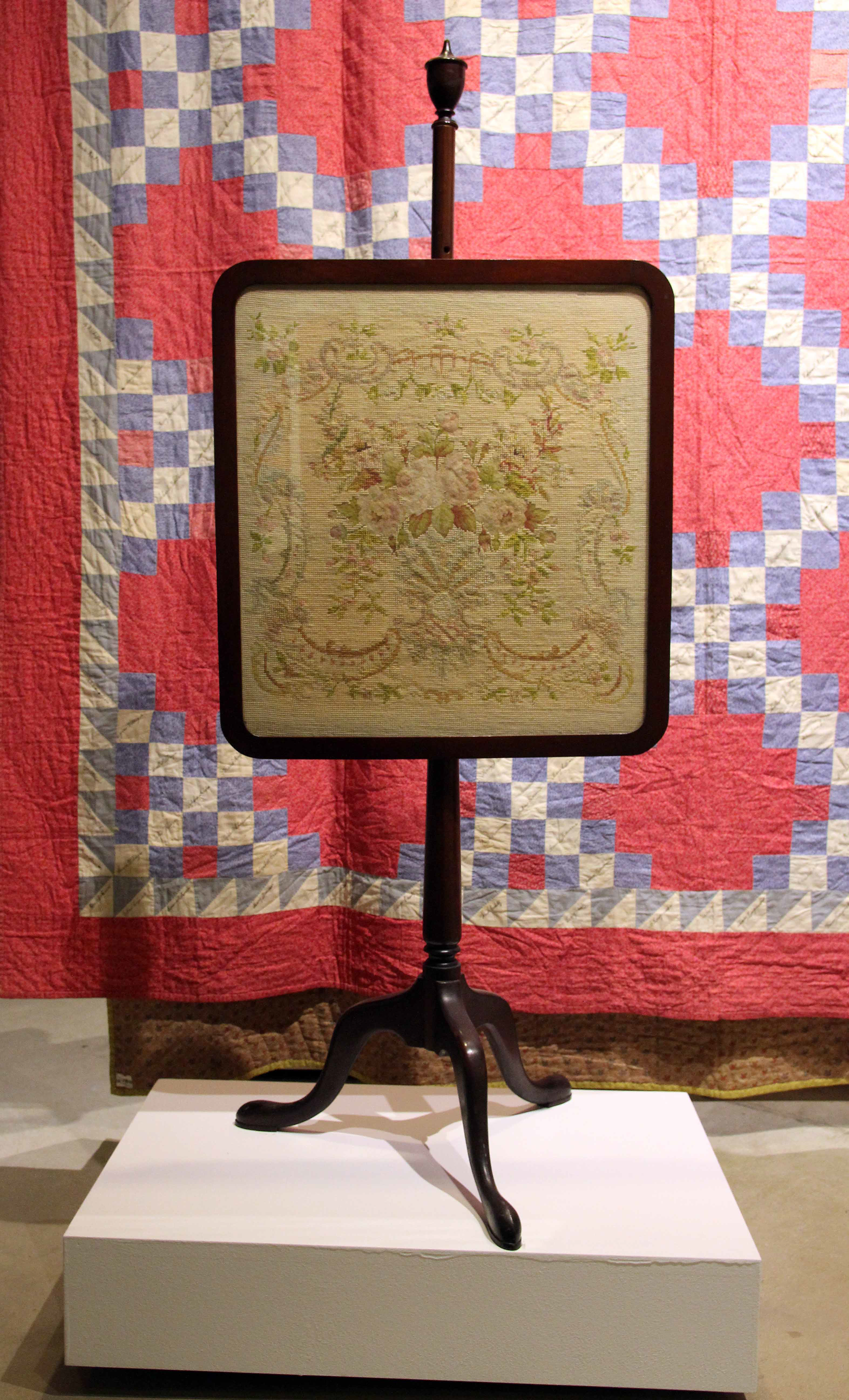 Serena Mayer North Hutchinson (Lancaster County, 19th and 20th C). Unknown craftsman (American, early 20th C). Fire Screen, early 20th C. Embroidery panel and mahogany frame, 53 x 21 x 20". Held in Trust for the Hugh McAllister North, Jr. Estate, #HN4.