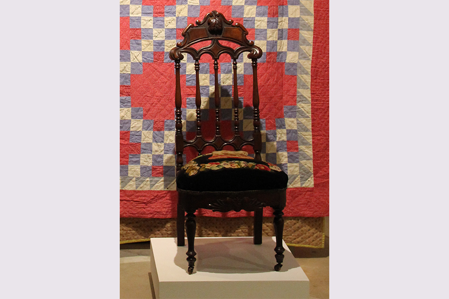 Serena Mayer North Hutchinson (Lancaster County, 19th and 20th C). Unknown craftsman (American, 19th C). Embroidered Chair, c. 1860s and 1900. Wood and wool, 41 1/8 x 19 x 17". Bequest of Serena Mayer North Hutchinson Estate, #2015.00.178.