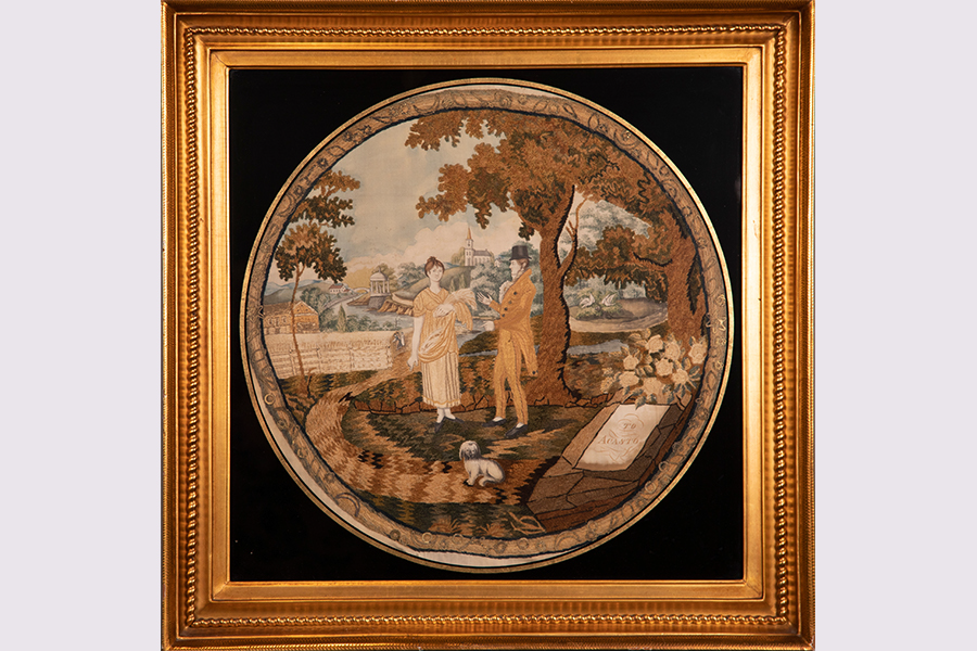 Unidentified maker (Lititz, 19th C). Palemon and Lavinia Needlework, c. 1815–1825. Silk, chenille, metallic threads, and paint on silk with metallic spangles, 24 x 24" (framed). Bequest of Ida K. Hostetter, #4869.