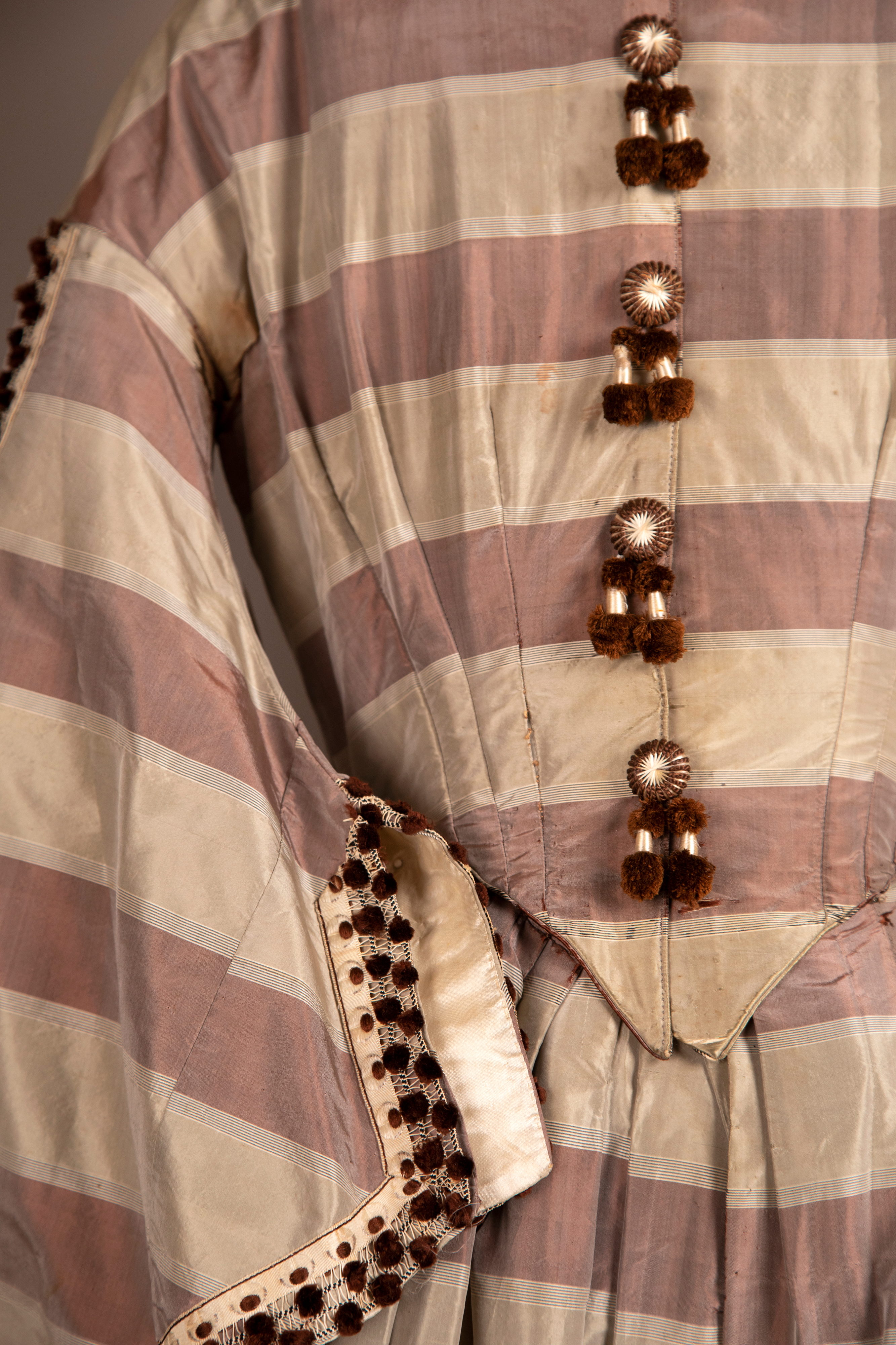 This is a sophisticated silk dress with handmade tassel ornamentation and wide, conical “pagoda” sleeves typical of the 1860s. The female silhouette during the middle of the 19th century consisted of a fitted corseted bodice and wide full skirts. The fabric would have probably been imported to Philadelphia, before being made by a seamstress in the region. Seamstresses often worked out of their own homes, contributing to their family’s income. The hemline is all hand stitched and a pin used in the addition of a water-resistant band along the hem is still present. It is possible that sleeves were worn under this dress, as well as a decorative collar, as can be seen in the ambrotype above of a regional woman wearing a very similar dress.