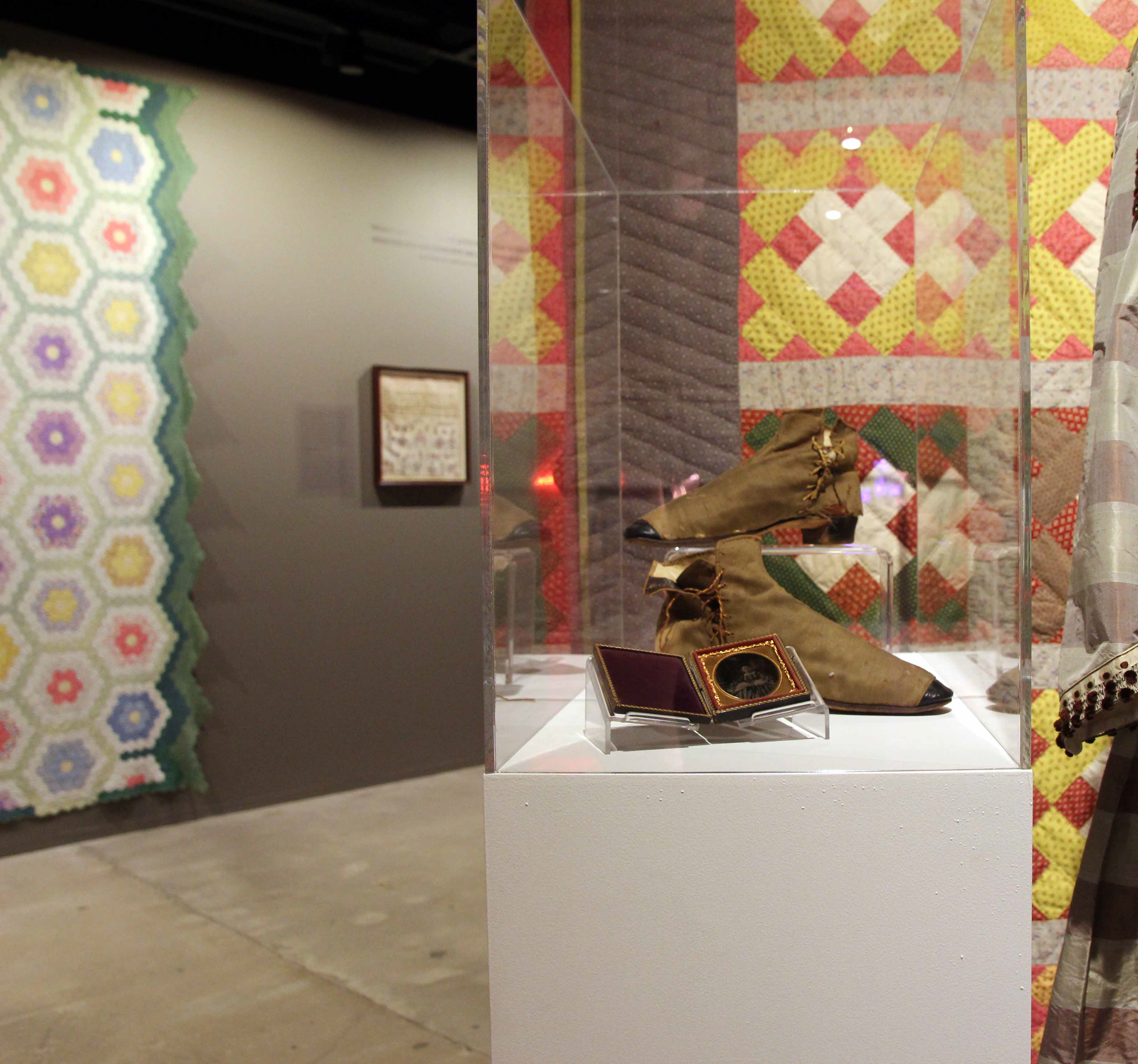 Unidentified craftsperson (American, early 20th C). Boots, c. 1900. Canvas, leather, and milk glass, 6 x 9 x 3". Phillips Museum of Art Collection, #2013.00.256.