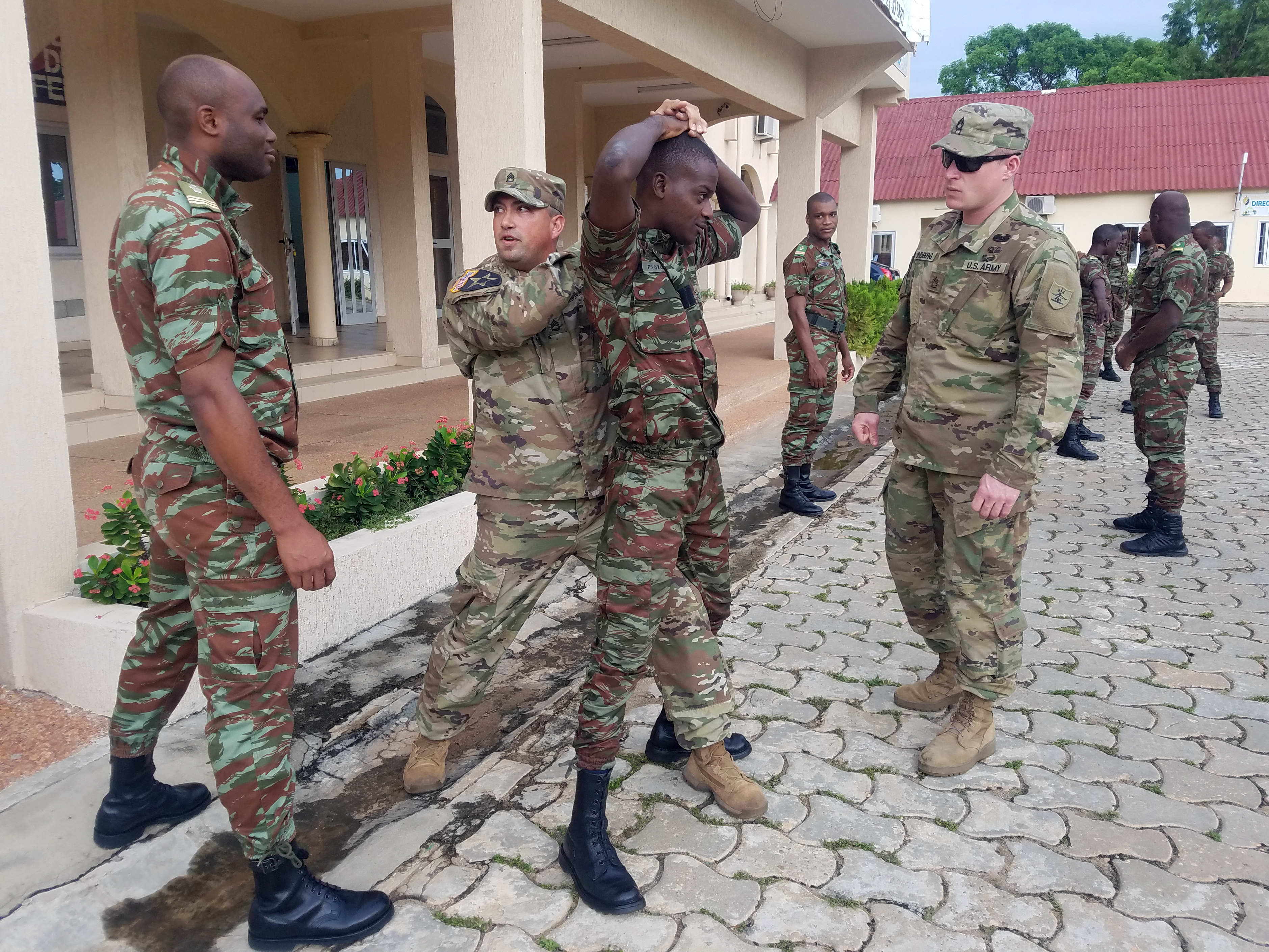 The State Partnership Program relationship between the North Dakota National Guard and the Republic of Benin began in 2014. The objective of the State Partnership Program is to provide low cost high impact engagements between stakeholders to share ideas and experiences in support of U.S. Embassy, the Department of Defense, and Combatant Commanders goals. The most common forms of engagements between the NDNG and the Republic of Benin focus on disaster preparedness and this example which is a military to military engagement. Sgt. 1st Class Ryan Lindberg, 817th Engineer Company (SAPPER) and Sgt. 1st Class Rithy (Mike) Yem, 818th Engineer Company (SAPPER) participated in a Combat Engineer event in Cotonou, Benin, which showcased their flexibility to demonstrate not only combat engineer skills (Counter IED awareness), but also skills important to peacekeeping operation requirements in Africa. The peacekeeping skills included entry control point tasks which include how to effectively and safely conduct personnel and vehicle searches. These engagements also assist in sharpening the NDNG Soldiers skills by utilizing a french interpreter during the two week engagement which reinforces operating in expeditionary environments.