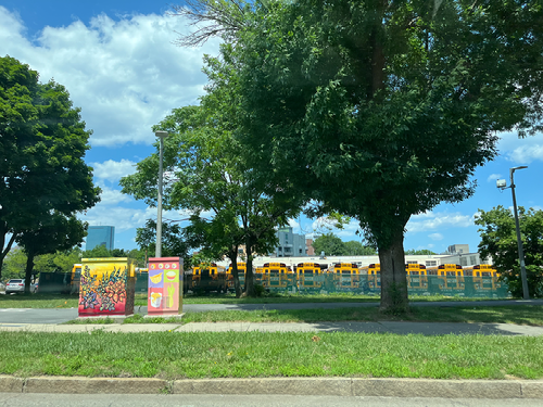 Feature photo: School buses lined up in a Boston parking lot. (Mary Deng/NEHSJC)