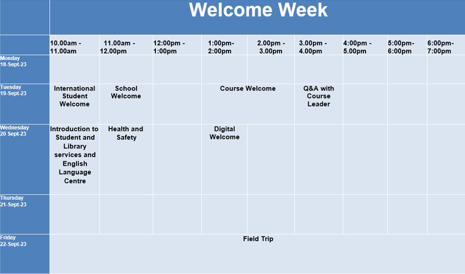 Within Welcome Week, you will have allocated time to meet the students and introduce them to the Course Team. This can be in any format you wish to use, and you may like to include a coffee morning or a Q&A session. Please note that this should be separate from the students meeting their Personal Tutor.