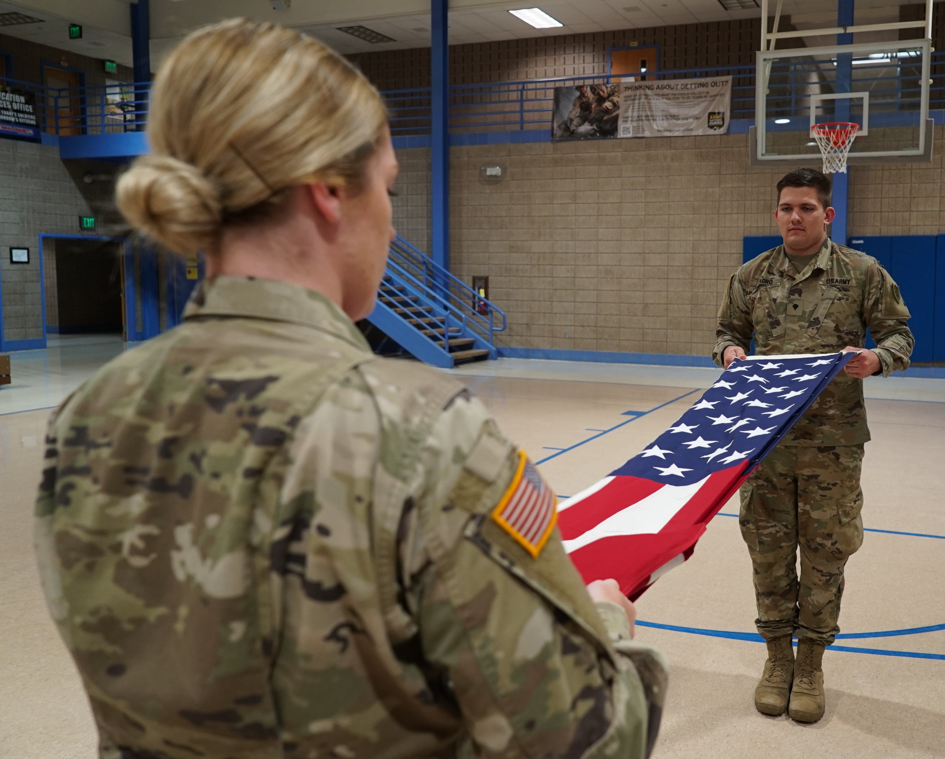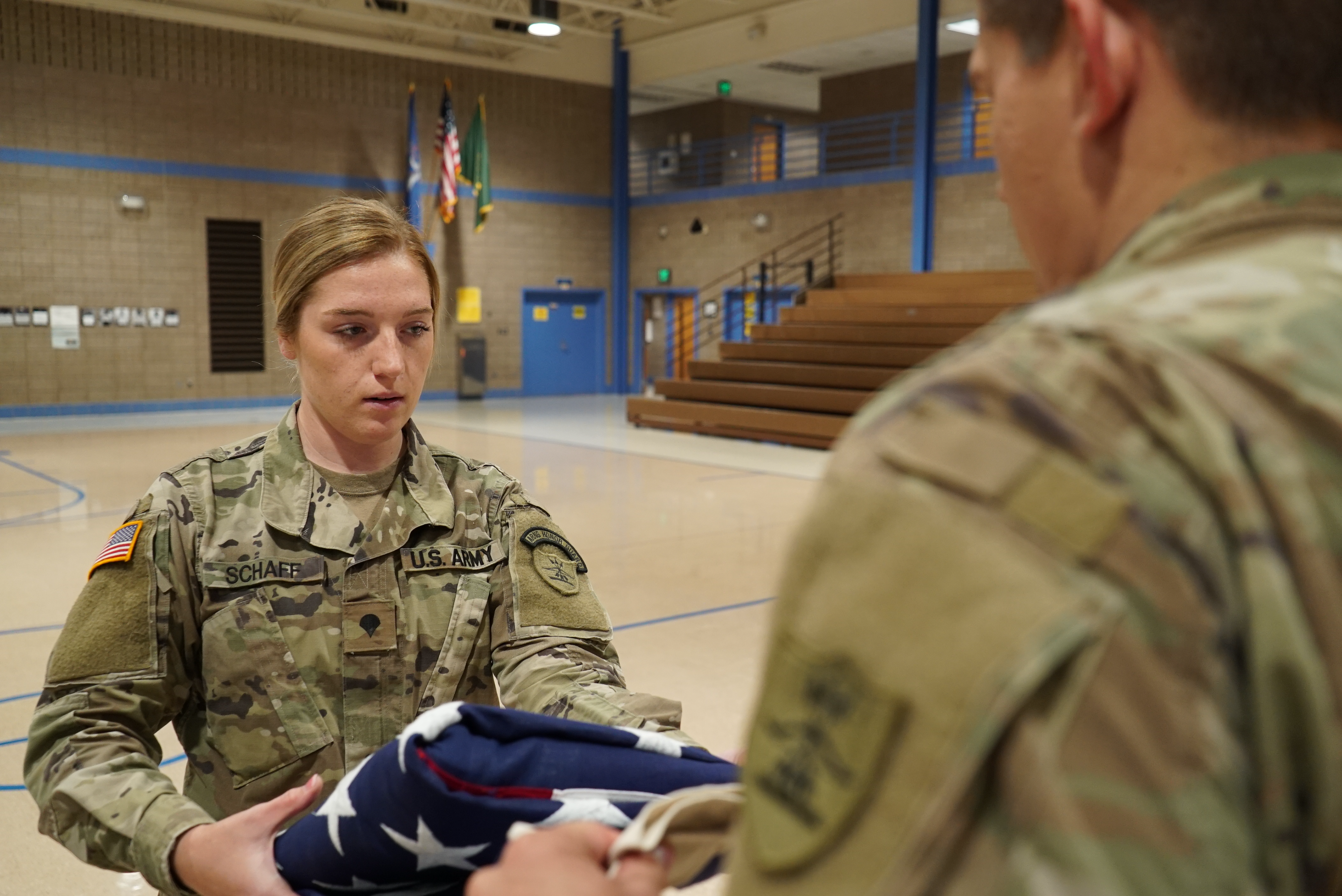 Spc. Sidney Schaff, left, 957th Engineer Company, folds a U.S. flag towards new honor guard member Spc. Taylor Lagro, 3662nd Support Maintenance Company during military funeral honors training at the Raymond J. Bohn armory in Bismarck, N.D. on Aug. 28.