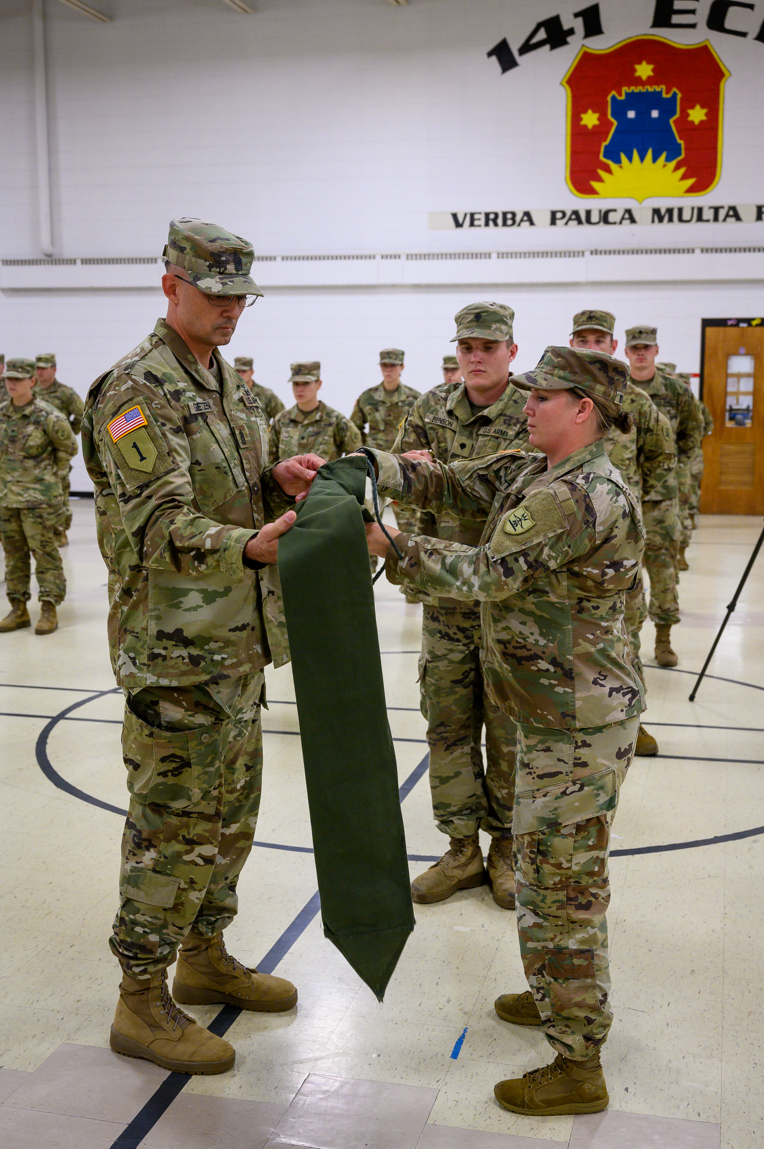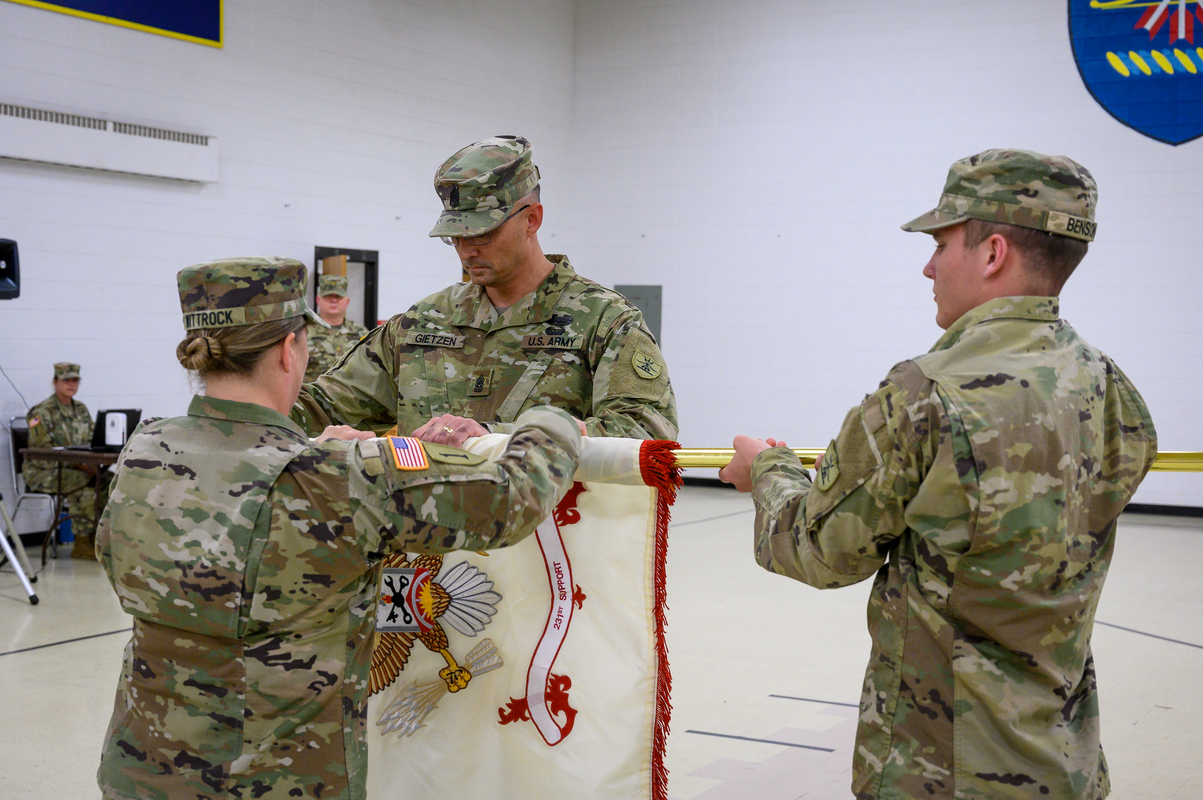 The command team of the 142nd Engineer Battalion, Lt. Col. Anna Wittrock and Command Sgt. Maj. Gabe Gietzen prepare the colors of 231st Brigade Support Battalion for retirement during a ceremony at Valley City on Aug. 29.