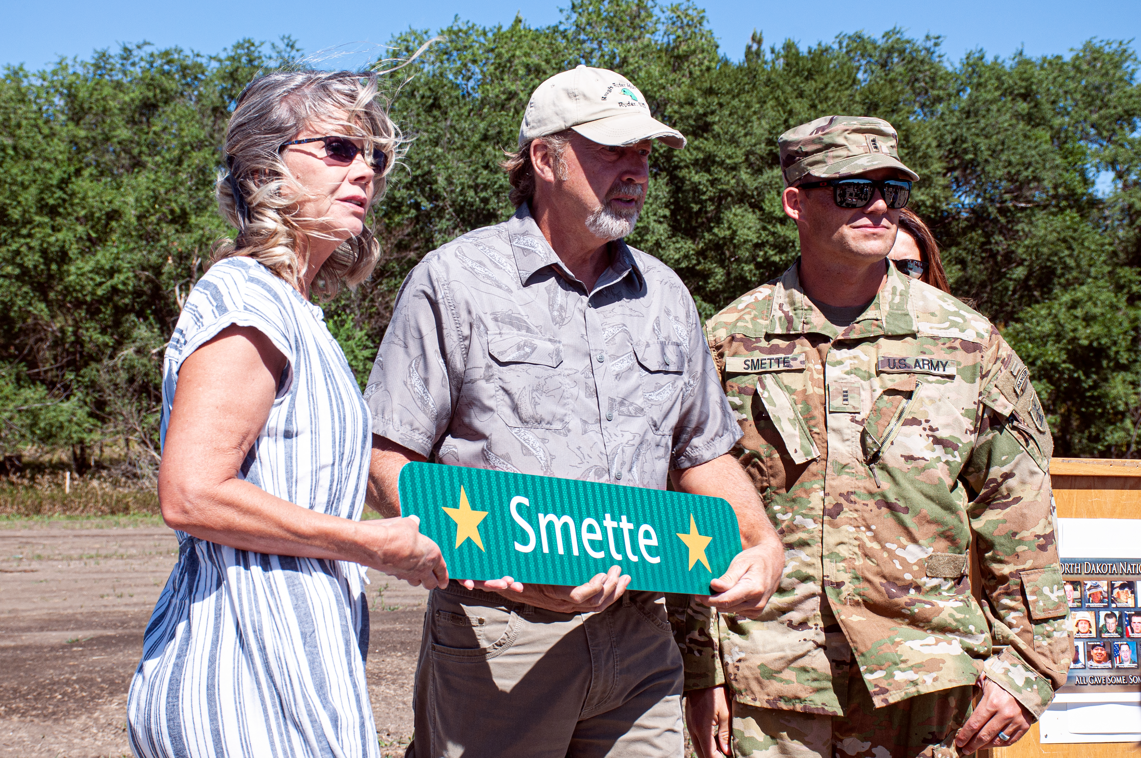 A street sign dedicated to fallen N.D. Guard Soldier Sgt. Keith Smette was presented to his family during a dedication of Street and Heroes Park in east Bismarck. Smette's parents Char and Doug hold the sign accompanied by his brother, Chief Warrant Officer 3 Robbie Smette.