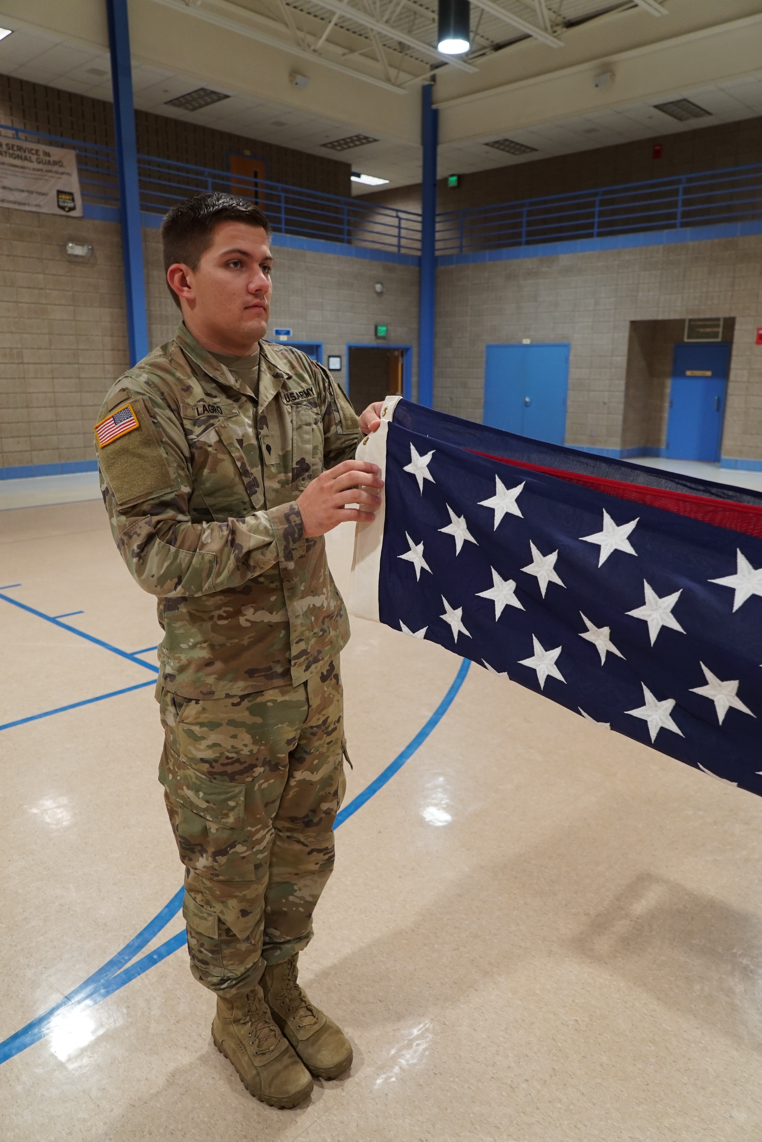 Spc. Sidney Schaff, left, 957th Engineer Company, helps new Military Funeral Honors member Spc. Taylor Lagro, 3662nd Support Maintenance Company, practice flag folding at the Raymond J. Bohn armory in Bismarck, N.D. on Aug. 28, 2020.