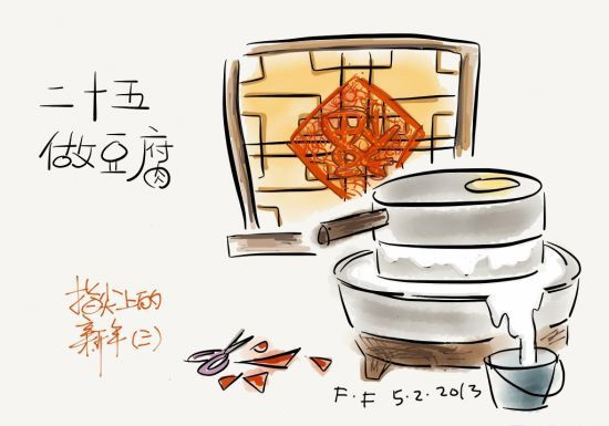 Πέντες ημέρες πριν την Παραμονή, οι Κινέζοι φτιάχνουν Τόφου (φαγητό που μοιάζει με το τυρί αλλά είναι κατασκευασμένο από σόγια). Ο θρύλος λέει ότι την ημέρα αυτή ο Επουράνιος Αυτοκράτορας (Jade Emperor) ή Επουράνιος παππούς, έρχεται στον γήϊνο κόσμο για να επιθεωρήσει την ζωή των ανθρώπων. Οι άνθρωποι τρώνε Τόφου για να δείξουν λιτότητα βίου και την καλή διαχείριση των αγαθών τους.