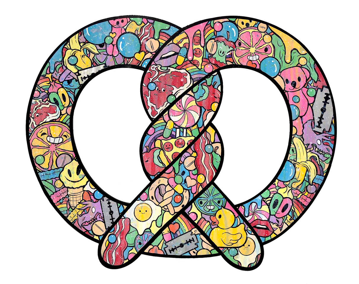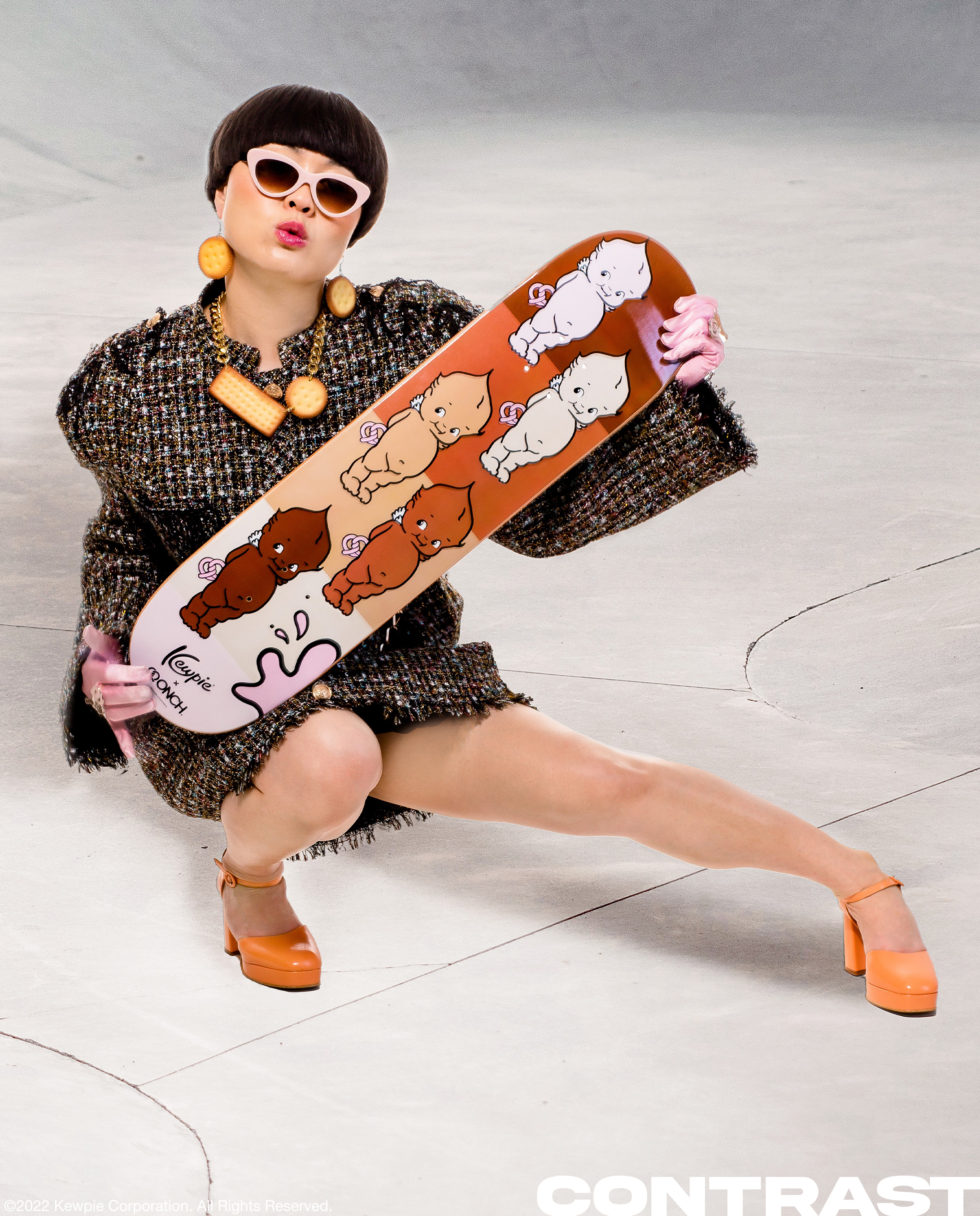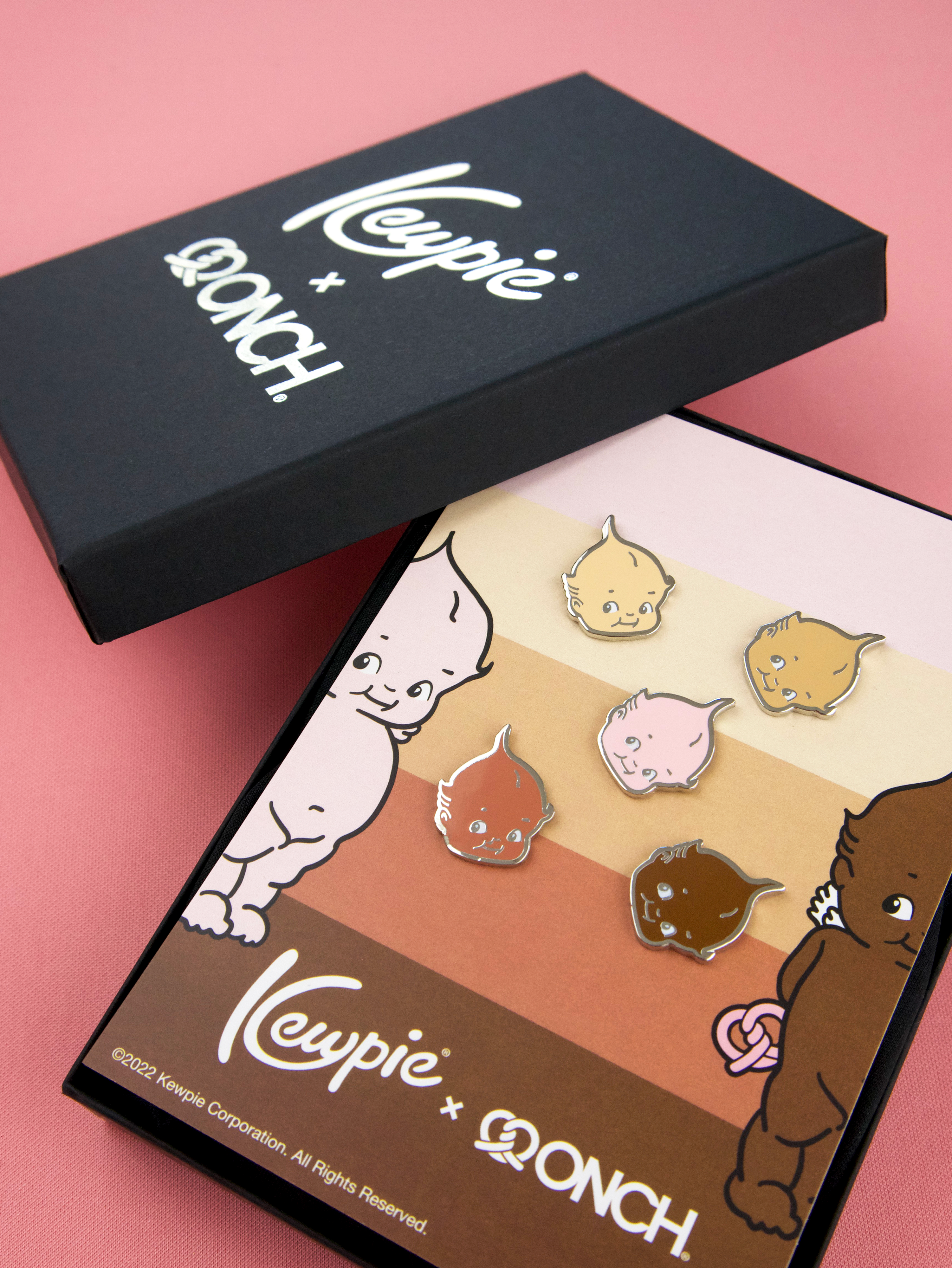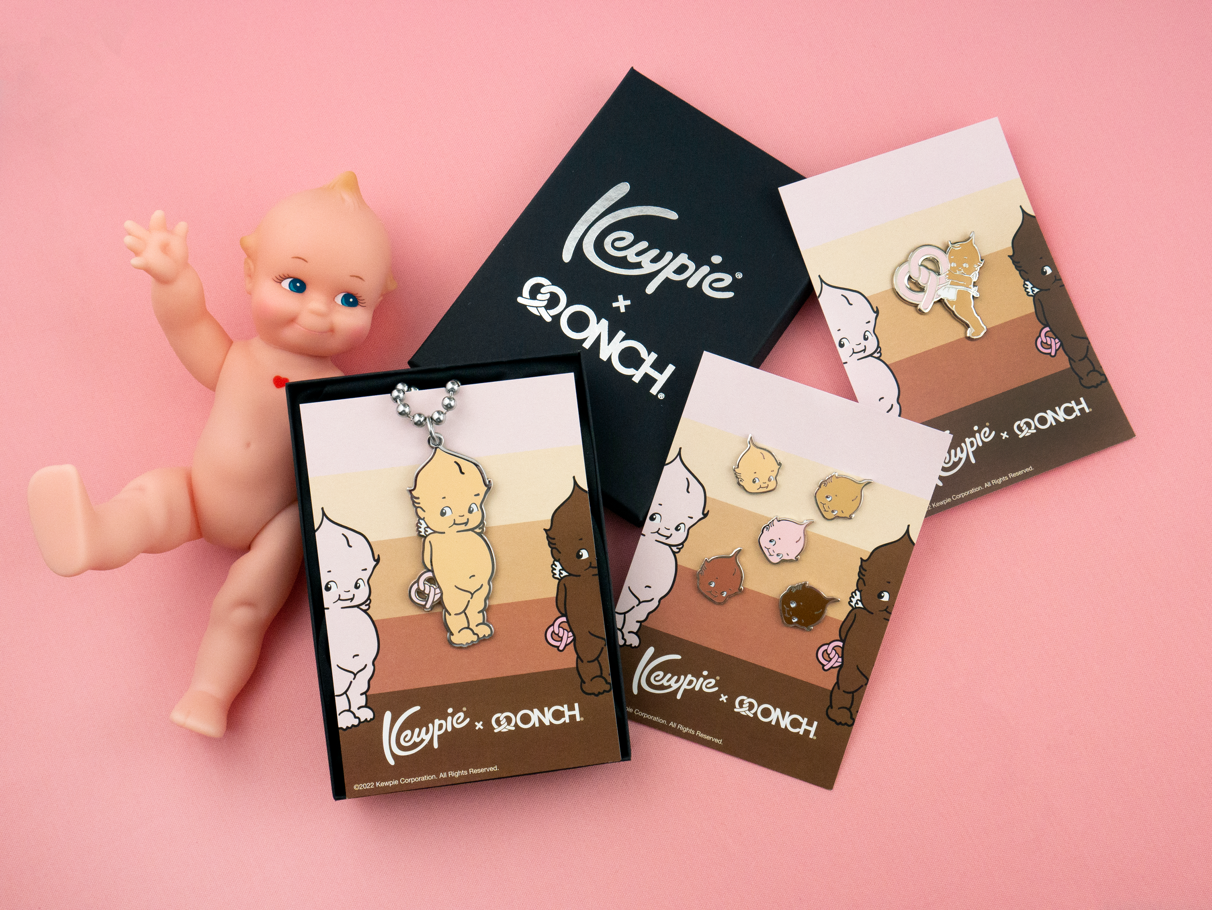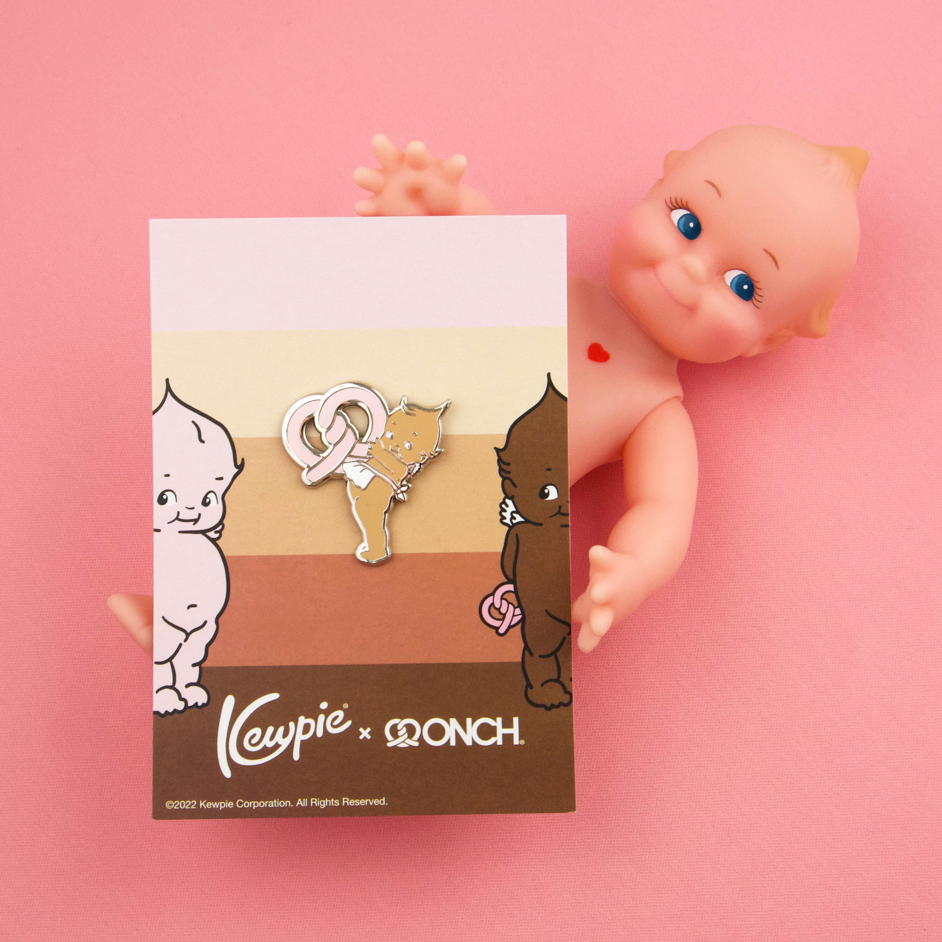 Holiday 2022 - Kewpie® x ONCH teamed up to reimagine the beloved Kewpie characters through a vibrant collection of jewelry and skateboards designed by ONCH. This first-of-its-kind line of Kewpie skin tone–inclusive products celebrates individuality and unity. Featuring enamel earrings, pins, necklaces, and a signature skateboard deck, each piece showcases Kewpie holding ONCH’s iconic double-twist pretzel—a symbol of the heart intertwined with DNA, representing the universal bond beyond skin color.