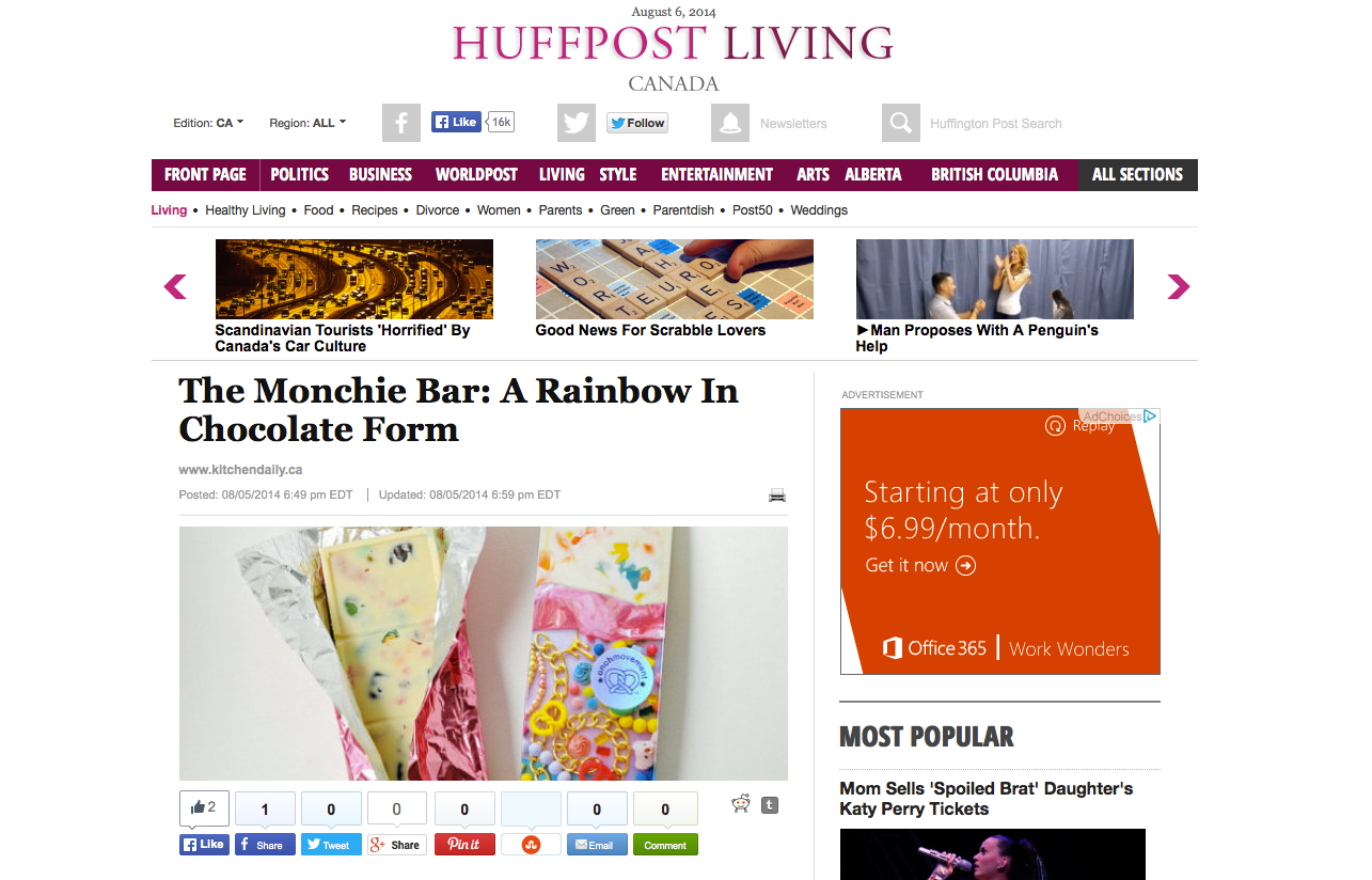Fall 2014 — SWEET! Hollywood the renowned candy store, collaborated with ONCH to create the innovative Monchie Bar. This white chocolate bar, infused with Fruity Pebbles, Sour Patch Kids, Mochi and Nerds, offers a playful and unexpected flavor combination. Praised by food critics as a “rave in your mouth,” the Monchie Bar was featured in prominent outlets including Huffington Post, Refinery29, Chow.com, PopSugar, and was named among MSN’s Top 10 snacks.