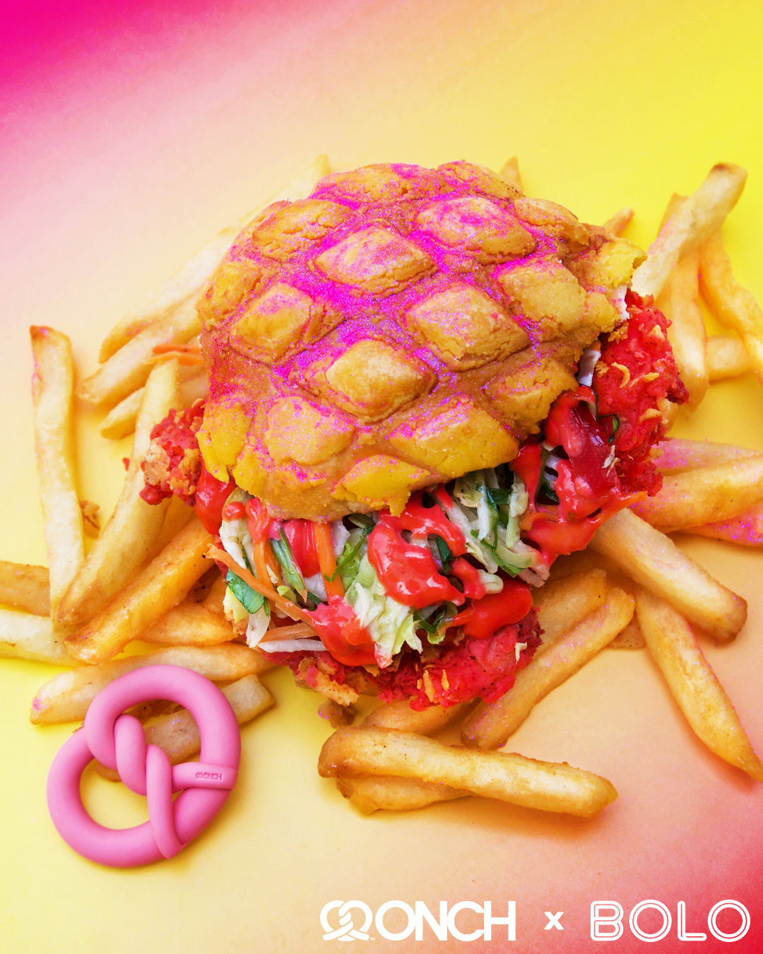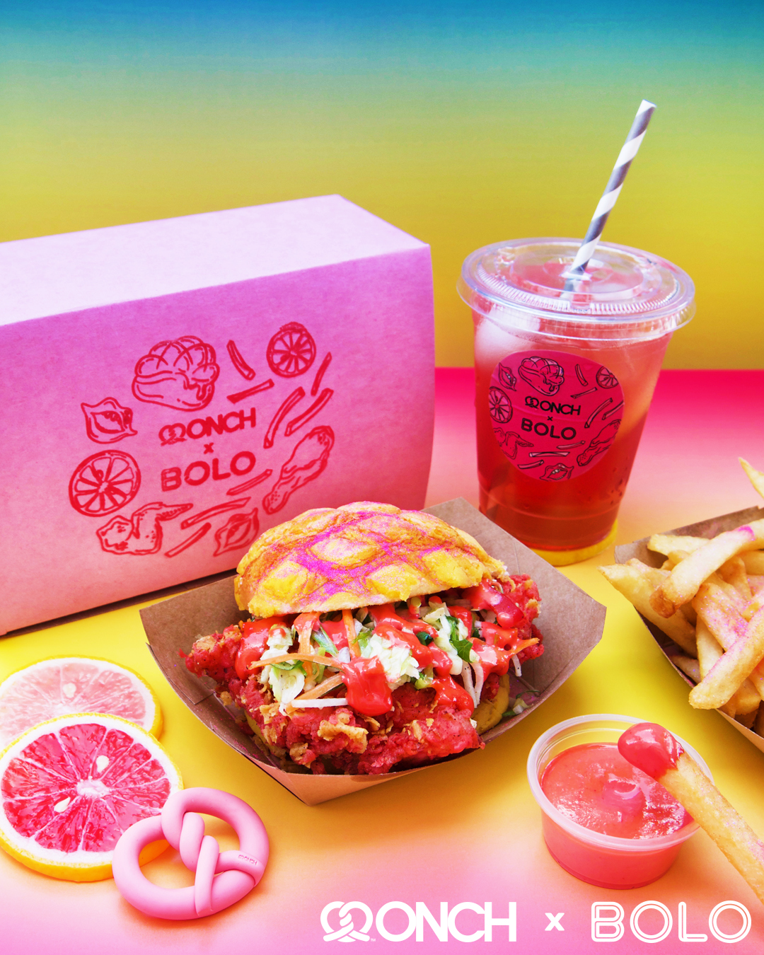 Summer 2018 — BOLO and ONCH partnered to bring the iconic Pink Fried Chicken Box to life, featuring the signature pink fried chicken made famous by ONCH and worn by Nicki Minaj. This edible set includes dragon fruit–dyed pink chicken breasts coated in shimmering edible pink glitter, paired with pink glitter fries, pink aioli sauce, pink hibiscus juice, and a mini ONCH pretzel necklace as a gift—offering fashion lovers a unique, immersive experience inspired by one of ONCH’s most celebrated creations.