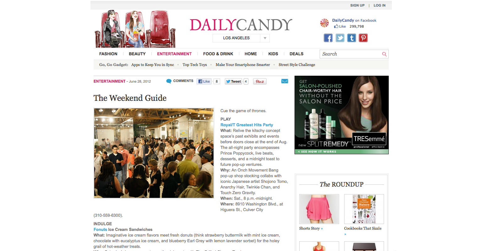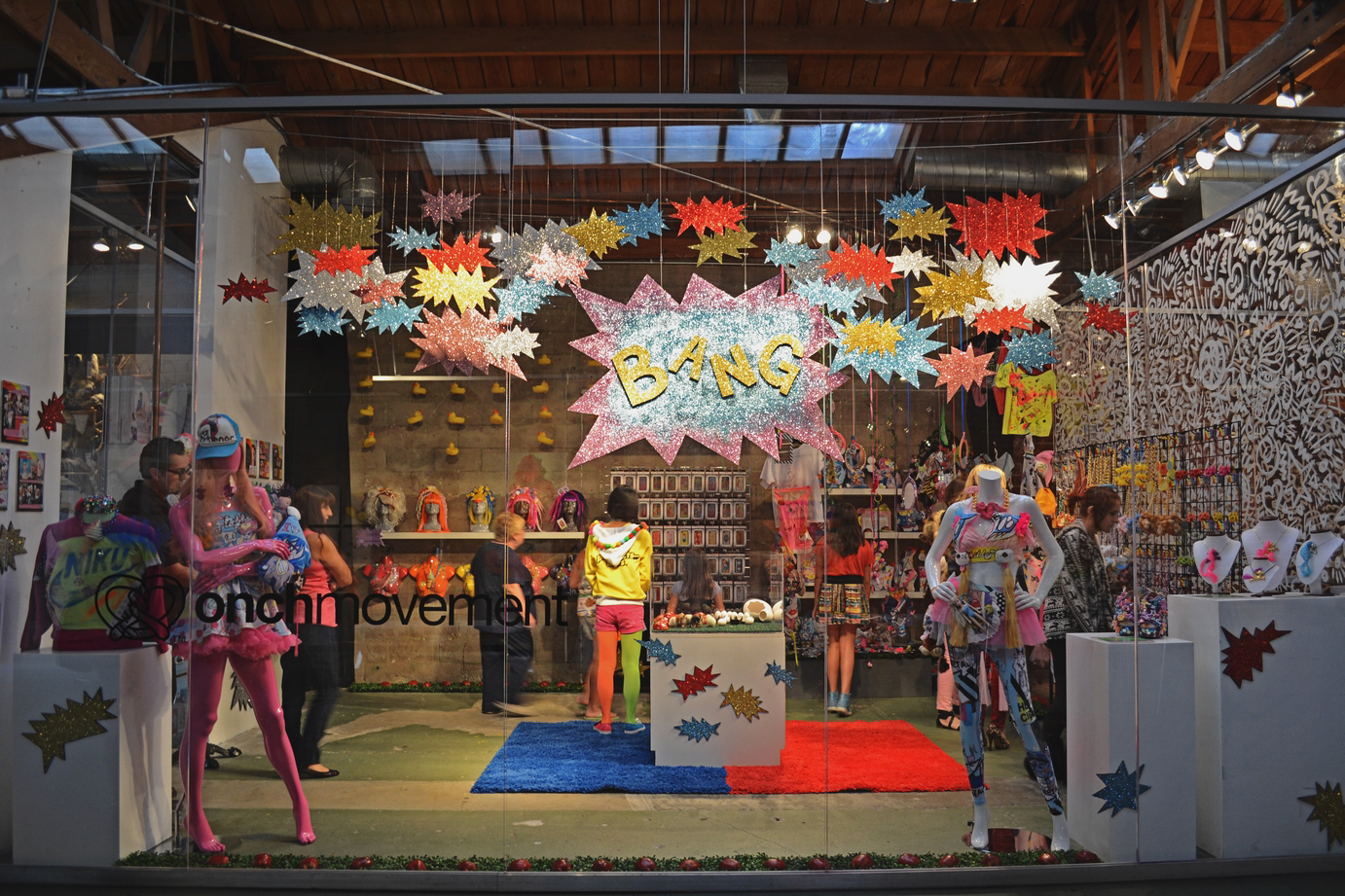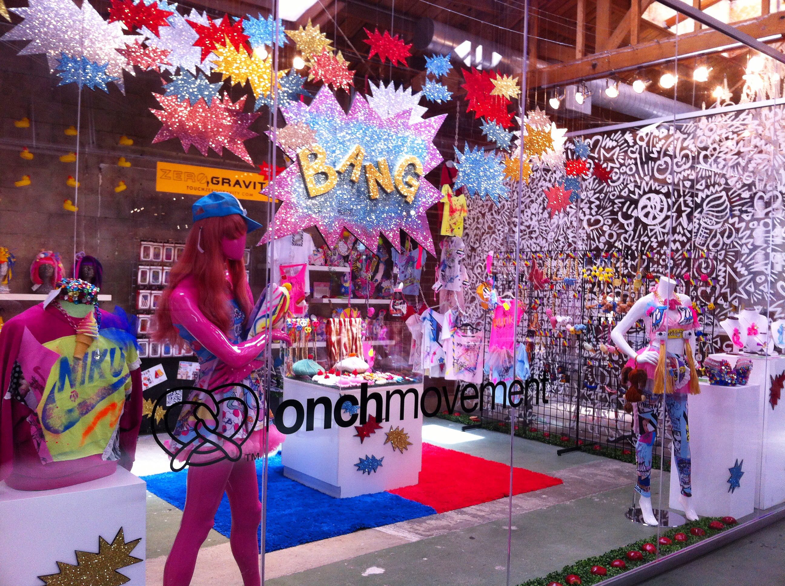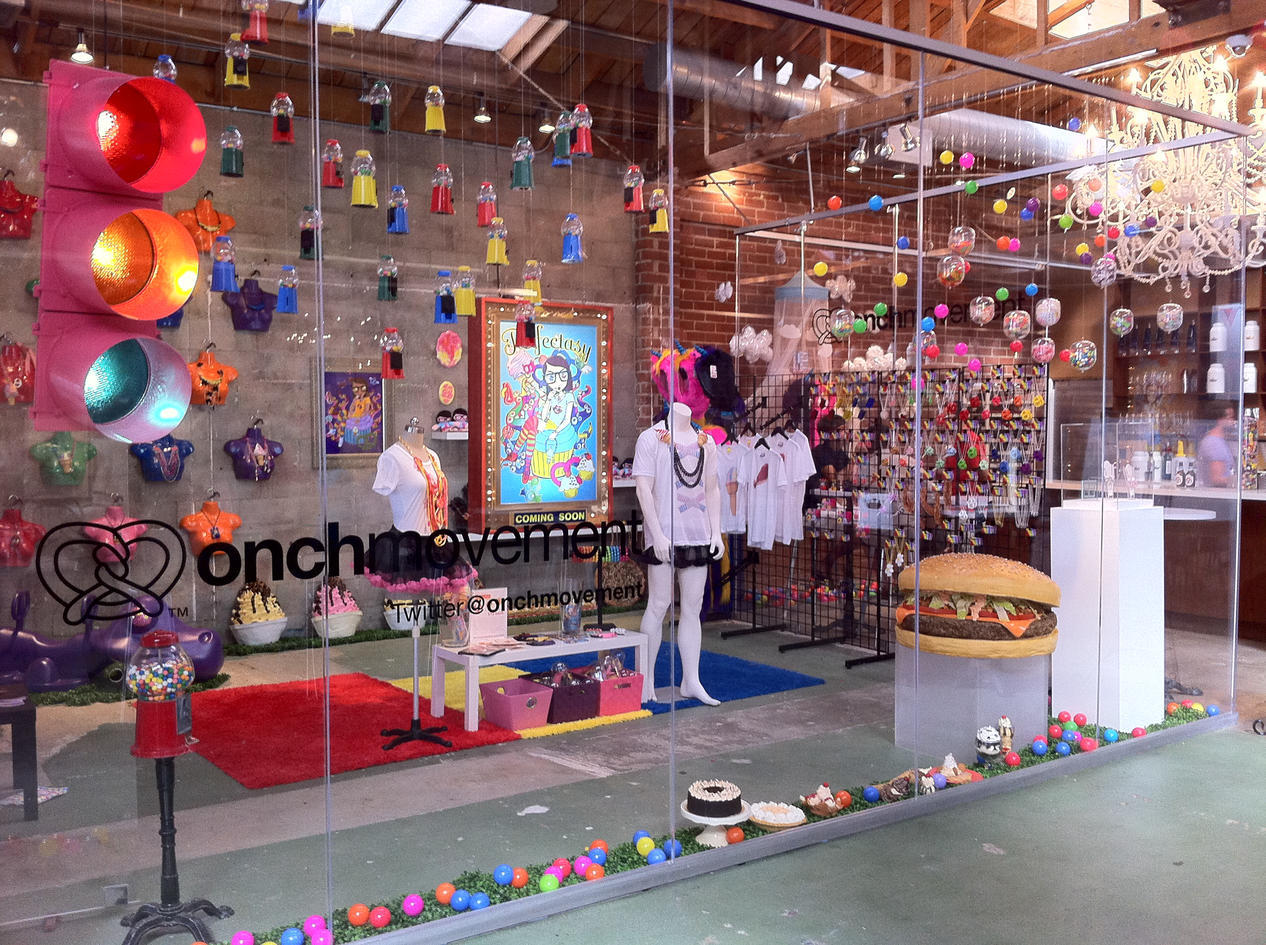 ONCH has produced three successful immersive pop-up shops, Eat It All (Spring 2011), Perfectasy (Summer 2011) and BANG! (Summer 2012), showcasing exclusive wearable art and collaborations with notable brands including Jason of Beverly Hills (fine jewelry), ZeroGravity (phone cases), Twinkie Chan (crochet accessories), and T-Rains (apparel). These installations garnered significant press attention for their innovative retail experience. The BANG! pop-up notably served as the location for a Nickelback music video, highlighting its cultural impact.