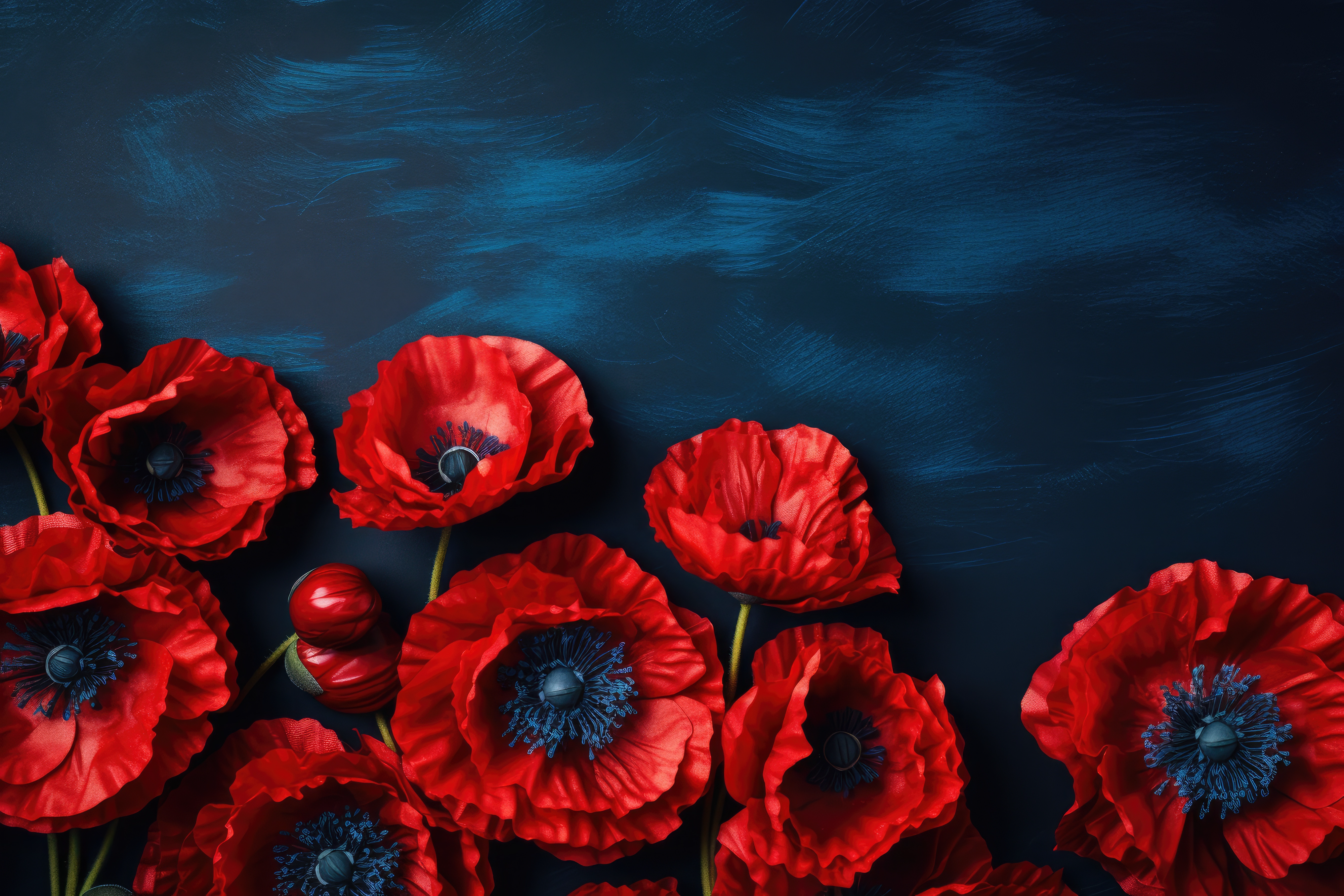 Created with an image by netrun78 - "Banner with red poppy flowers on blue background, symbol for remembrance, memorial, anzac day"