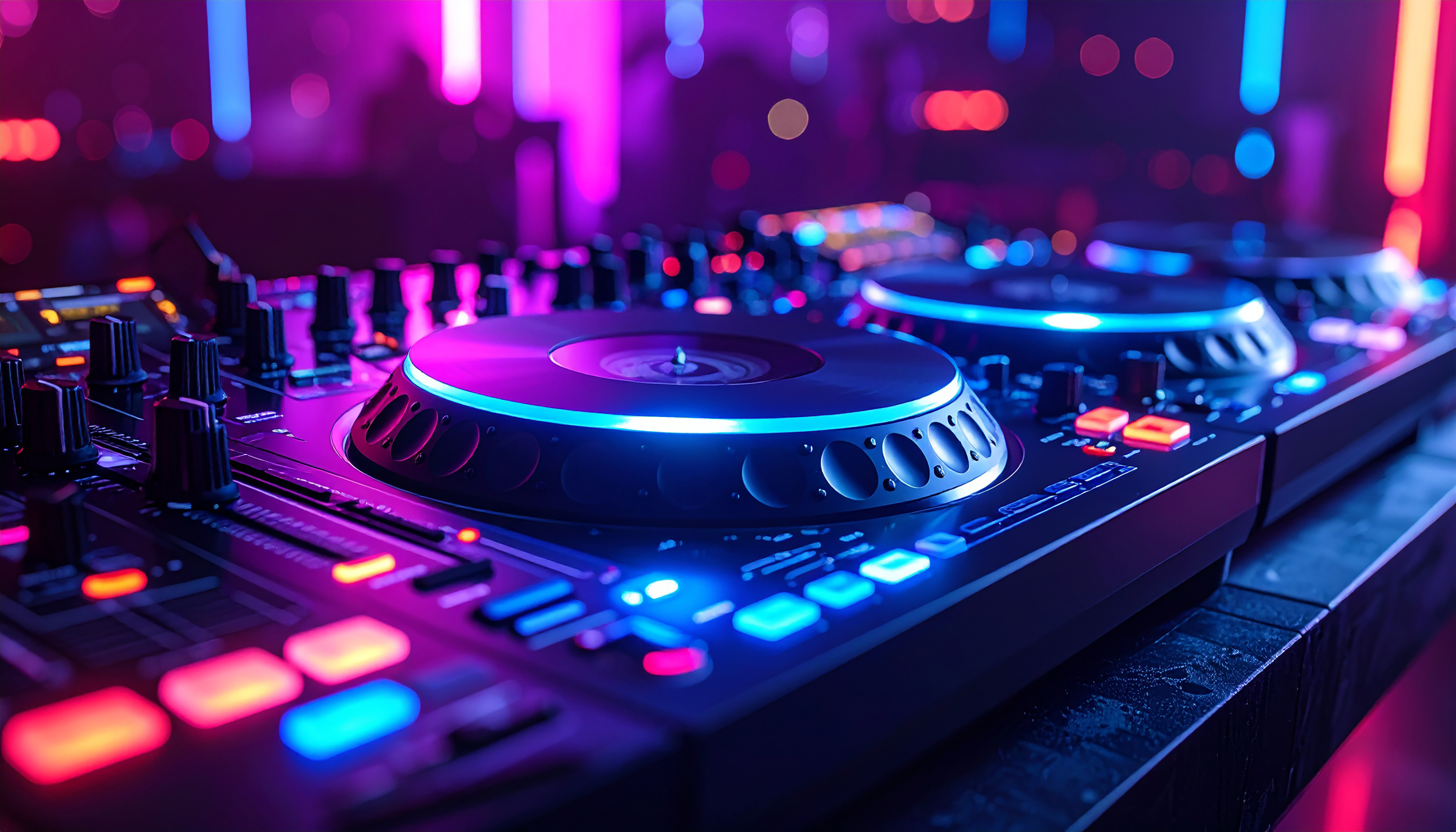 Created with images by Viesturs - "DJ headphones on a vinyl player in a dark nightclub, selective focus" • NextGen11 - "Close-up of a futuristic DJ table with glowing LED buttons, turntables, mixer sliders, neon ambient lighting, in a dark club environment"