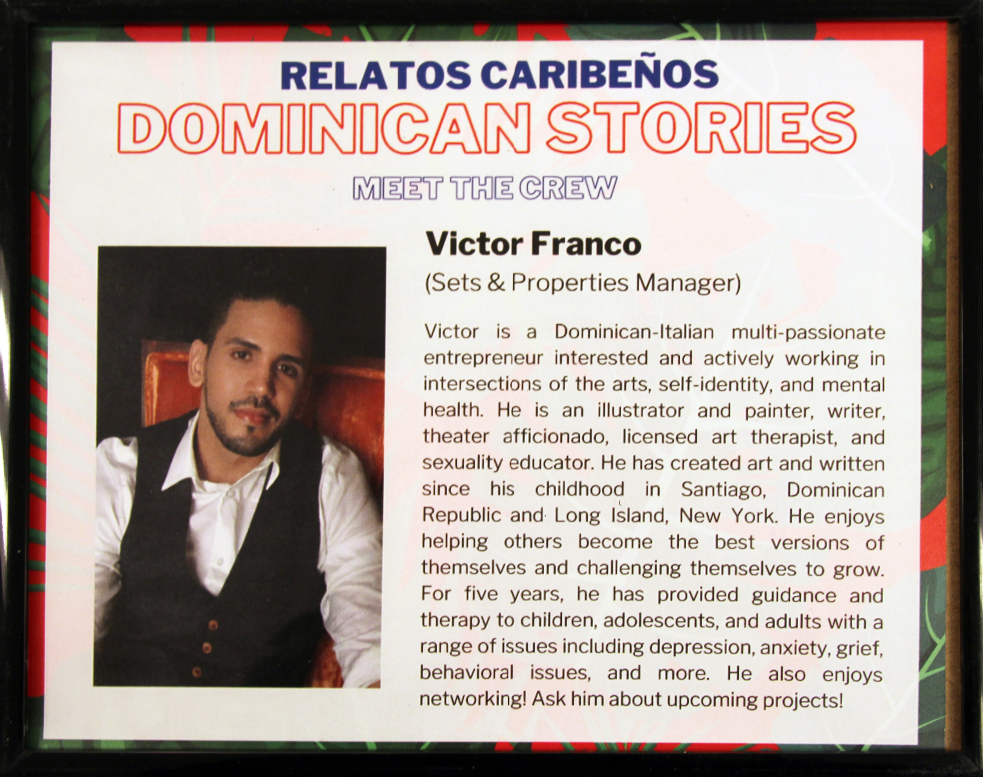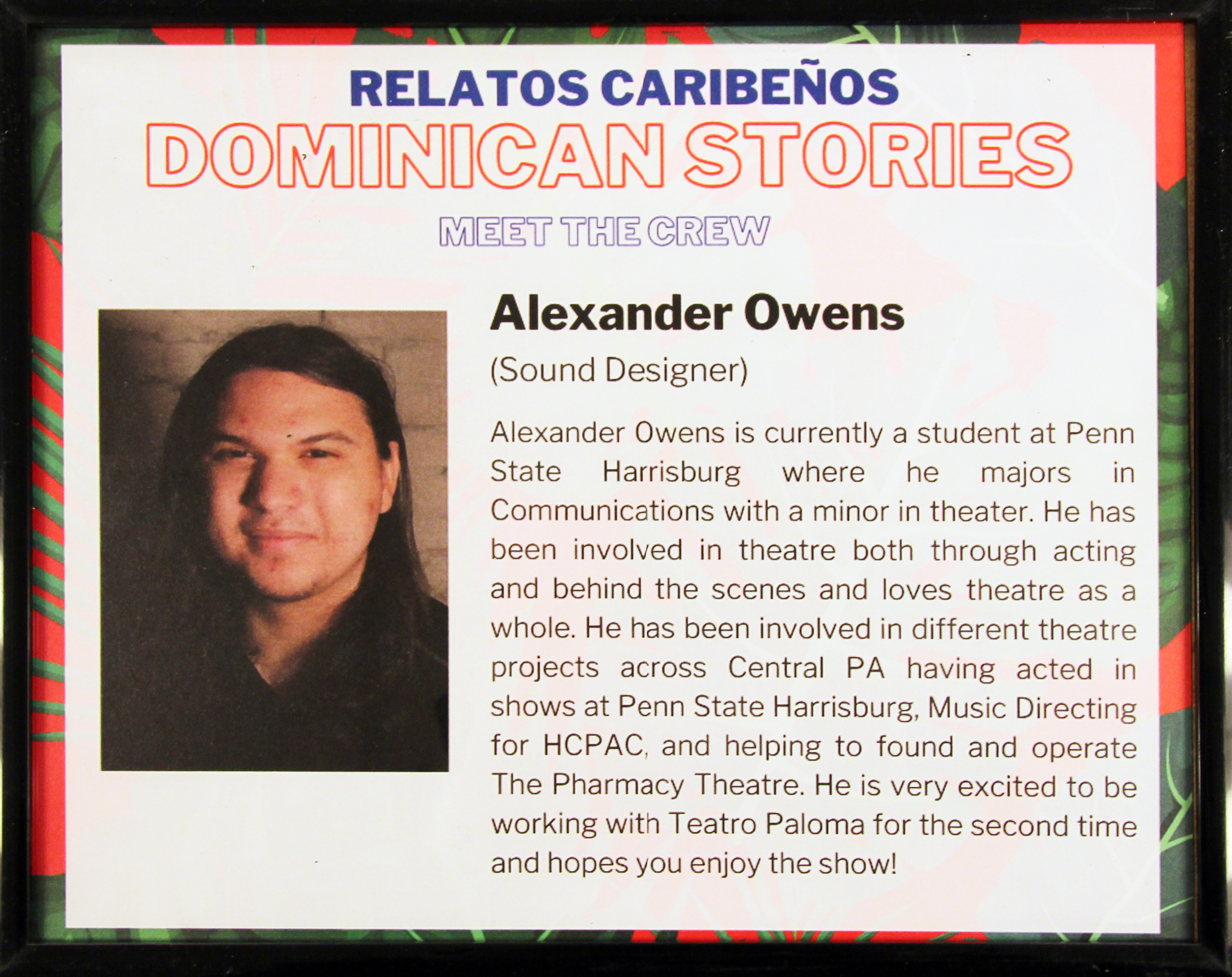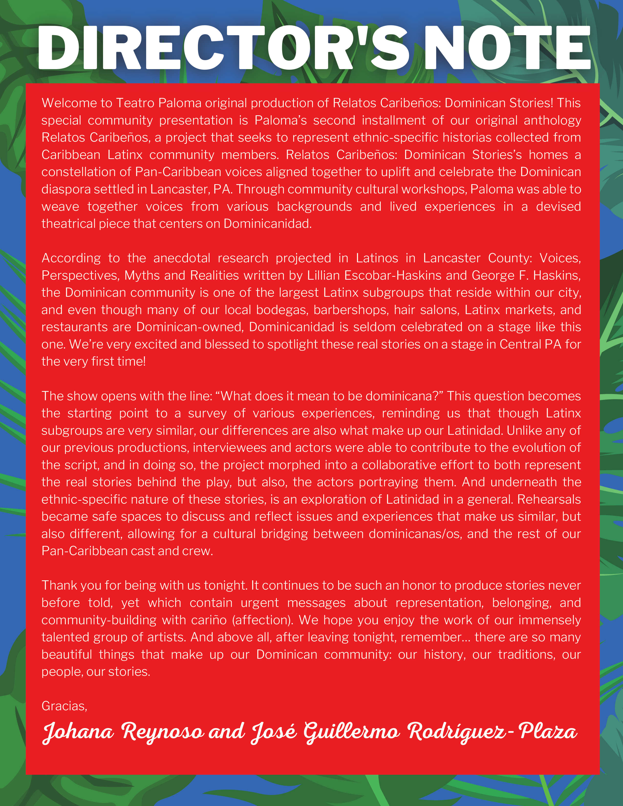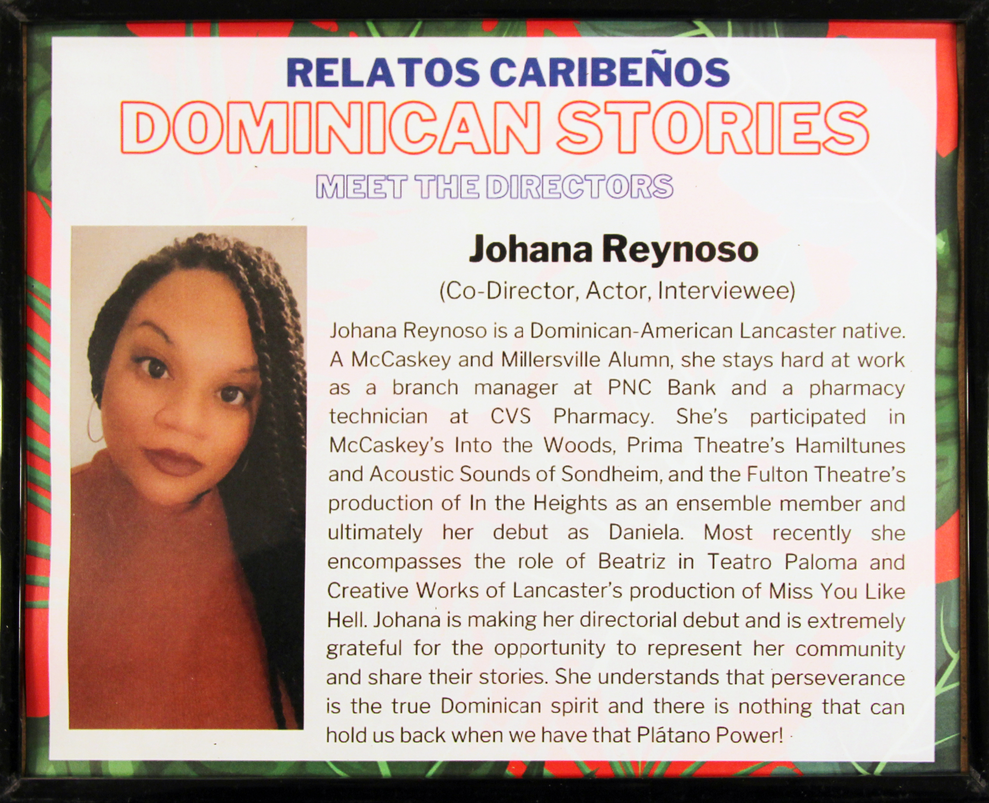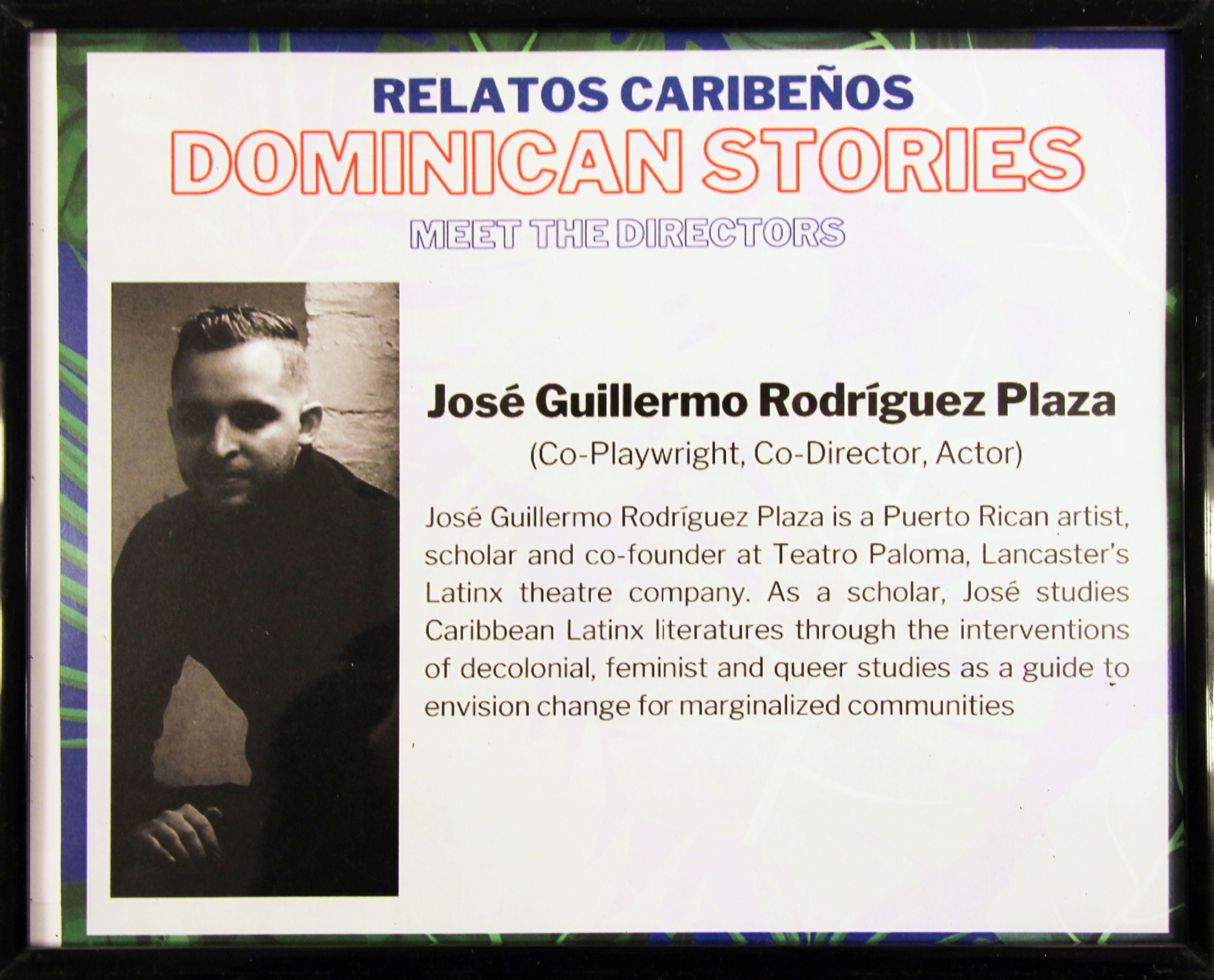 For our second phase of the project, we conducted interviews with intergenerational Dominican and Dominican-American local residents and presented their stories through theater. By doing so, we worked on relating these cultural and ethnic-specific stories to Lancaster audiences, while also promoting a safe-space to build cultural bridges among cast and crew members through a discussion-based rehearsal process. During our rehearsals, actors were engaged in conversations about these relatos (narrated stories), and were encouraged to establish personal connections with them, through relating their own personal experiences. Actors also had the power to change the script based on linguistic accommodations and to meet cultural-specific needs. Relatos Caribeños: Dominican Stories is the second installment of Relatos Caribeños, an ongoing community project that seeks to collect and justly archive “relatos”—or stories—from local Caribbean Latinx voices to produce ethnic and cultural-specific theater. Our first installment was Relatos Caribeños: Puerto Rican Stories in 2017.