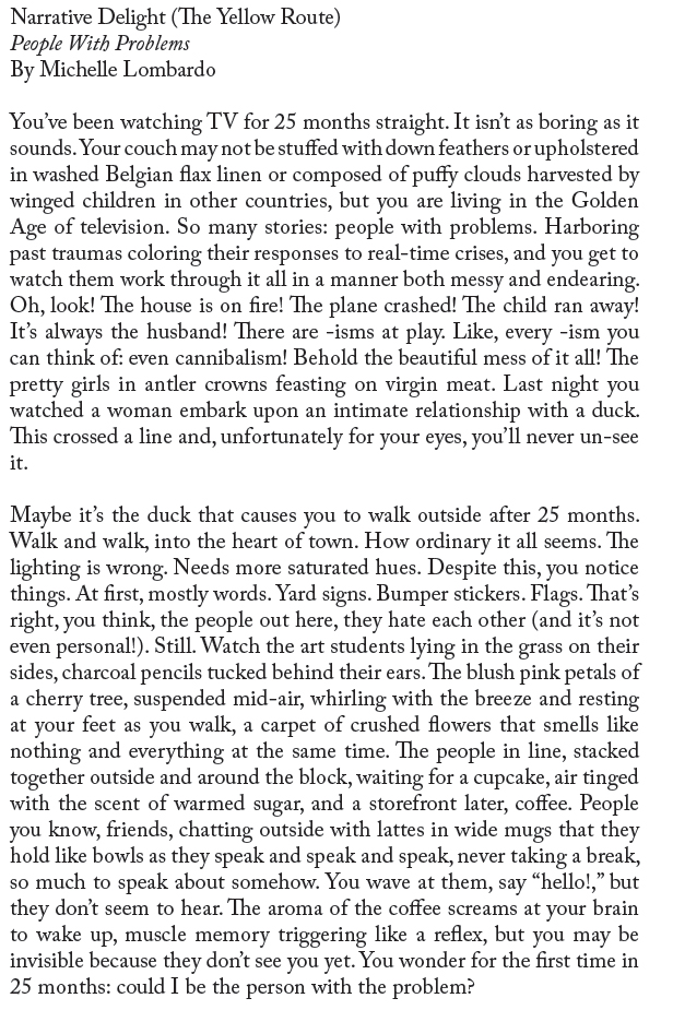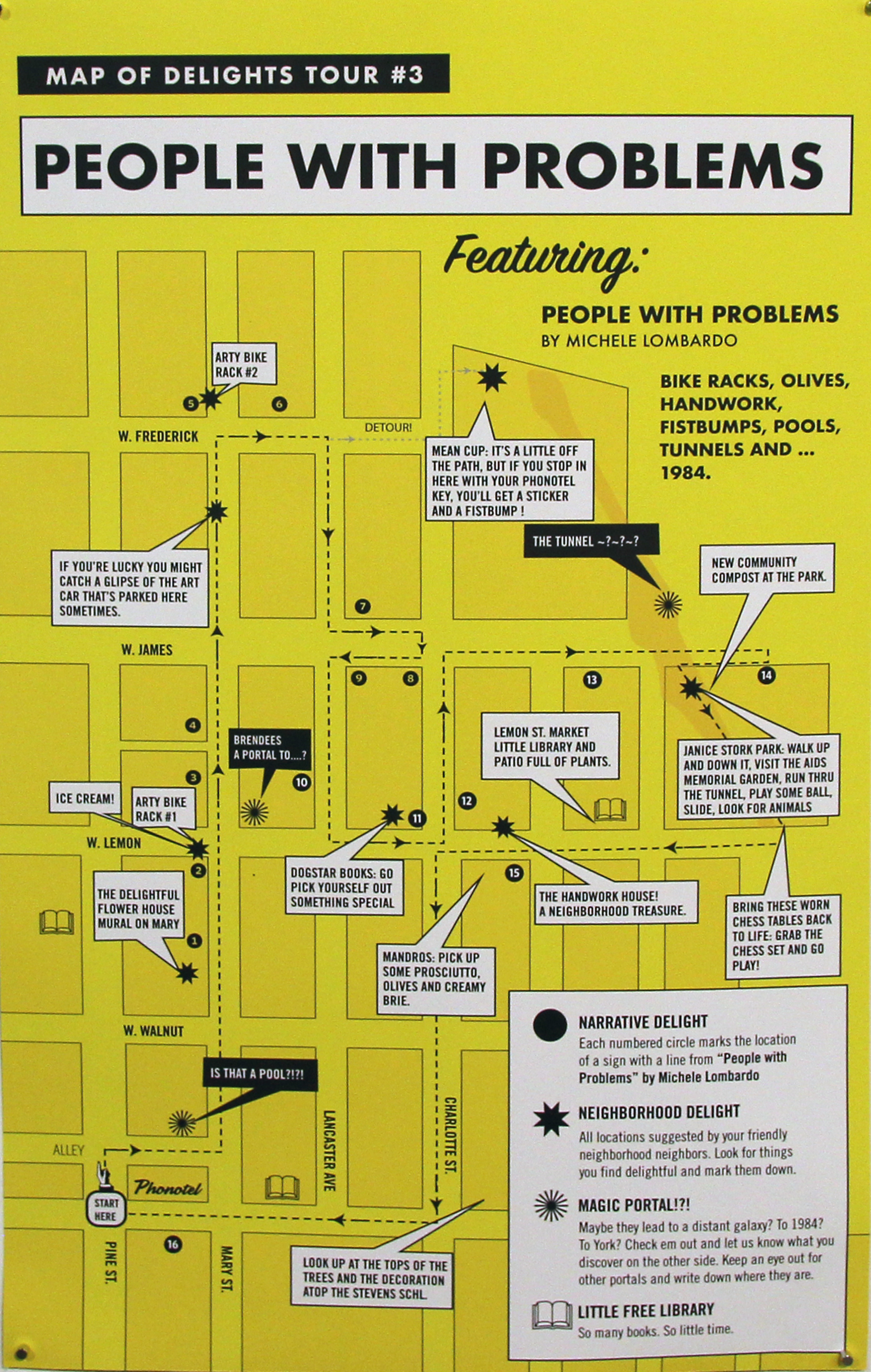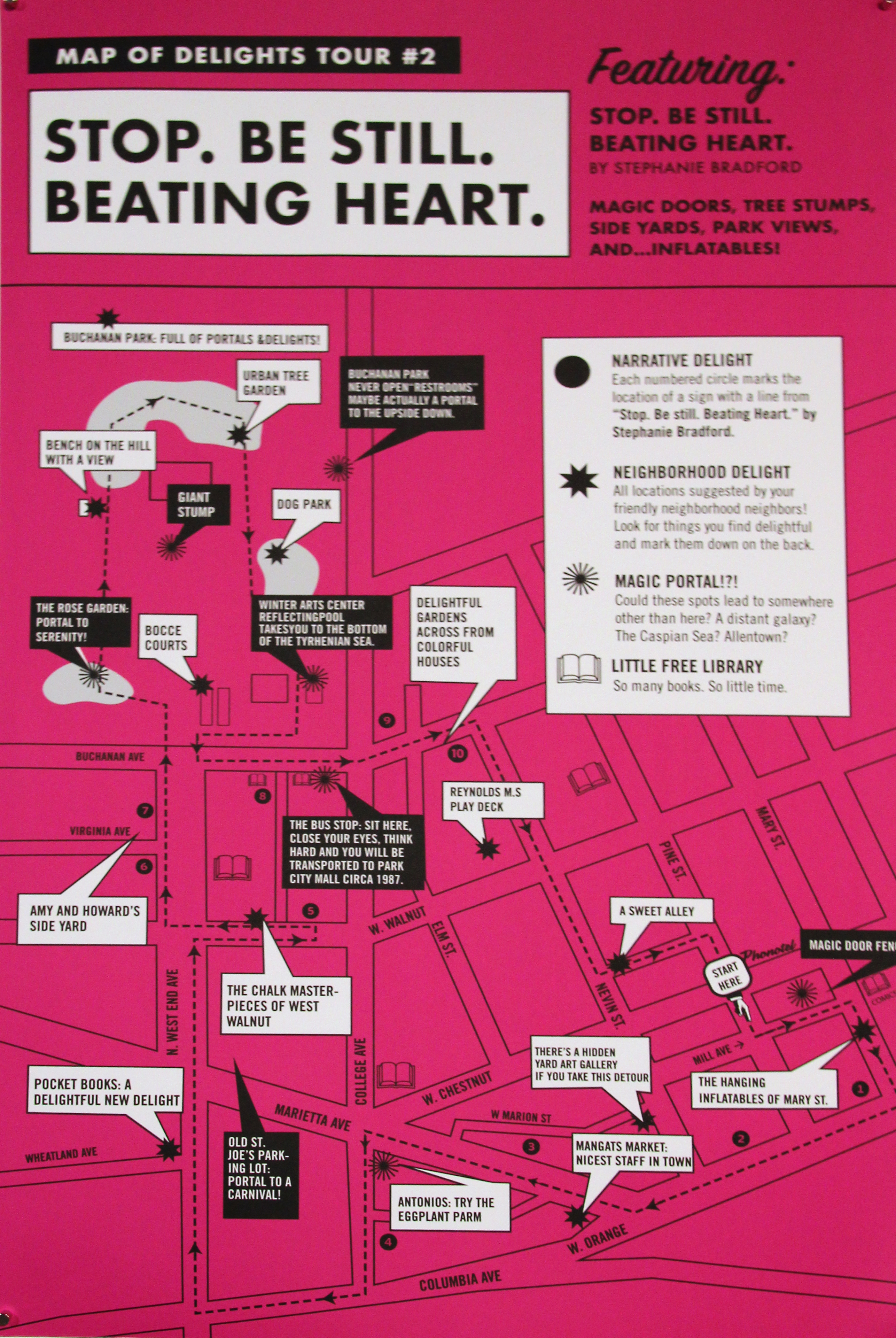 Each map also contains a tour of “Narrative Delights”— microfiction and poetry commissioned by three local writers. I divided each of the three pieces into individual lines, printed each line on a yard sign, then asked neighbors along a route to put one of the signs in their yard, window, or on their porch. Participants could then follow a map that led them from one sign to another along a path in order to read the whole piece.
