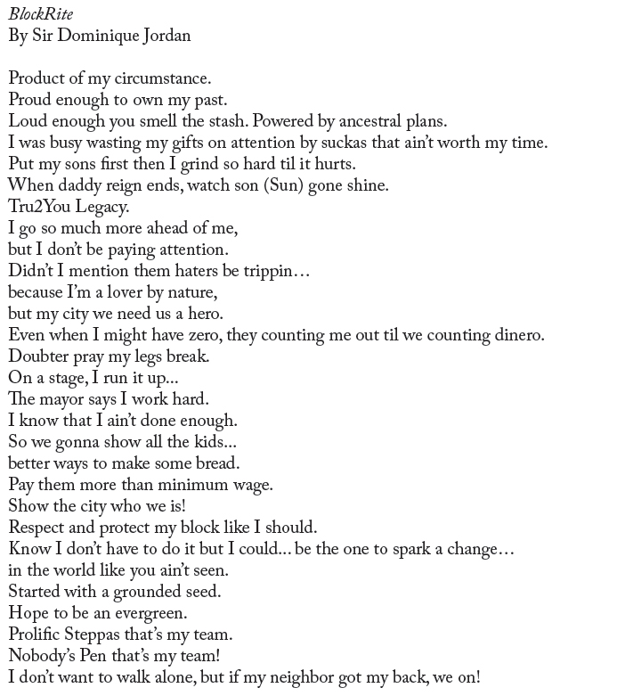 Sir Dominique Jordan, the Prolific One, is a poetic vanguard hailing from Lancaster, Pennsylvania; whether spoken word or on a page, he uses his unique verbiage to inspire others to use their vulnerability as a ‘super power’. He identifies as an “Artivist”, and teaches across the country about how Hip Hop culture and general creative expression are tools that can be used in the classroom and within neighborhoods to enhance the overall educational experience. He is also the founder and CEO of The Artivist Corp. and the Nobody’s Pen writers’ collective.