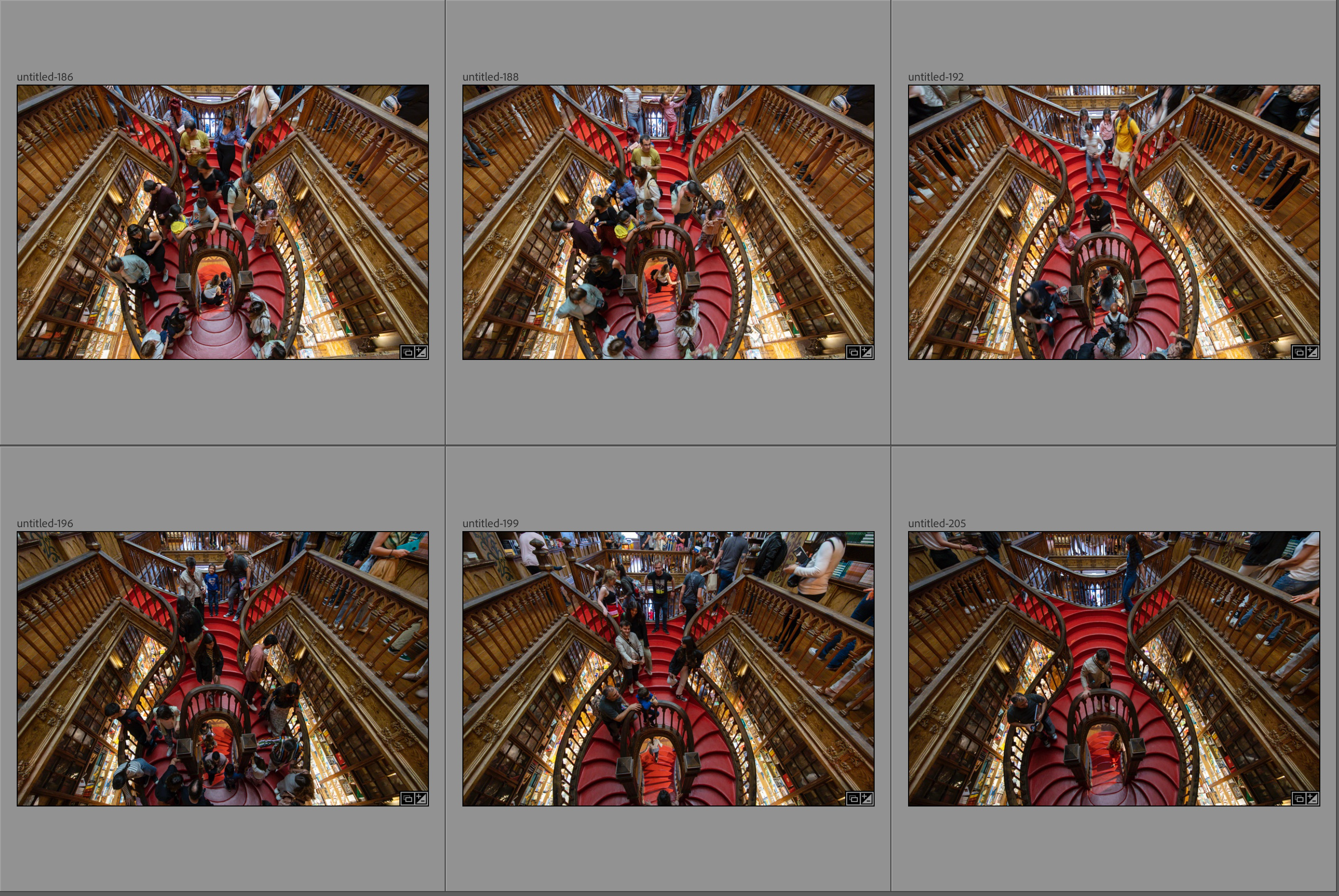 The bookstore is always packed to the gills, so I took a series of photos from the 2nd floor aiming down at the staircase, holding my camera as still as I could. There are no tripods allowed, and in this case, with good reason – it's a mob-scene in there - you can barely move. Anyway, I take a shot, wait 10 or 15 seconds, take another shot and so on, and hoping that people keep moving down the stairs and don't stop on the way up or down to take selfies.