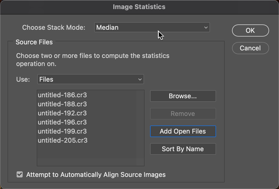 THE PHOTOSHOP PART: If everybody keeps moving, you can open all these photos into Photoshop, then go under the File Menu, under Scripts and choose "Statistics." When the Statistics window appears, for "Stack Mode" at the top, choose "Median" from the pop-up menu (as shown above), then click the "Use Open Files" and click OK. Photoshop will analyze the scene and remove everything that moved in the scene. It did a pretty darn good job, but unfortunately for me, sure enough – some folks stopped to take selfies on the stairs, so there was some ghosting so I had to do a little Healing Brush and Clone Stamp work to get the empty stairs you saw earlier. So, a little camera technique and a little Photoshop magic got the job done.