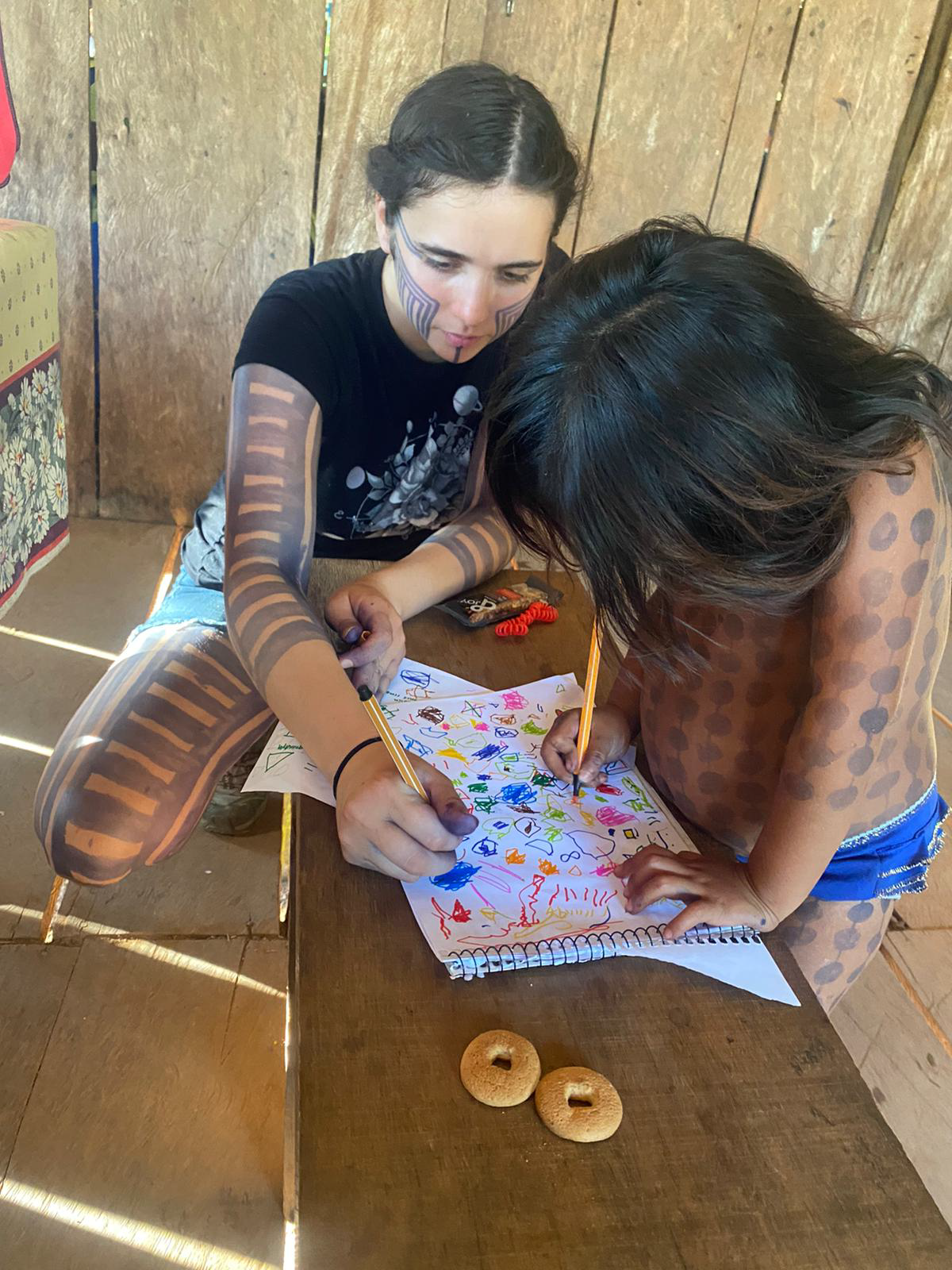 Upon our arrival in the community, we connect with community partners, who welcome us as guests in their lands. We set up our living and working spaces, where we enjoy the delicious food of the local cook (coffee and manioc crepes for breakfast shown here) and local foods freshly picked from the gardens and fished from the rivers.