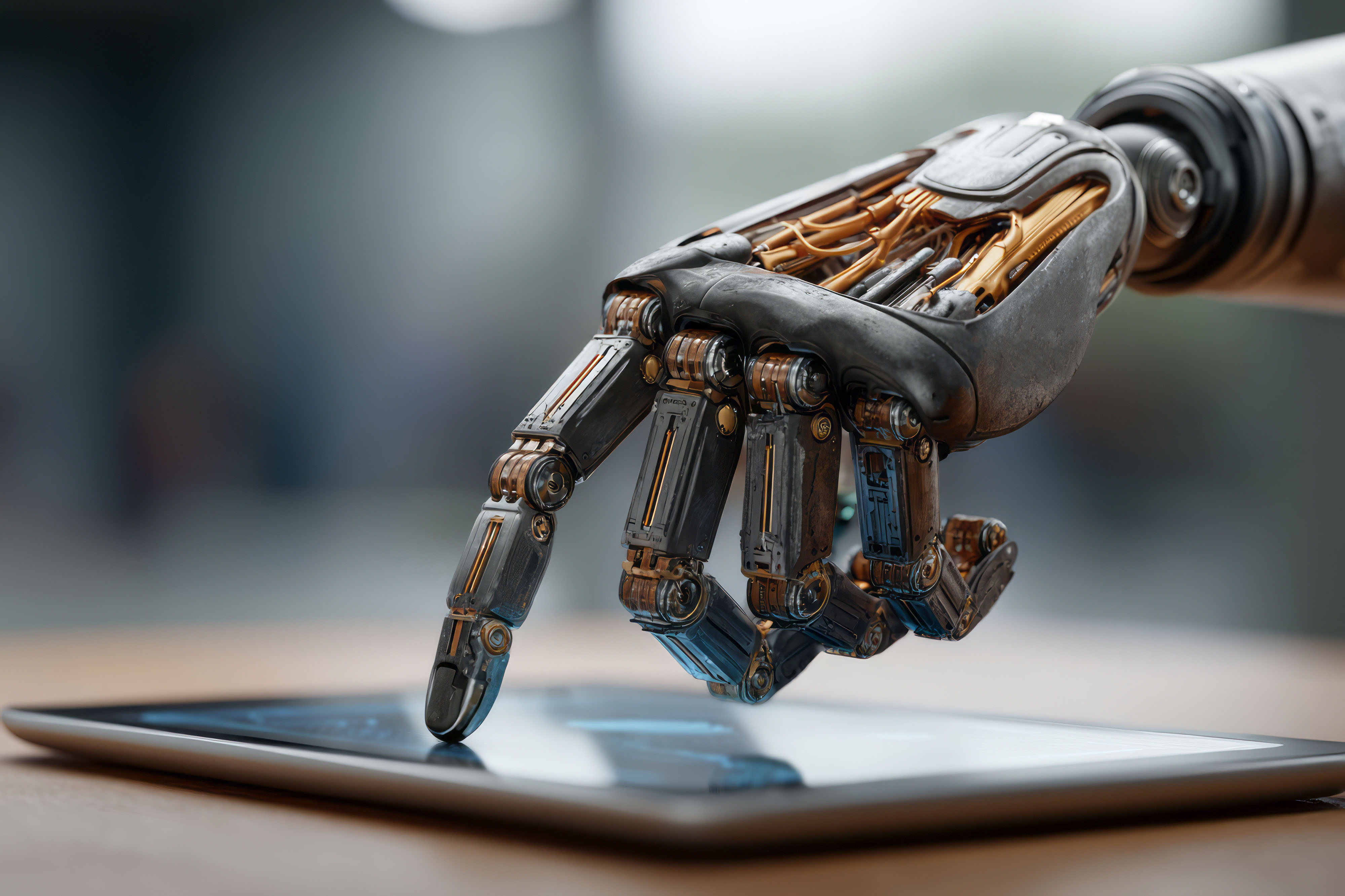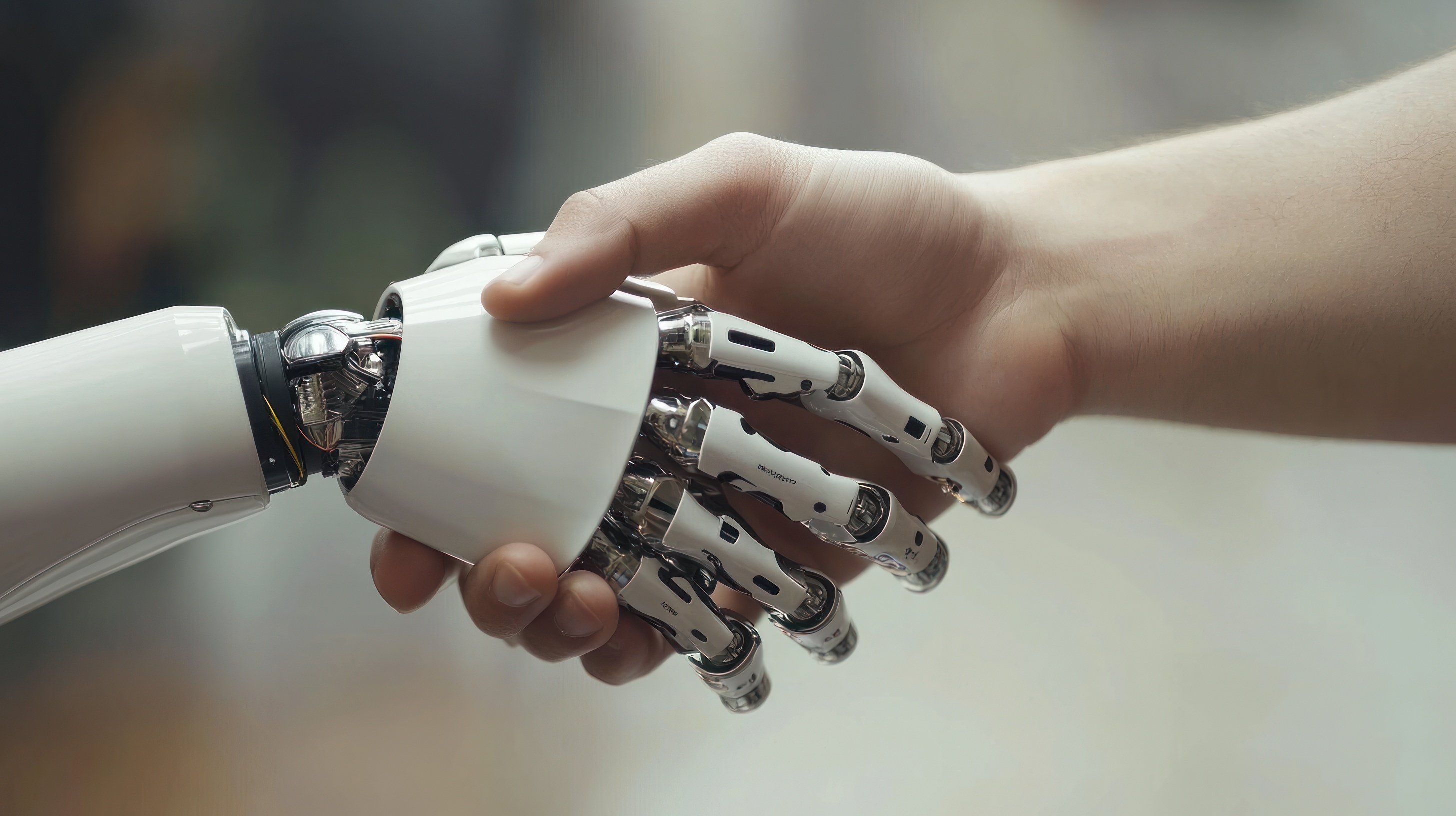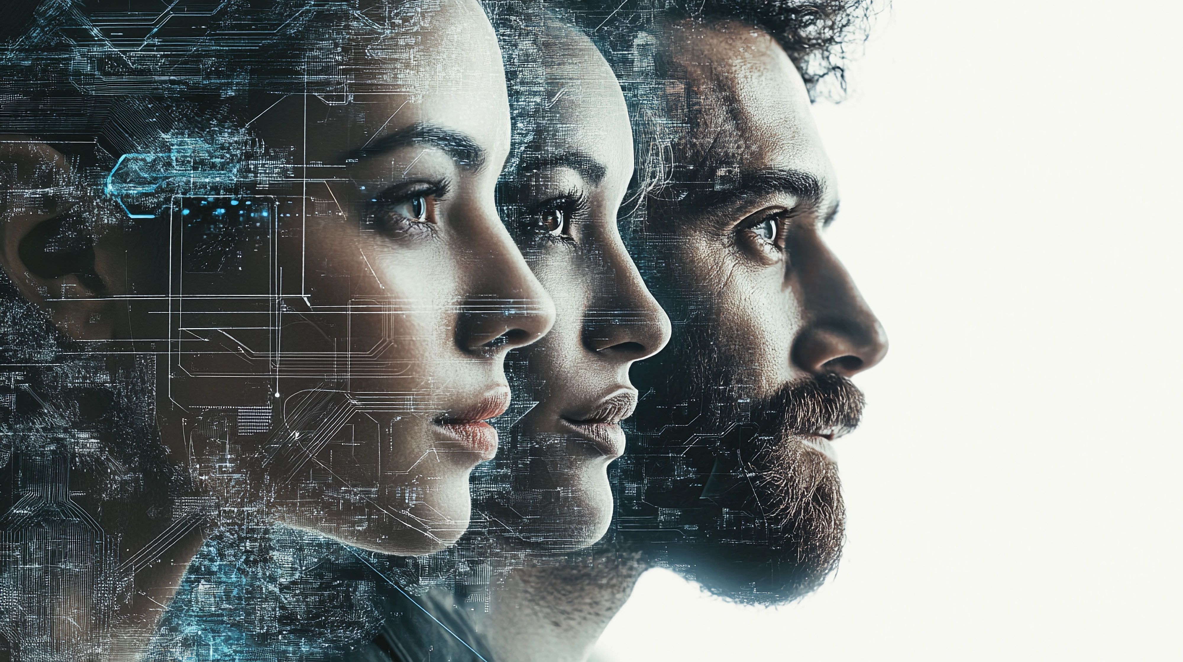 Creado con imágenes de Setia Fitra - "Artificial intelligence concept shows human face integrated with computer circuitry for futuristic technology." • thanakrit - "Futuristic Robotic Hand Interacting with Digital Tablet Touchscreen Technology" • faber14 - "Profiles of three individuals with digital overlay of technology elements. Generative AI" • Nejron Photo - "Advanced android gazing, binary code across helmet" • GoodandEvil - "Human hand shaking robot hand in technological harmony."