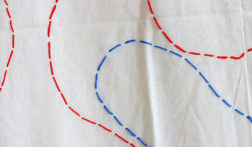 Der Rhythmus der Linie wird auch durch die verwendeten Stichformen bestimmt. Beate Oehmann arbeitet zwar akkurat, aber nicht kleinteilig, sondern mit einer gewissen Großzügigkeit und in einer einfachen Sticktechnik aus Heftstichen, Steppstichen, Kettenstichen, Knötchenstichen oder Hexenstichen.